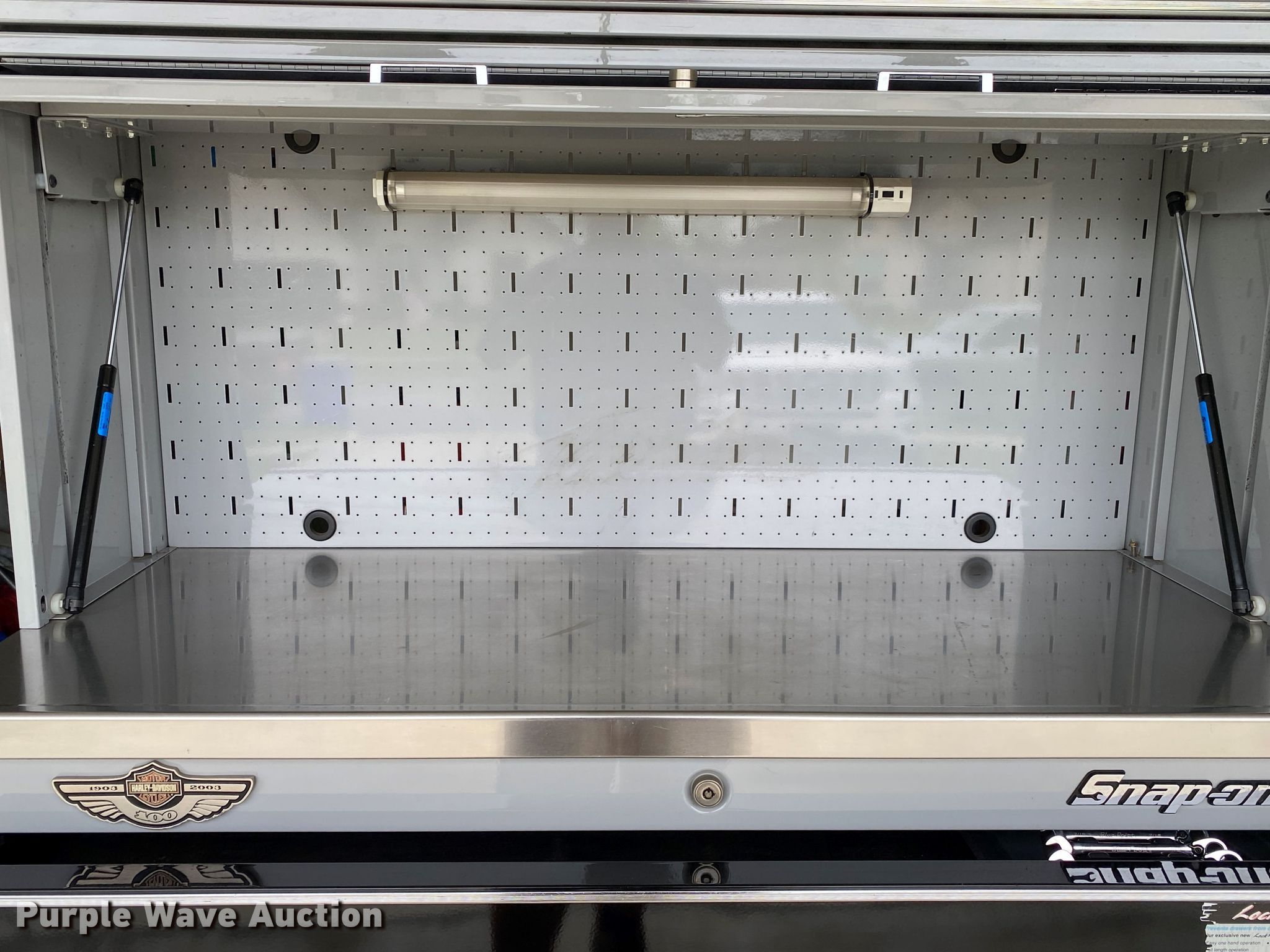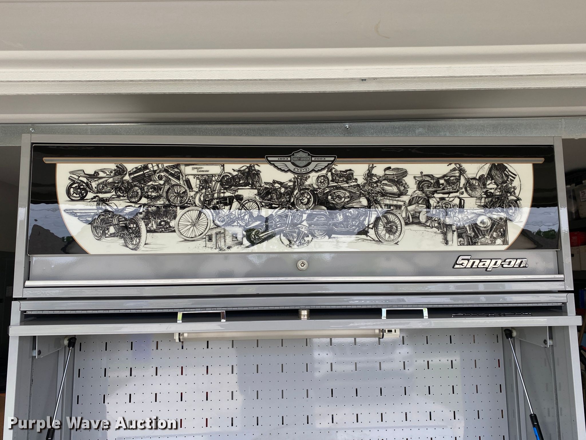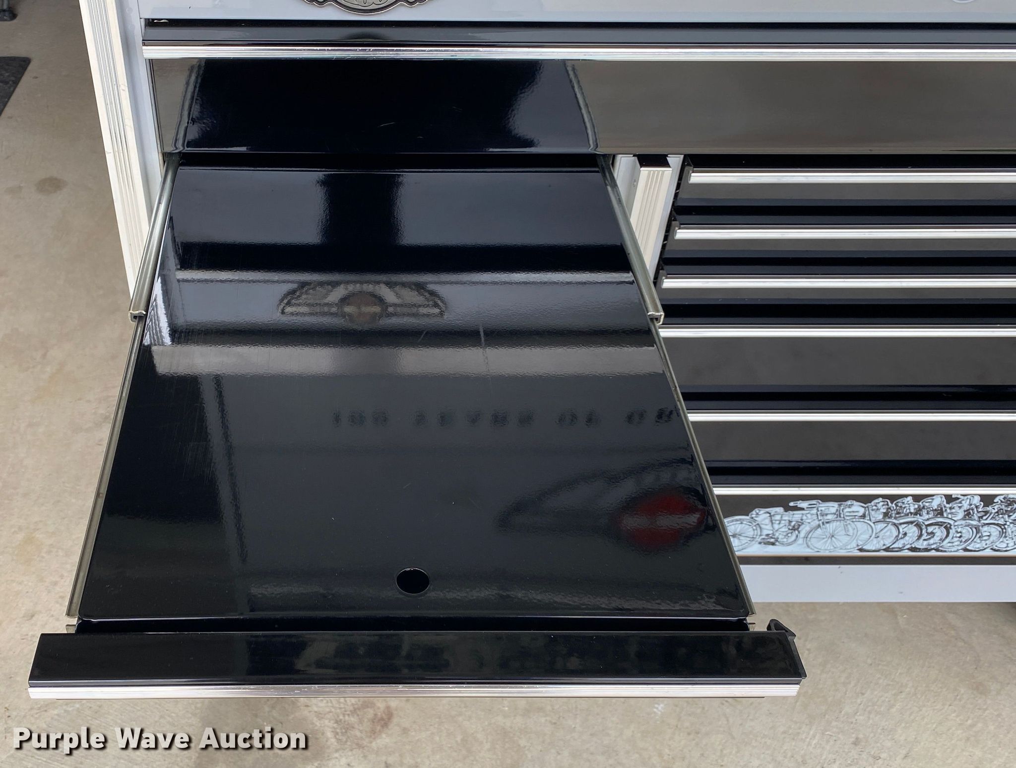 Purple Wave is selling a used Tools in Oklahoma. This item is a Snap-on Harley Davidson 100 Year toolbox with the following: 54"L x 2'W x 81"H, (11) drawers, Tools
