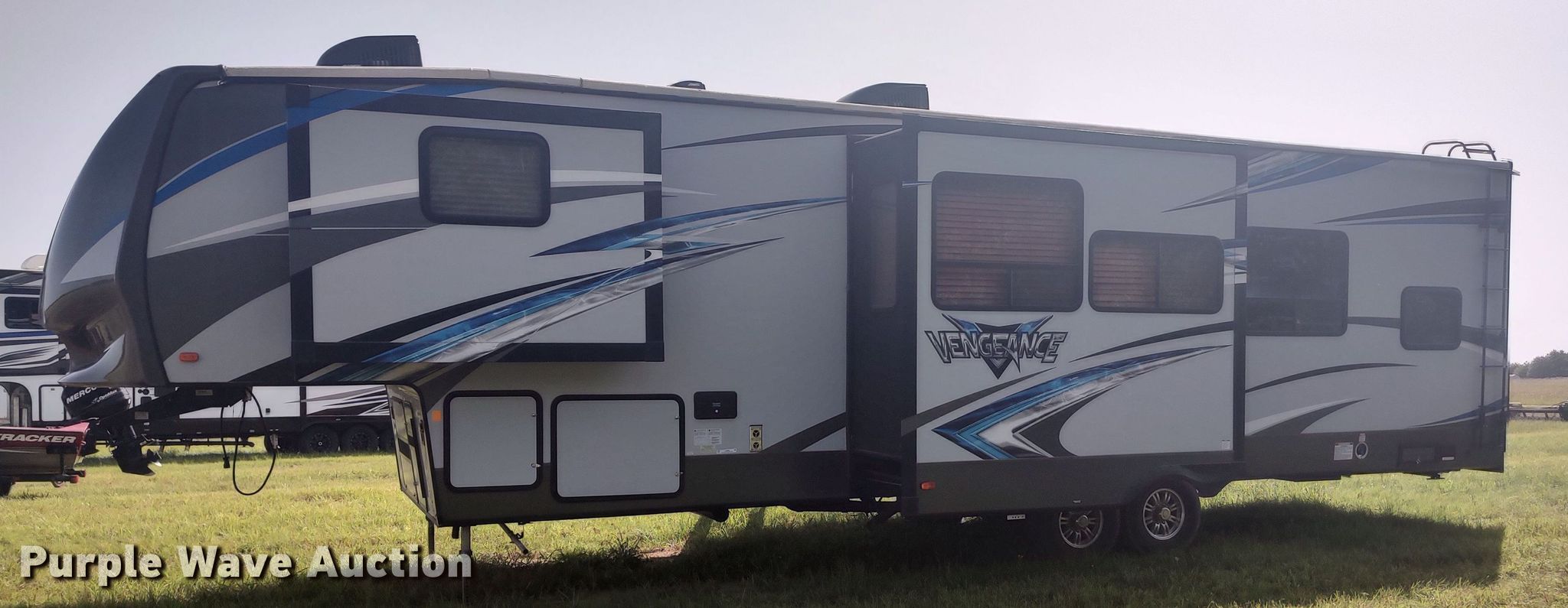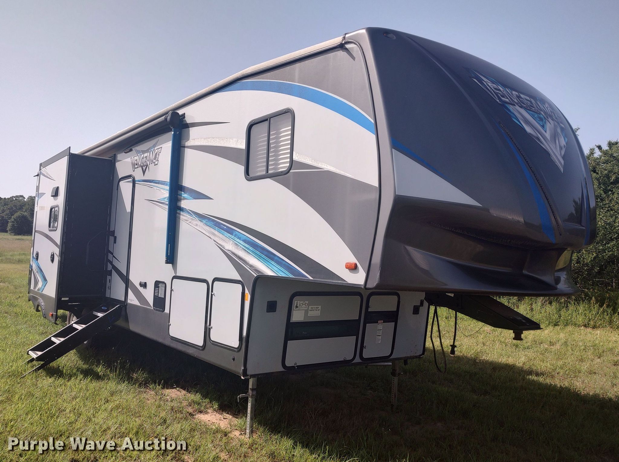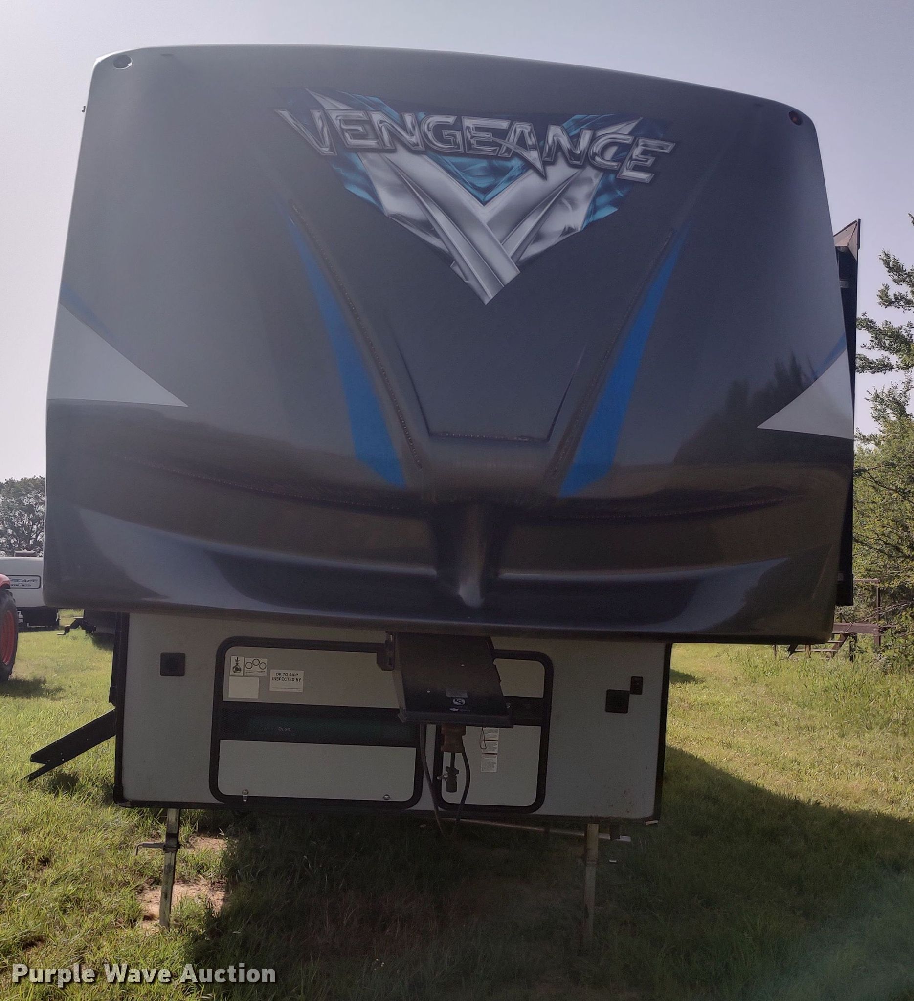 Purple Wave is selling a used RV or Camper in Oklahoma. This item is a 2018 Forrest River Vengeance toy hauler camper with the following: Camper length: 33', Toy hauler cabin: 12' L x 96" W, VIN: 4X4FVGH24JR501989, Claim #: 1-816385