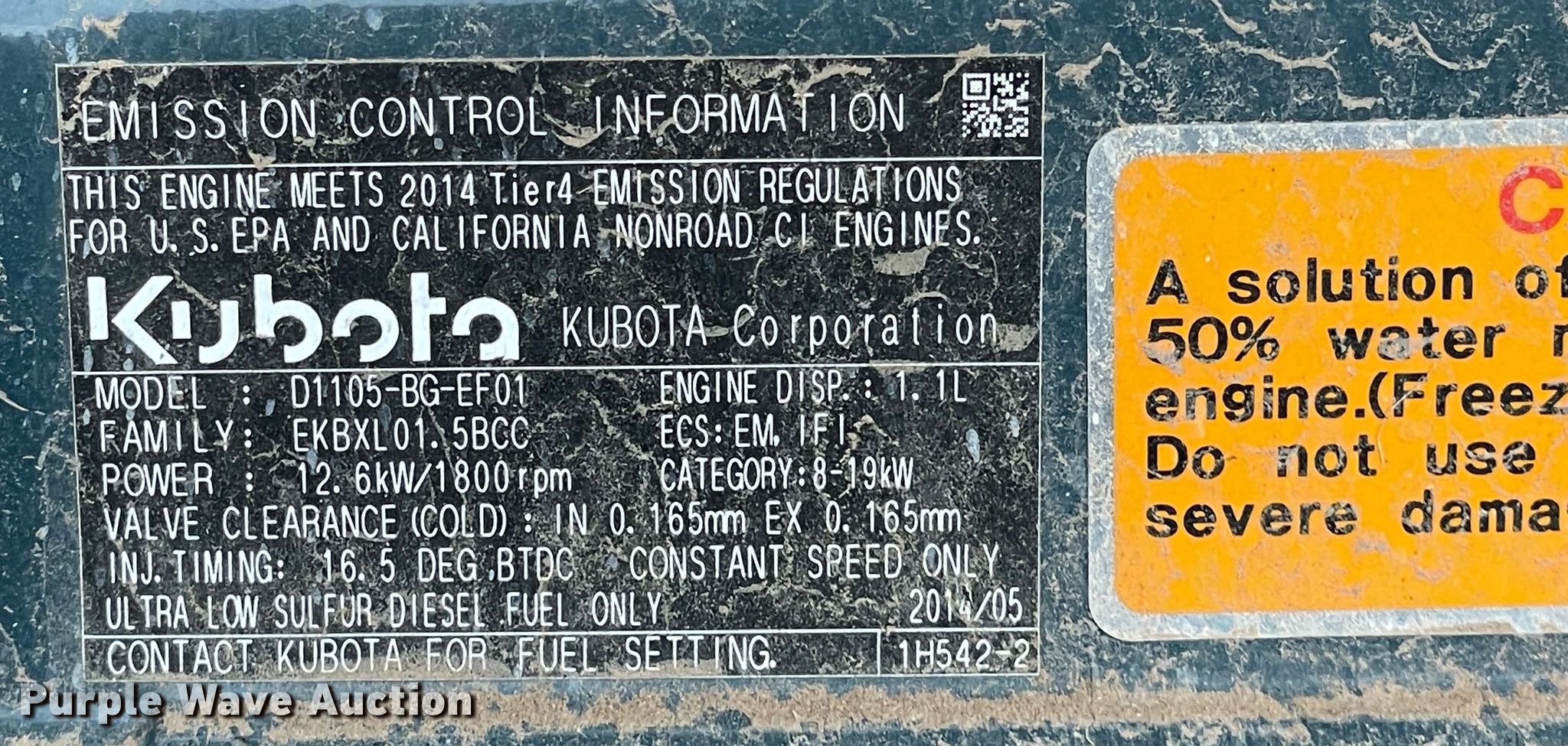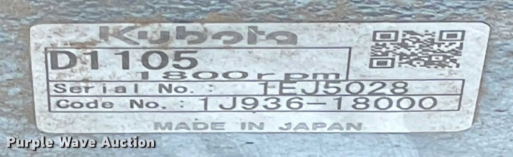 2014 Terex RL4 light plant. Hours: 4,409 on meter, VIN: 4ZJSA1414E1011502, Serial: RL414-11502. Engine Kubota D1105-BG-EF01, Serial: 1EJ5028, Displacement: 1.1L, Fuel type: Diesel. Features Generator Pancake 201CSA5411, kVA: 6, kW: 6, Phase: Single, Electric start, Fuel tank, Light plant Bulbs: 4, Hoist: Manual, Stabilizers. Trailer Ball hitch size: 2", Suspension: Spring, Axles: Single, Tire size: 175/80R13, GVWR: 1,681 lbs, GAWR: 2,000 lbs. Transfer of ownership documentation will be a bill of sale. 8825 Melfrank Dr. Amarillo, TX 79124