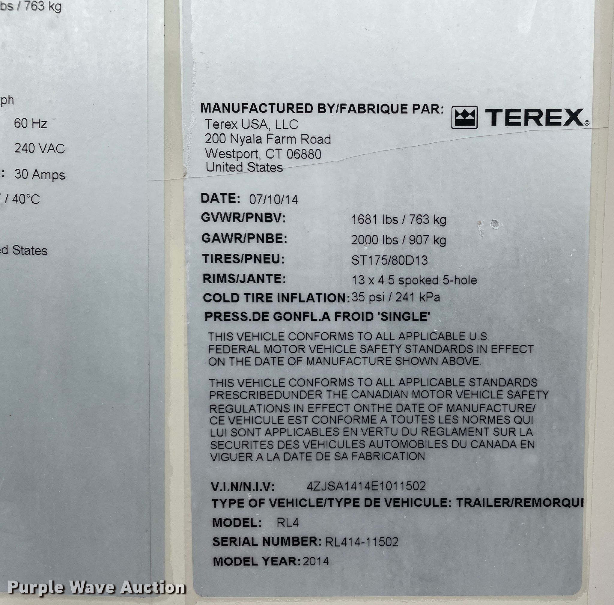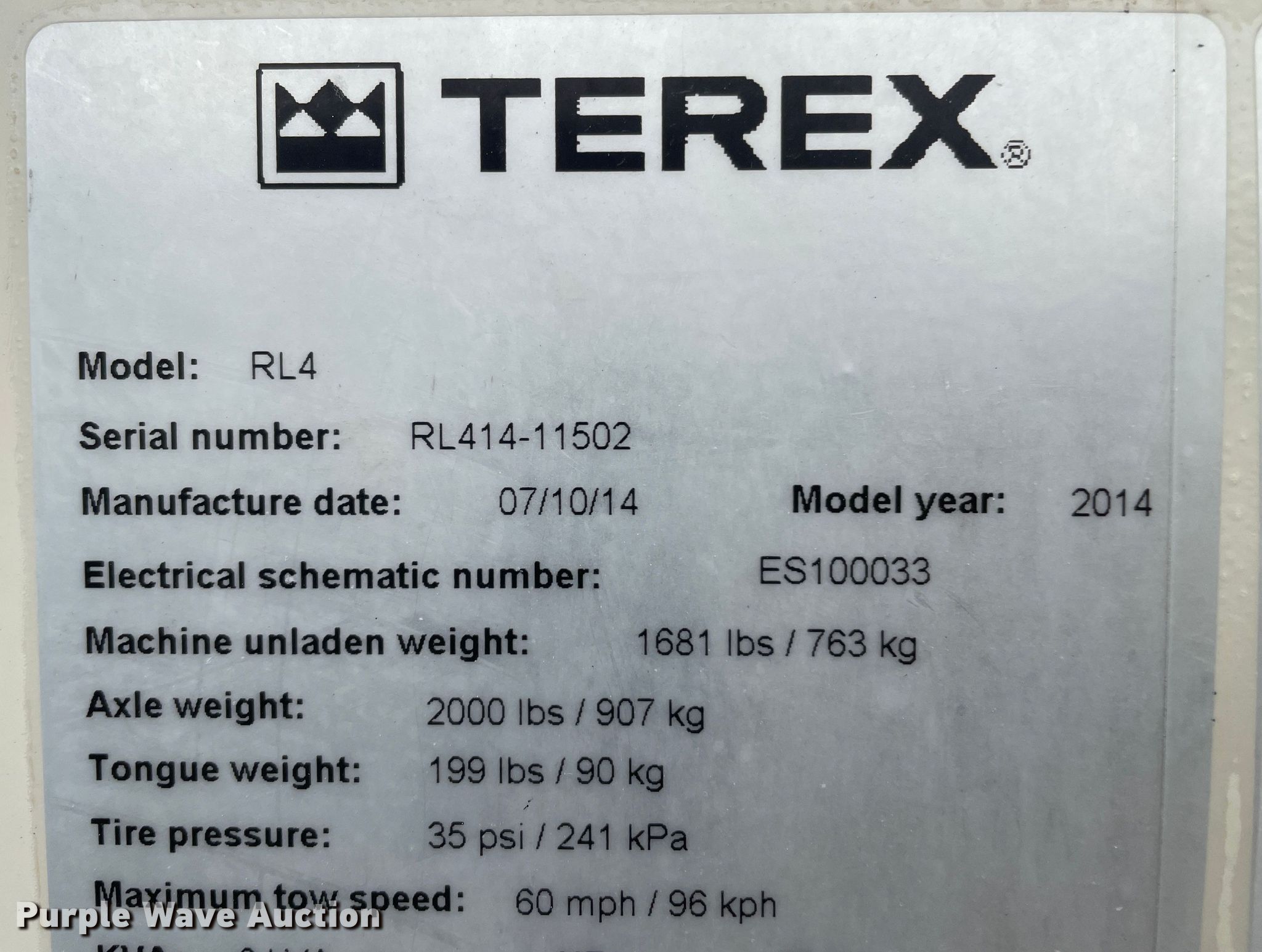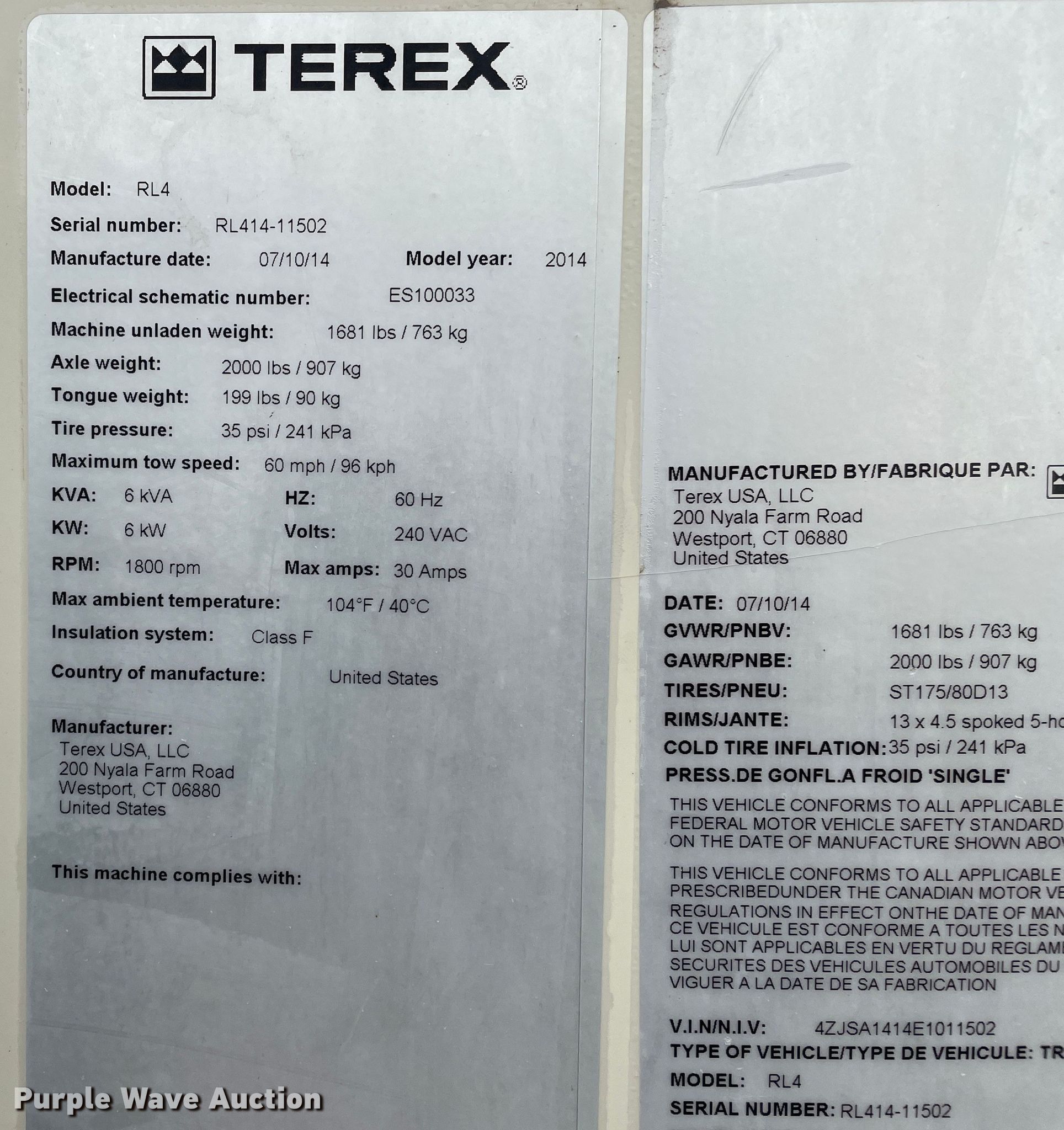 Purple Wave is selling a used Light Plant in Texas. This item is a 2014 Terex RL4 light plant with the following: Hours: 4,409 on meter, VIN: 4ZJSA1414E1011502, Serial: RL414-11502