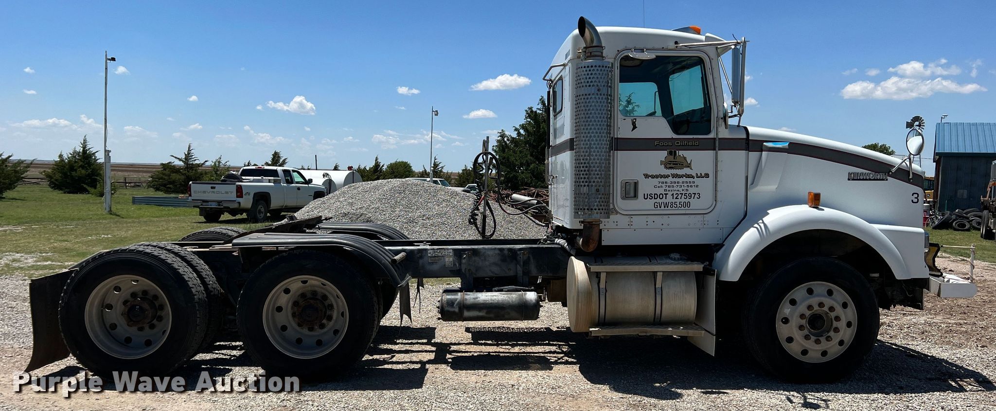 1998 Kenworth T800 semi truck. Miles: 884,132 on odometer, Miles or hours may vary, unit still in use, VIN: 1XKDDR9X6WR765314. Engine Detroit Diesel Series 60, Displacement: 12.7L, Cylinders: 6, Fuel type: Diesel. Transmission Manual, Speed: 10. Chassis Axles: Tandem, Suspension: Air, Brakes: Air, GVWR: 48,000 lbs. Interior AC, Heat, Cruise control, Air ride cab. Features Fifth wheel type: Air operated, Sliding, Fuel tank: Dual. Tires Size: 285/75R24.5. Kansas title. Foos Oilfield Tractor Works. LLC. Bazine, KS 67516