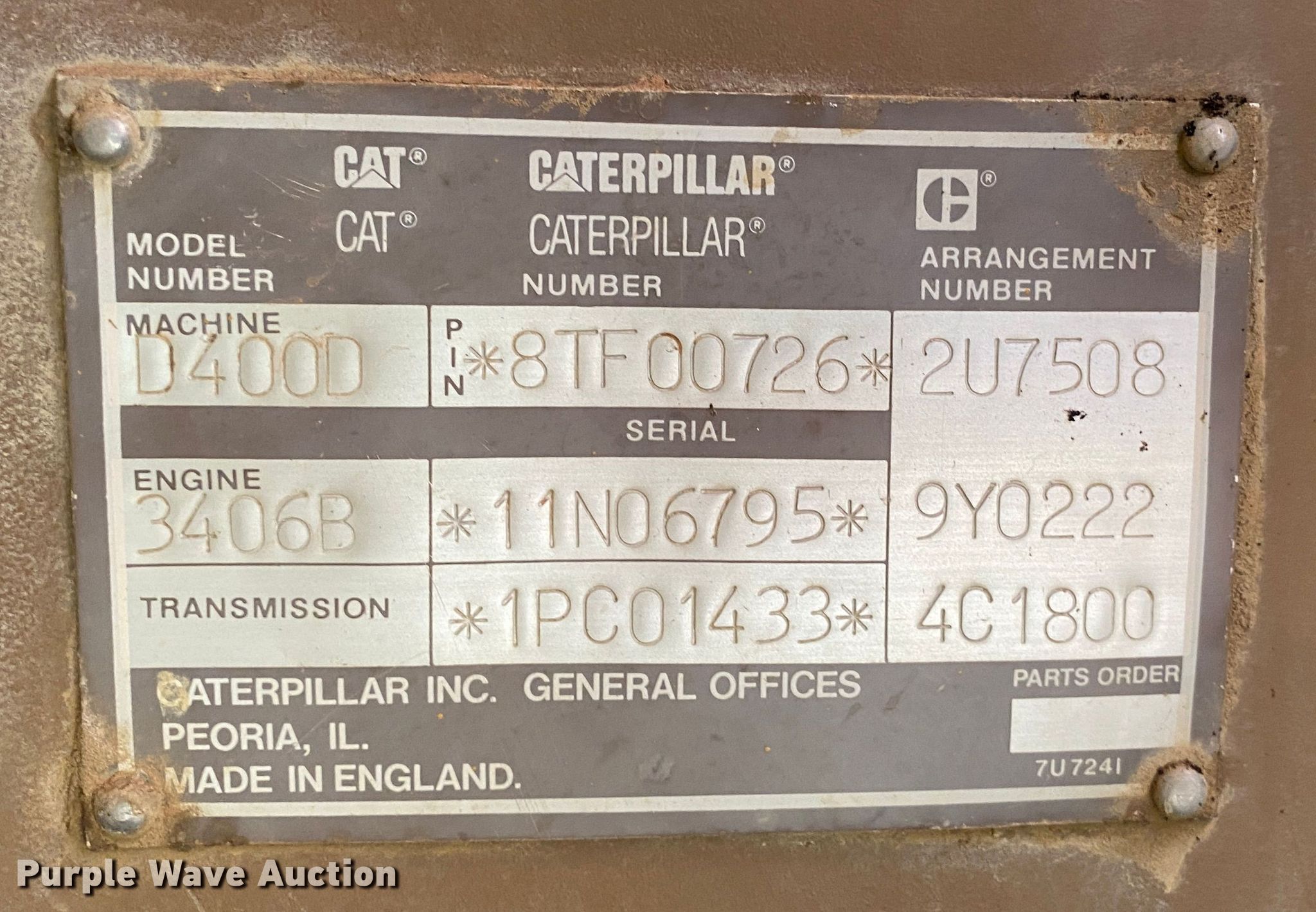Purple Wave is selling a used Articulated Haul Truck in Oklahoma. This item is a 1994 Caterpillar D400D haul truck with the following: Hours: 19,471 on meter, Serial: 8TF00726