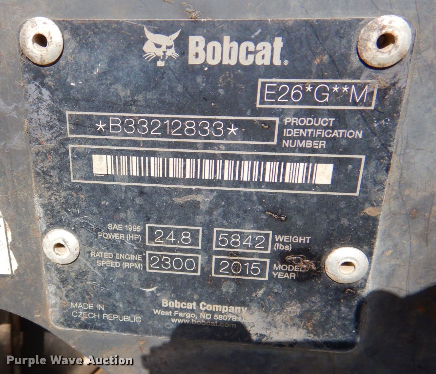 Purple Wave is selling a used Mini Excavator in Kansas. This item is a 2015 Bobcat E26 mini excavator with the following: Hours: 3,289 on meter, Serial: B33212833