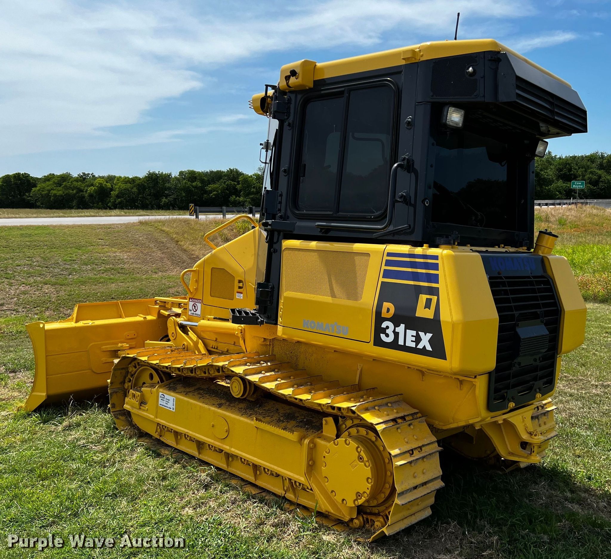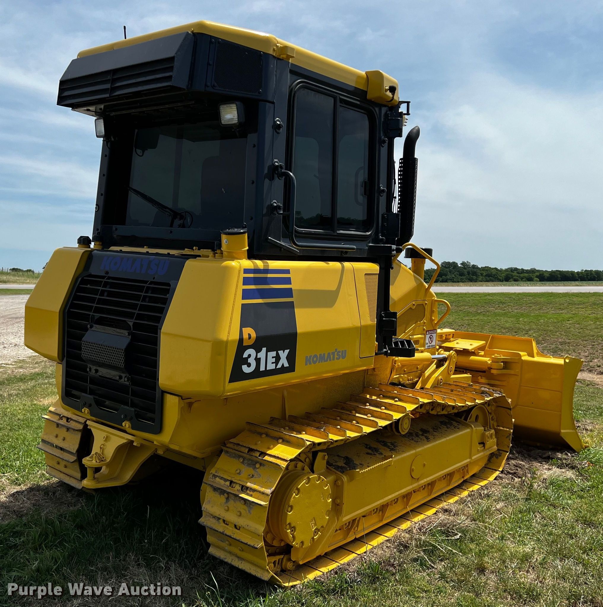 2012 Komatsu D31EX-22 dozer. Hours: 1,521 on meter, Serial: 60756. Engine Komatsu SAA4D95LE-5-A, Serial: 518233, Displacement: 3.261L, Cylinders: 4, Fuel type: Diesel, HP: 80, kW: 60. Transmission Hydrostatic. Operators station EROPS, AC, Heat. Features Dozer blade Type: 6-way, Straight, Width: 96" W. Tracks Width: 16", Grouser pads: Single, Bottom rollers: 6. View repairs. 4491 US Highway 77. Chilton, TX 76632
