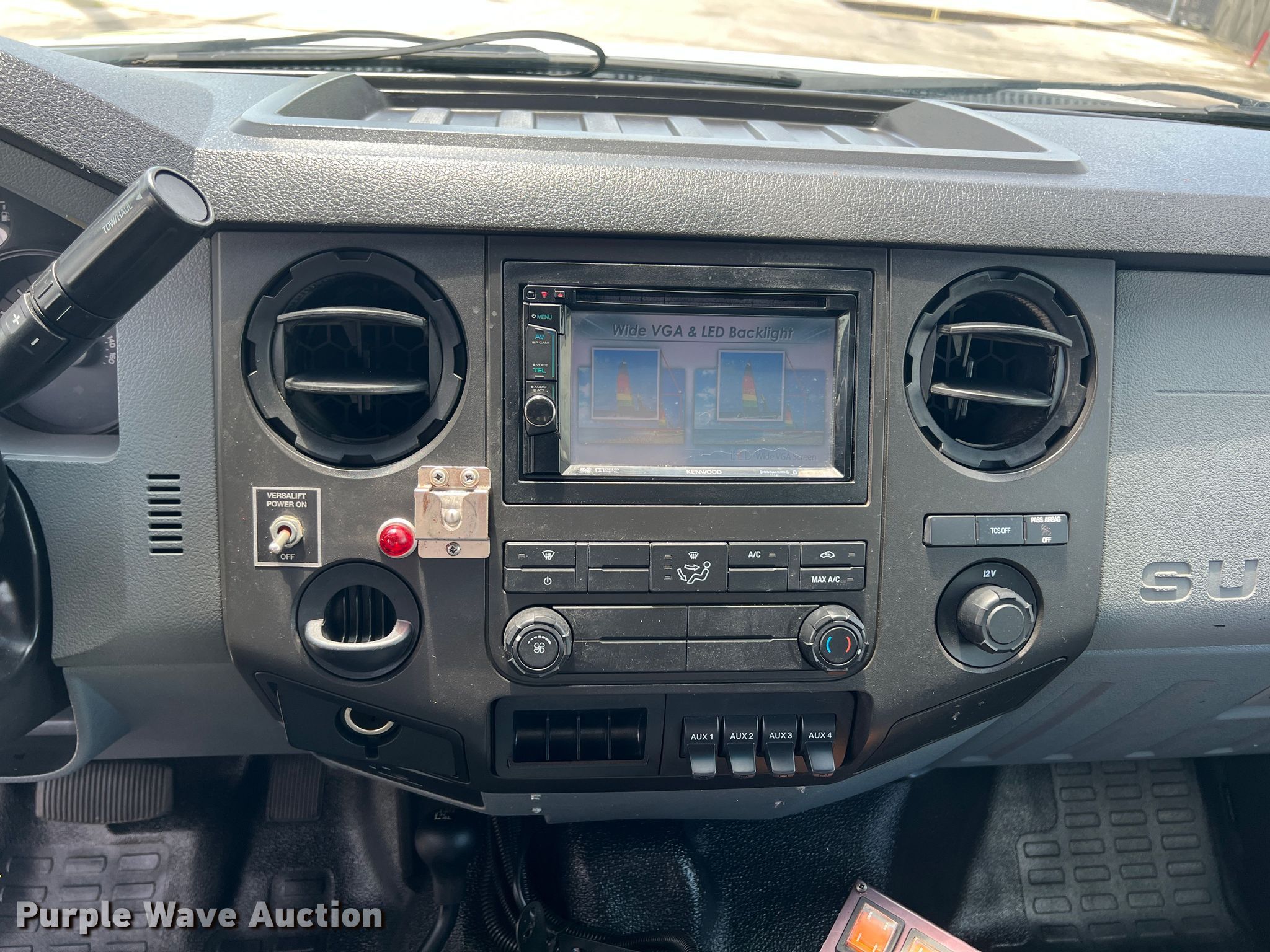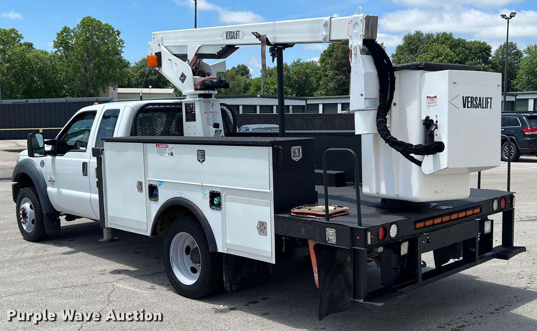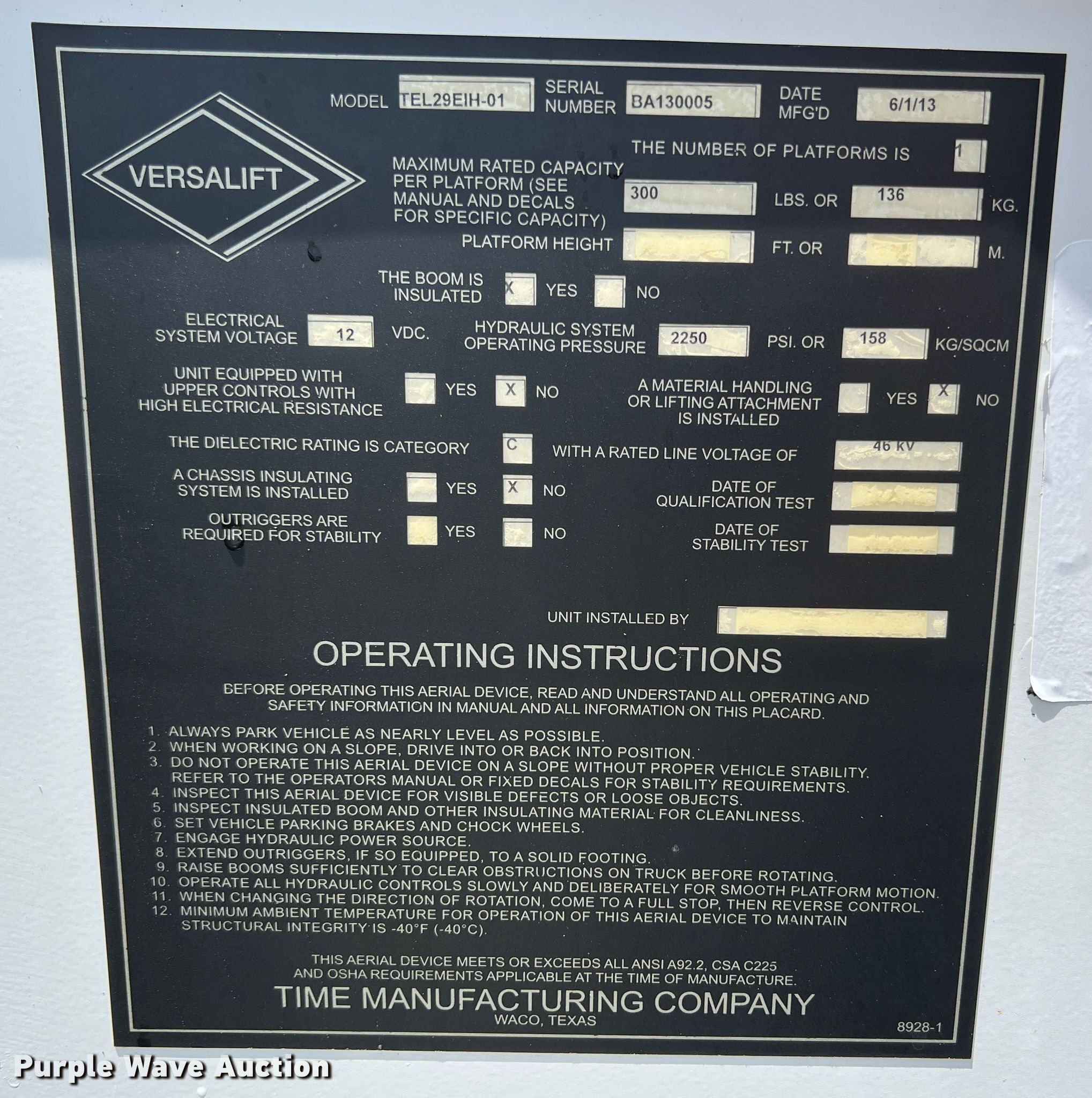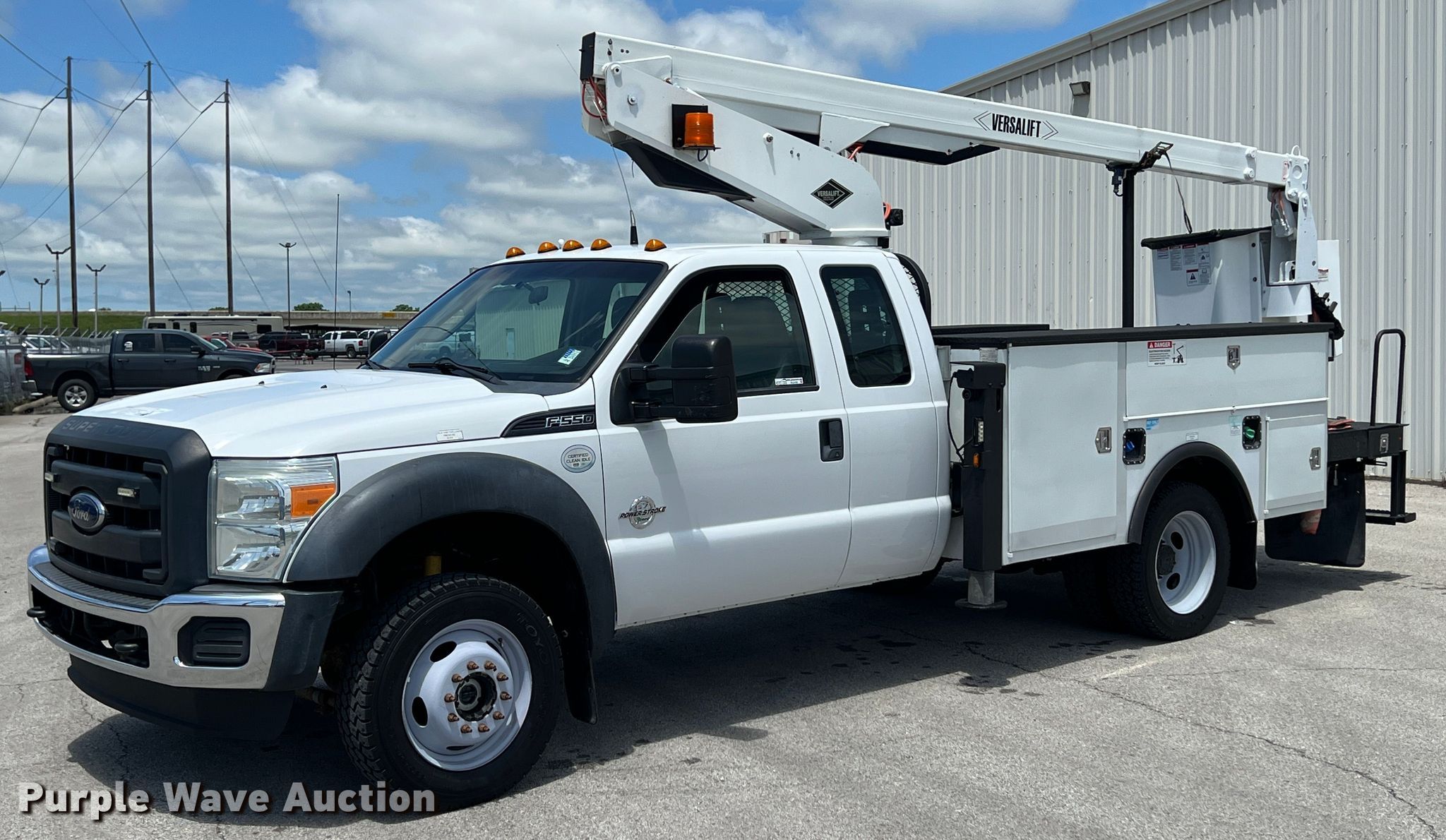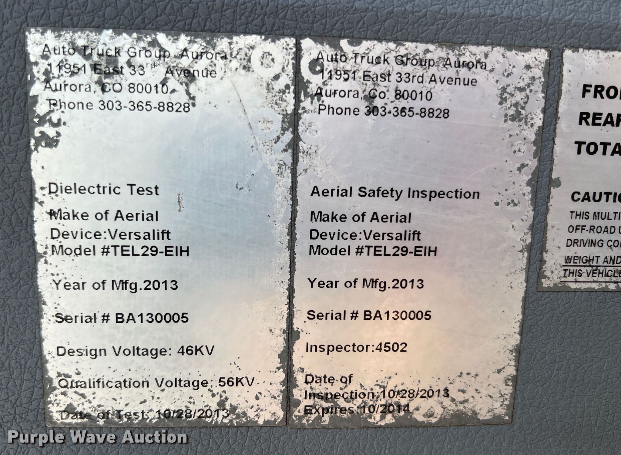 2013 Ford F550 Super Duty bucket truck. Miles: 170,976 on odometer, VIN: 1FD0X5HT0DEA64986. Engine Displacement: 6.7L, Cylinders: 8, Fuel type: Diesel. Transmission Automatic. Chassis Four wheel drive, Axles: Single, Suspension: Spring, Brakes: Hydraulic, PTO. Interior AC, Heat, Cruise control, Auxiliary controls. Features Bed Dakota Bodies 108-SB, Serial: DB16402, 12' L x 7' 10" W, Boom 2013 Versalift TEL29EIH-01, Serial: BA130005, Maximum lift capacity: 300 lbs, Boom type: Articulating, Insulated, Telescopic, Boom controls Ground, Platform/ basket.. Tires Size: 225/70R19.5. Oklahoma title. 13780 E 146th St N. Collinsville, OK 74021