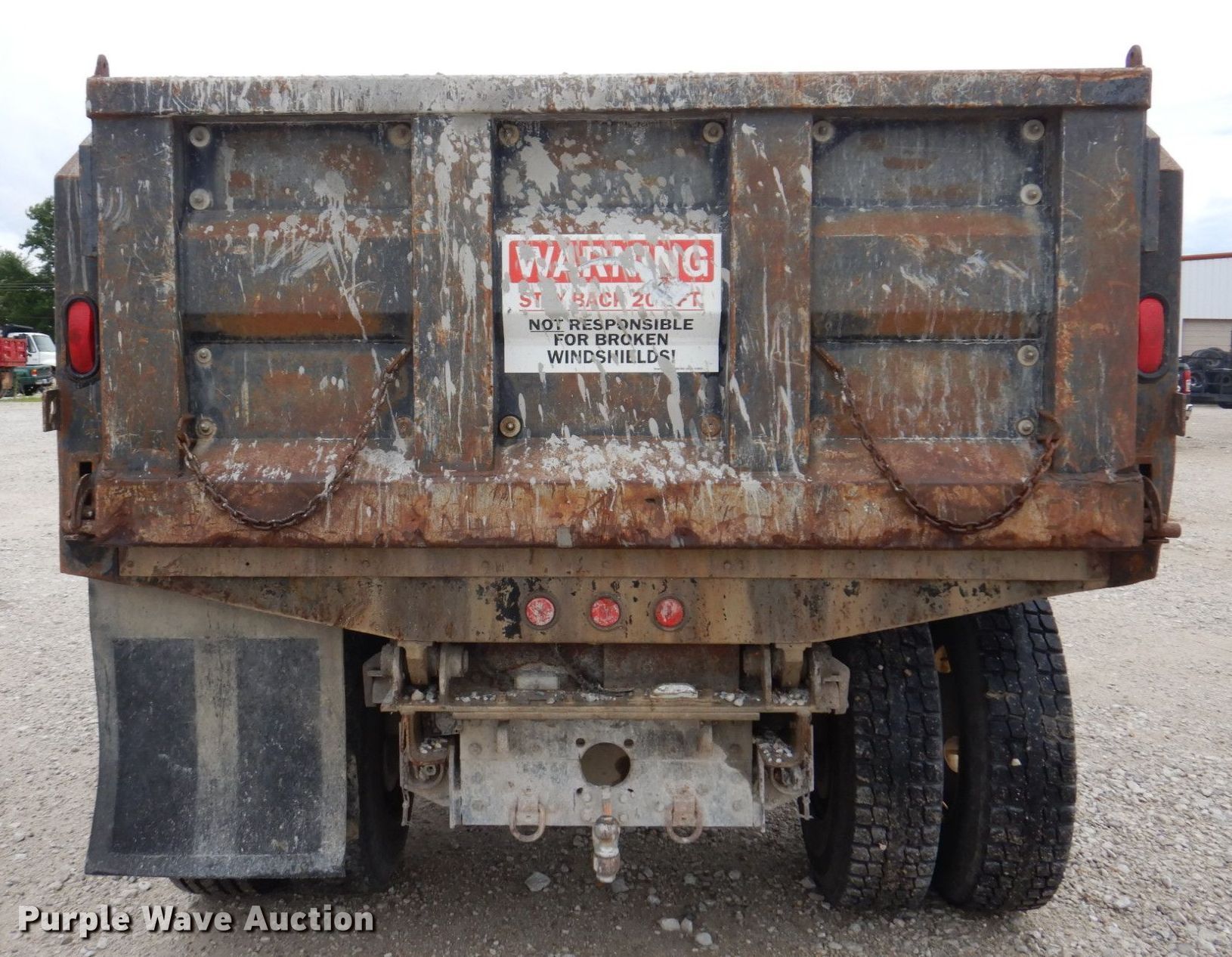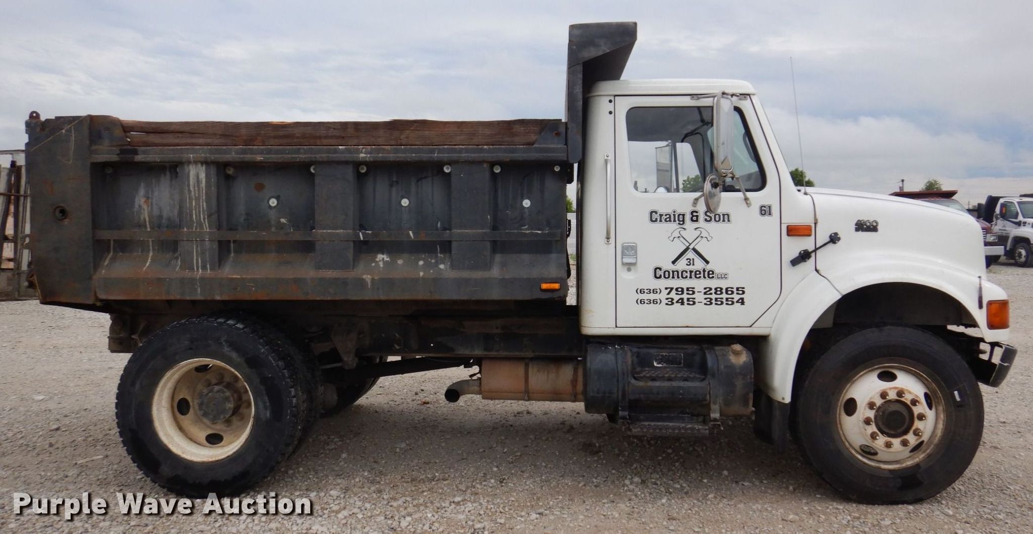 1995 International 4900 dump truck. Miles: 279,840 on odometer, Hours: 8,840 on meter, VIN: 1HTSDAAN0SH654310, Unit #: 61. Engine International DT466, Displacement: 7.6L, Cylinders: 6, Fuel type: Diesel. Transmission Automatic. Chassis Double frame, Axles: Single, Suspension: Spring, Brakes: Air, PTO. Interior Heat. Features Dump bed 10' L x 95" W, Side height: 34", Side board height: 12", Bed type: Steel, Ram: Single , End gate: Manual. Tires Size: 11R22.5. Missouri title. Craig and Son Concrete. 585 Edinger Rd. Wentzville, MO 63385