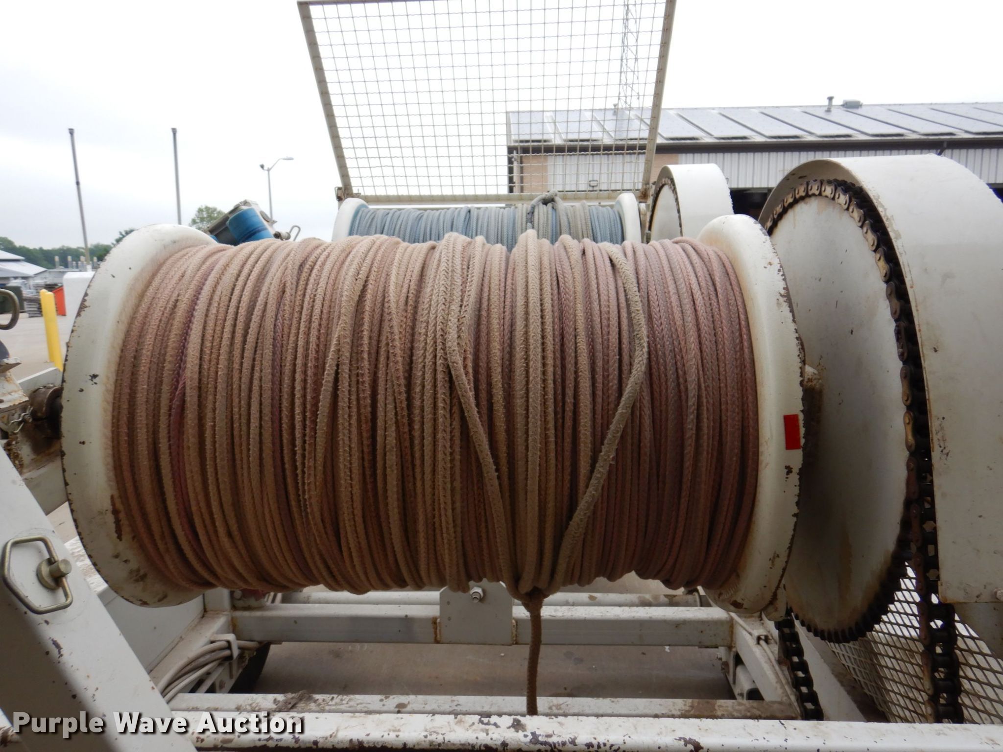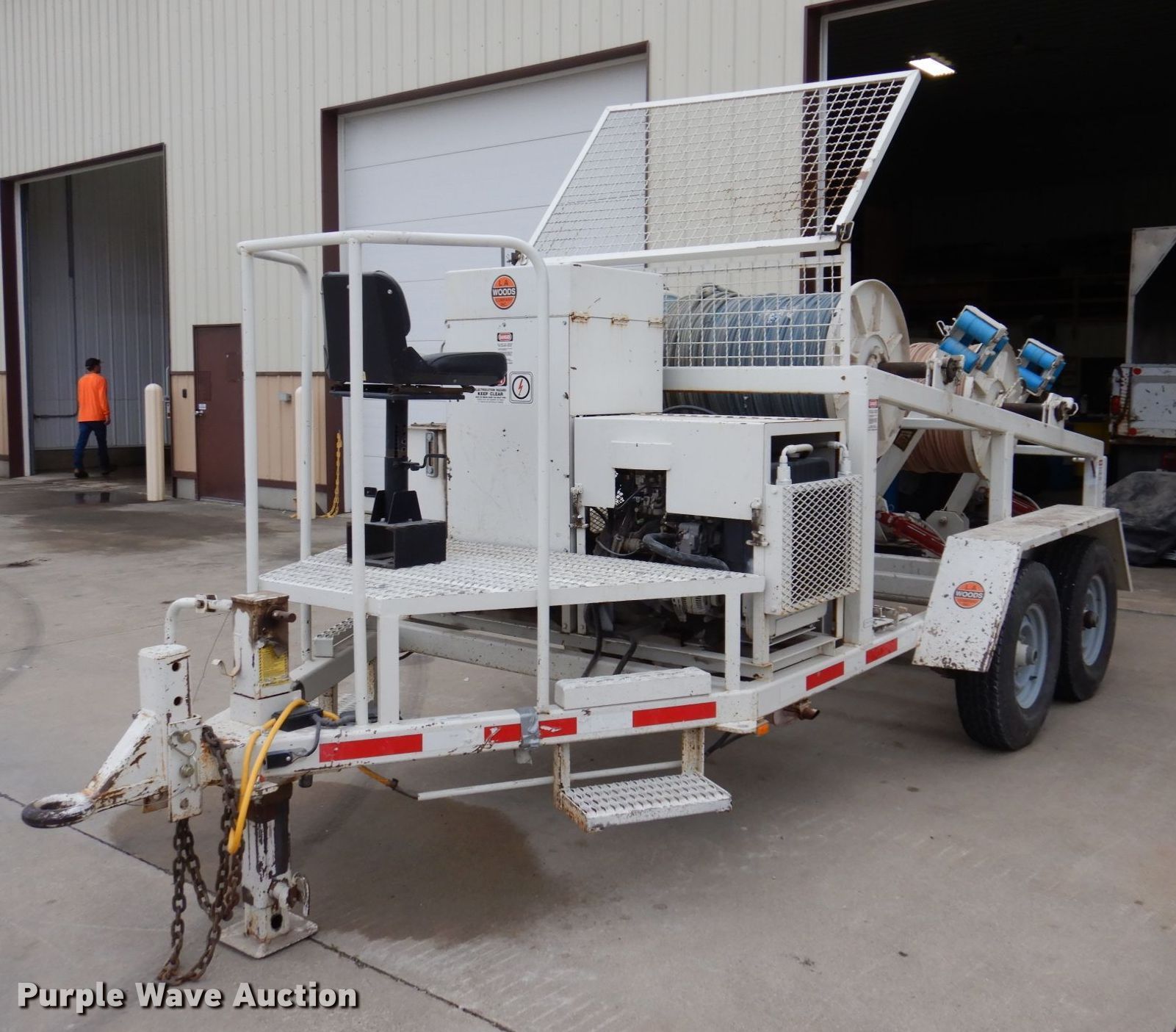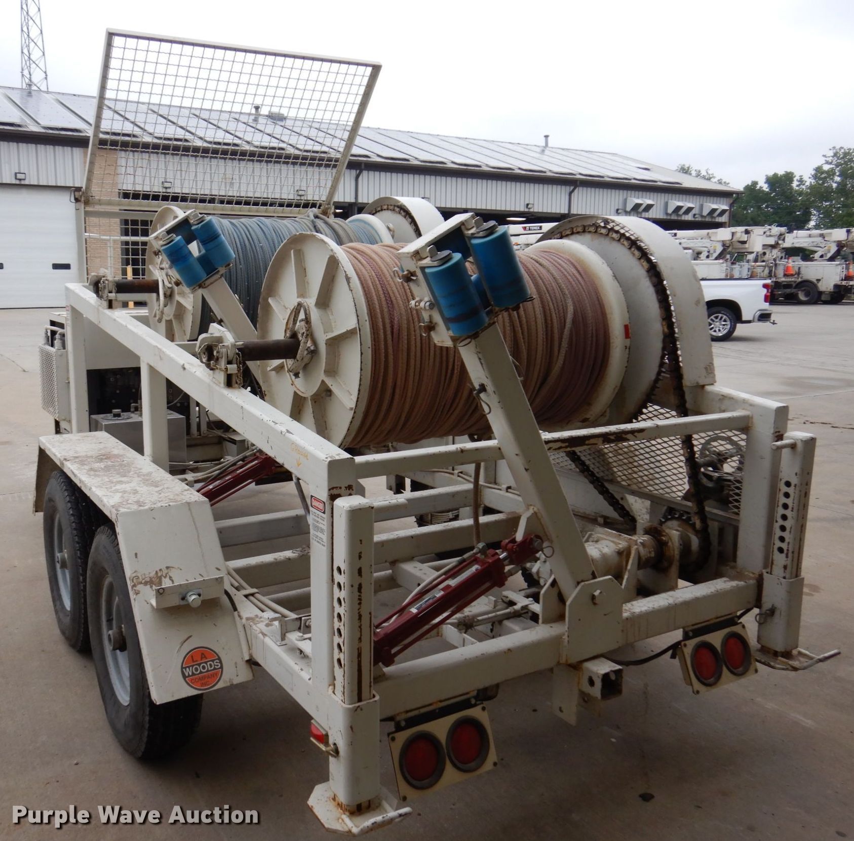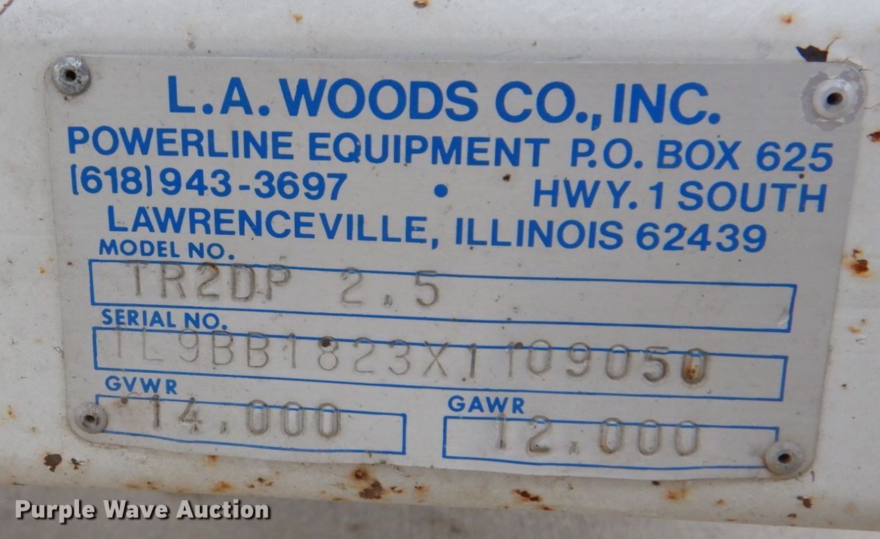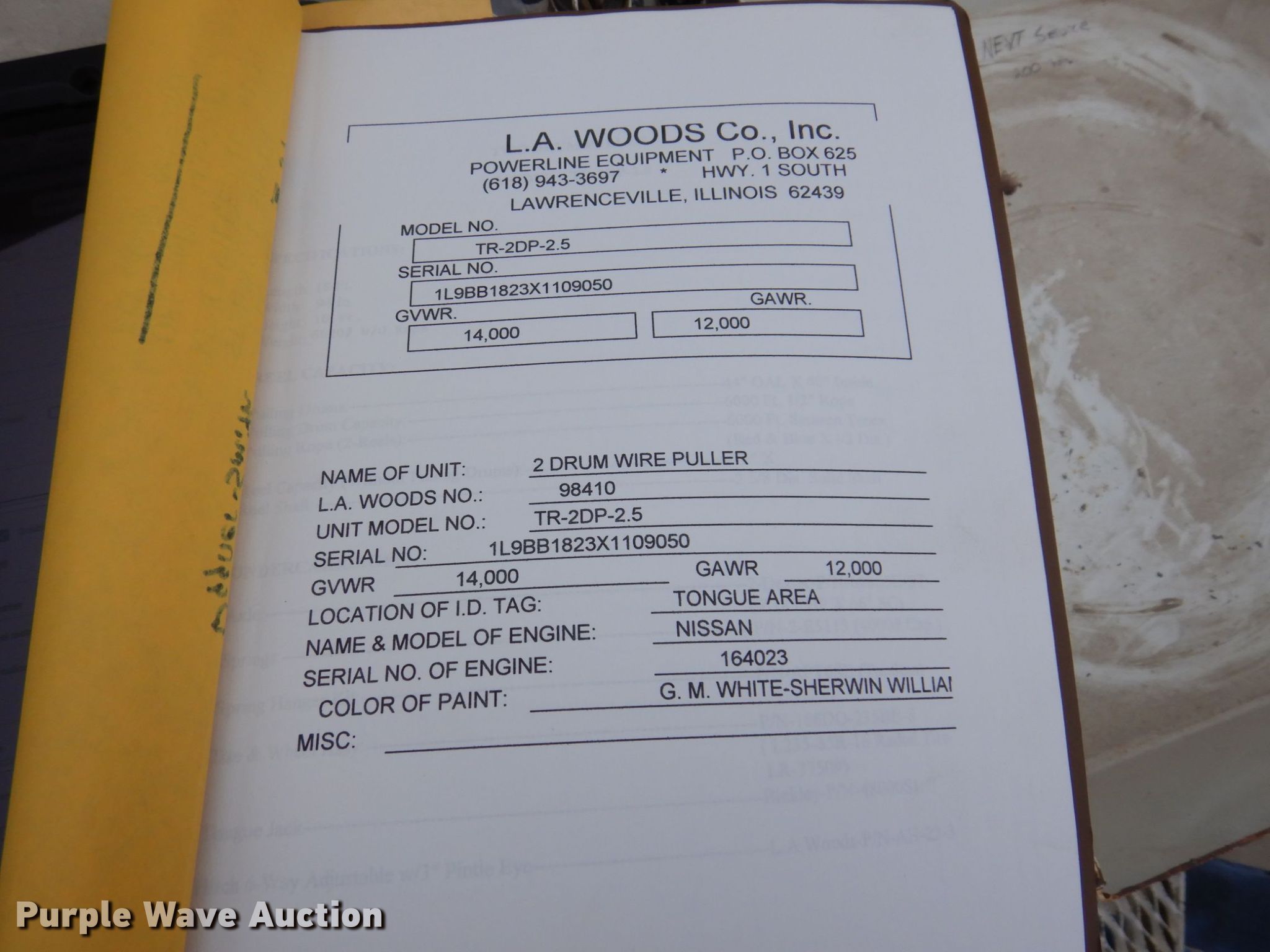 1999 LA Woods TR2DP reel trailer. Hours: 172 on meter, VIN: 1L9BB1823X1109050. Dimensions Overall: 19' L x 96" W. Engine Nissan, Cylinders: 4, Fuel type: Gas. Features Reel: Double, Self-contained hydraulics, Blue rope Diameter: 1/2" , Length: 6000', Red rope Diameter: 1/2" , Length: 6000'. Chassis Hitch: Pintle, Landing gear: Single, Suspension: Spring, Brakes: Electric, Axles: Tandem, GVWR: 14,000 lbs, GAWR: 12,000 lbs. Tires Size: 235/85R16. Notes Weak battery. Illinois title. Shelby Electric Cooperative. 1355 State Hwy 128. Shelbyville, IL 62565