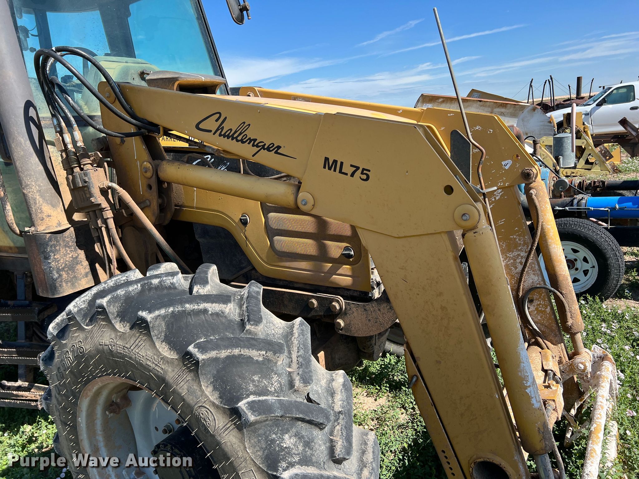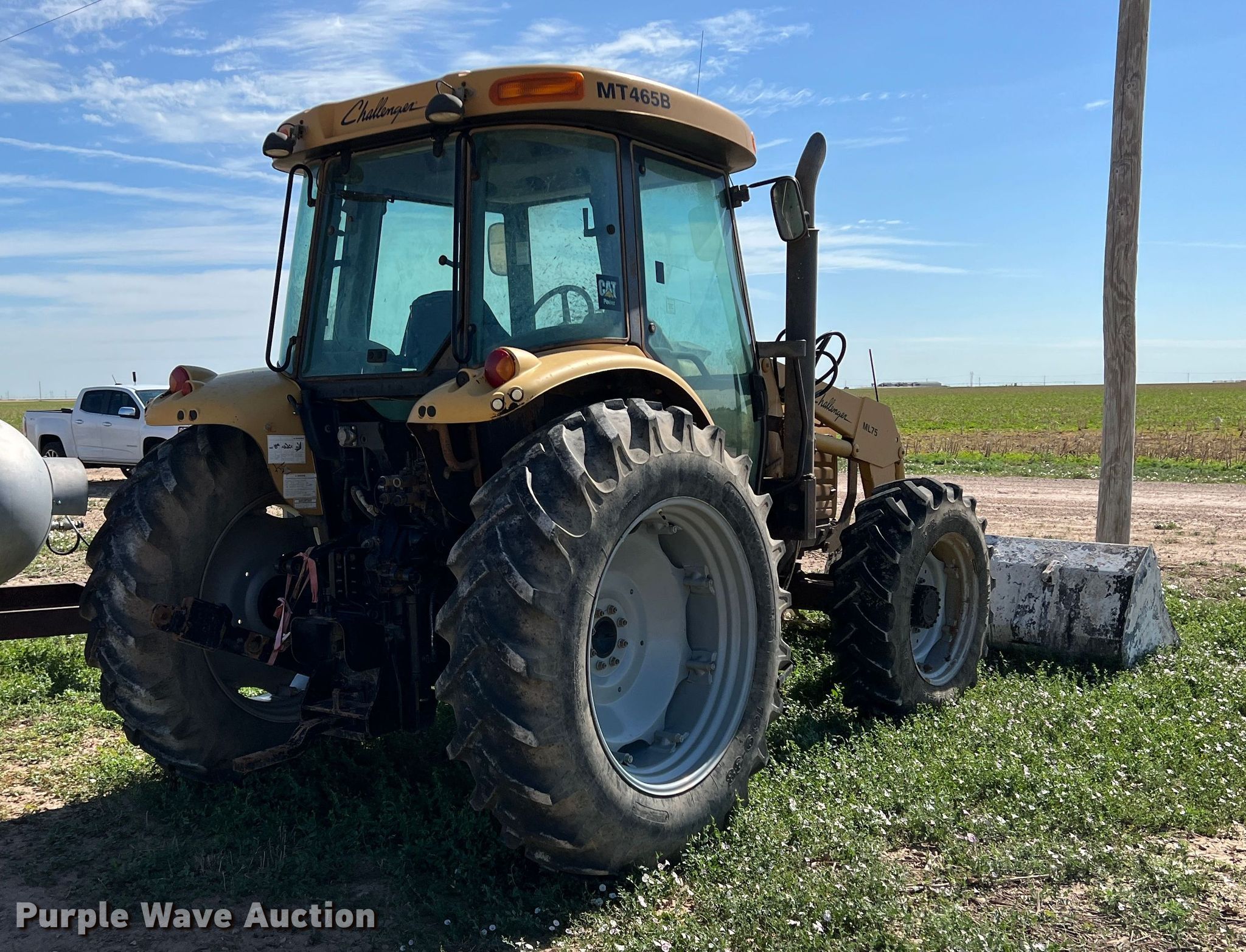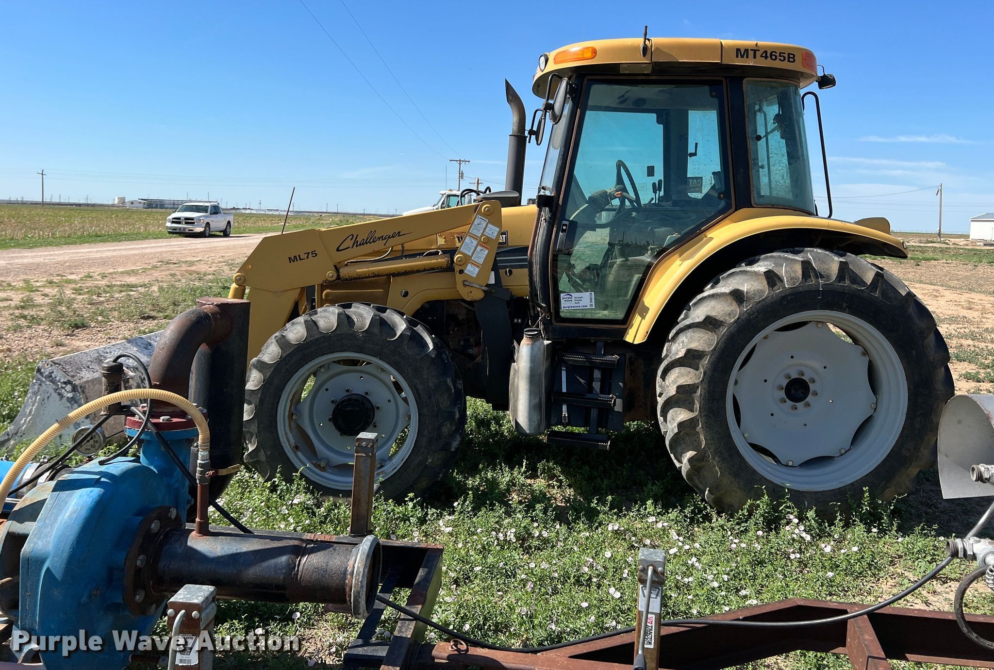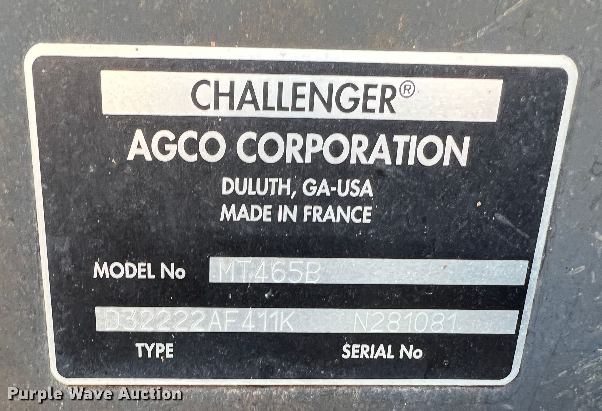 AGCO MT465B MFWD tractor. Hours: 5,090 on meter, Serial: N281081. Engine Cylinders: 4, Fuel type: Diesel. Transmission Powershift, 12F - 12R, Left-hand reverser. Operators station AC, Heat. Features PTO: 1000, Hydraulic remote sets Rear: 2, Loader Challenger ML75, Controls: Joystick, Bucket Width: 81".. Tires Front: 340/85R28, Rear: 16.9-38. Seaboard Foods. Guymon, OK 73942