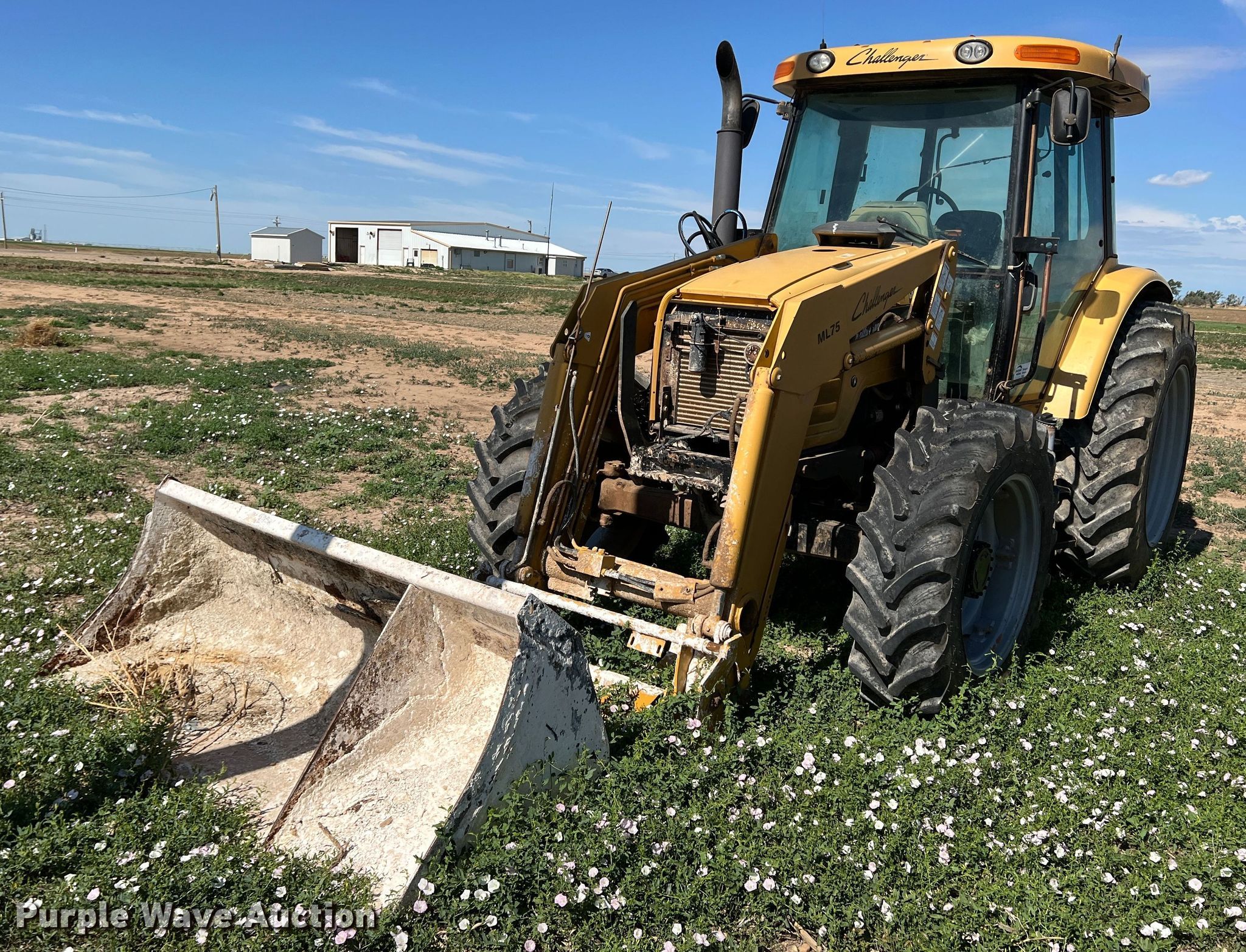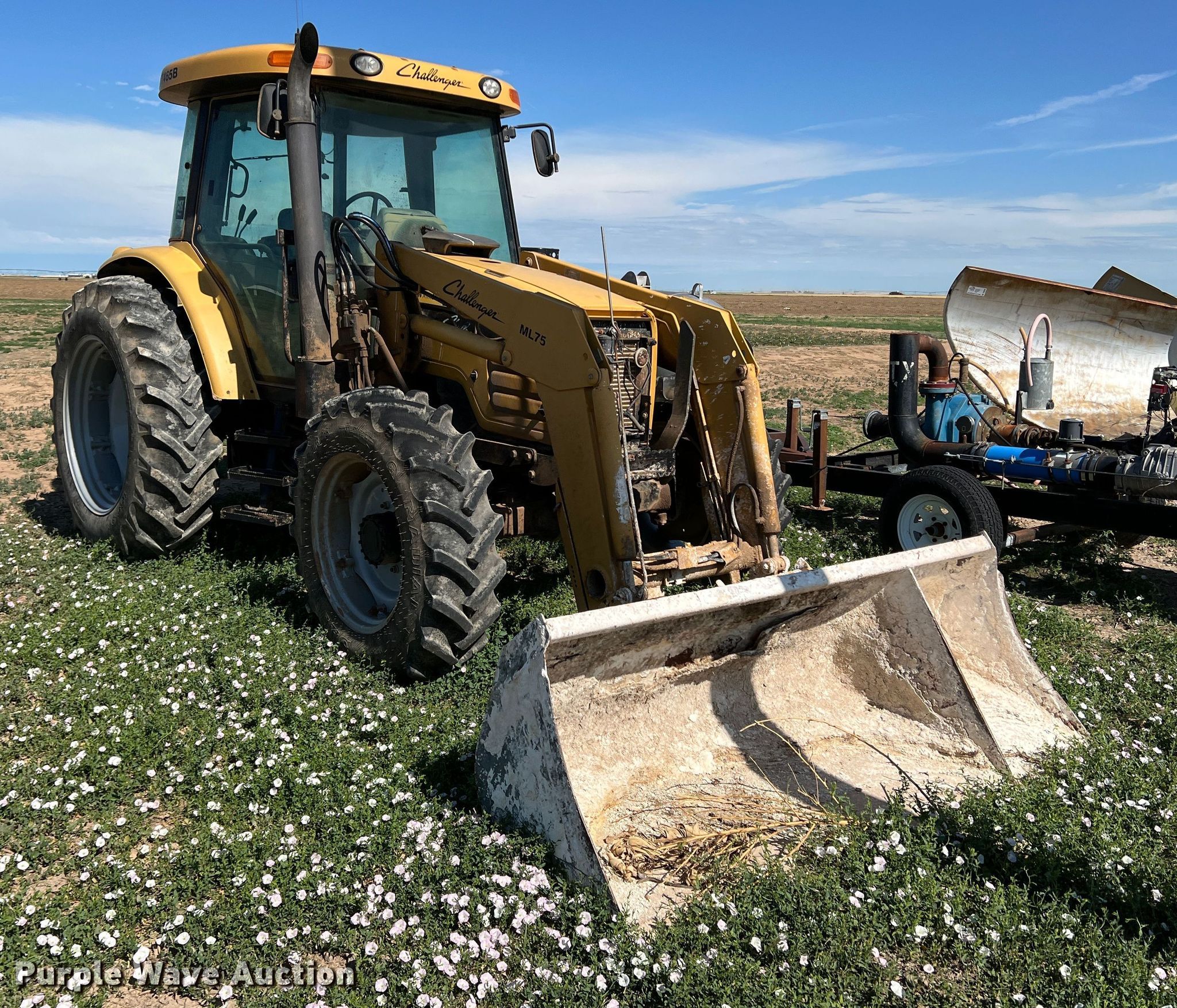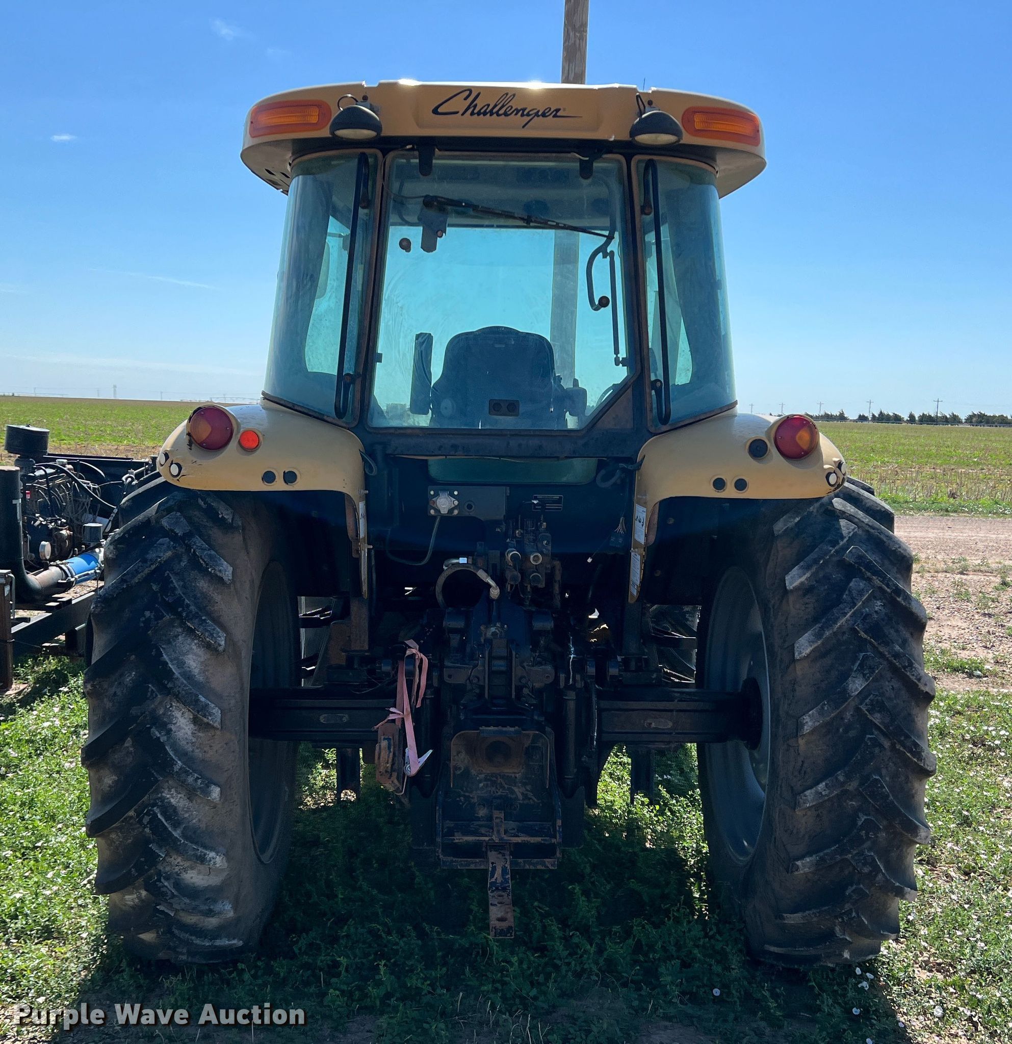AGCO MT465B MFWD tractor. Hours: 5,090 on meter, Serial: N281081. Engine Cylinders: 4, Fuel type: Diesel. Transmission Powershift, 12F - 12R, Left-hand reverser. Operators station AC, Heat. Features PTO: 1000, Hydraulic remote sets Rear: 2, Loader Challenger ML75, Controls: Joystick, Bucket Width: 81".. Tires Front: 340/85R28, Rear: 16.9-38. Seaboard Foods. Guymon, OK 73942
