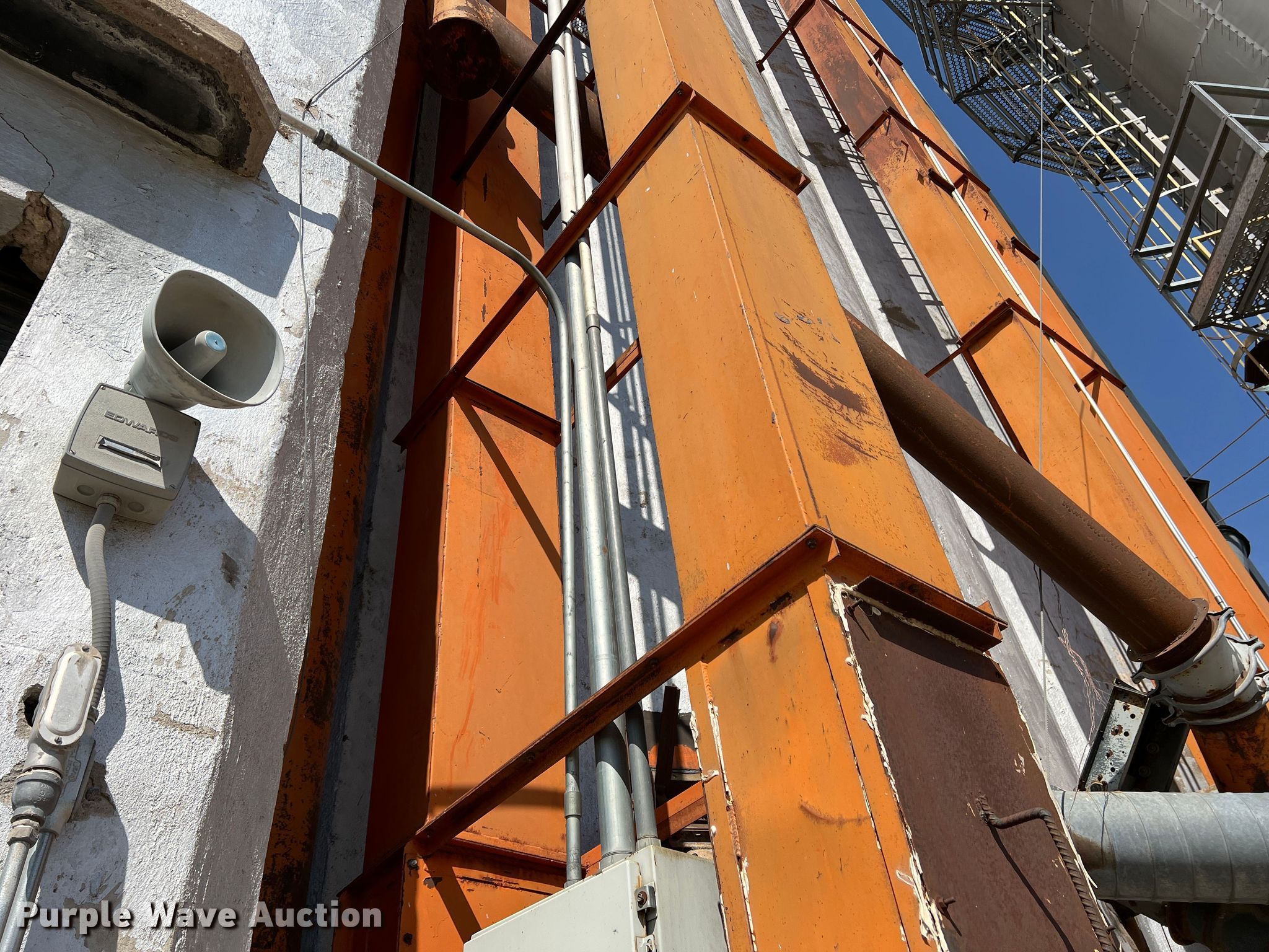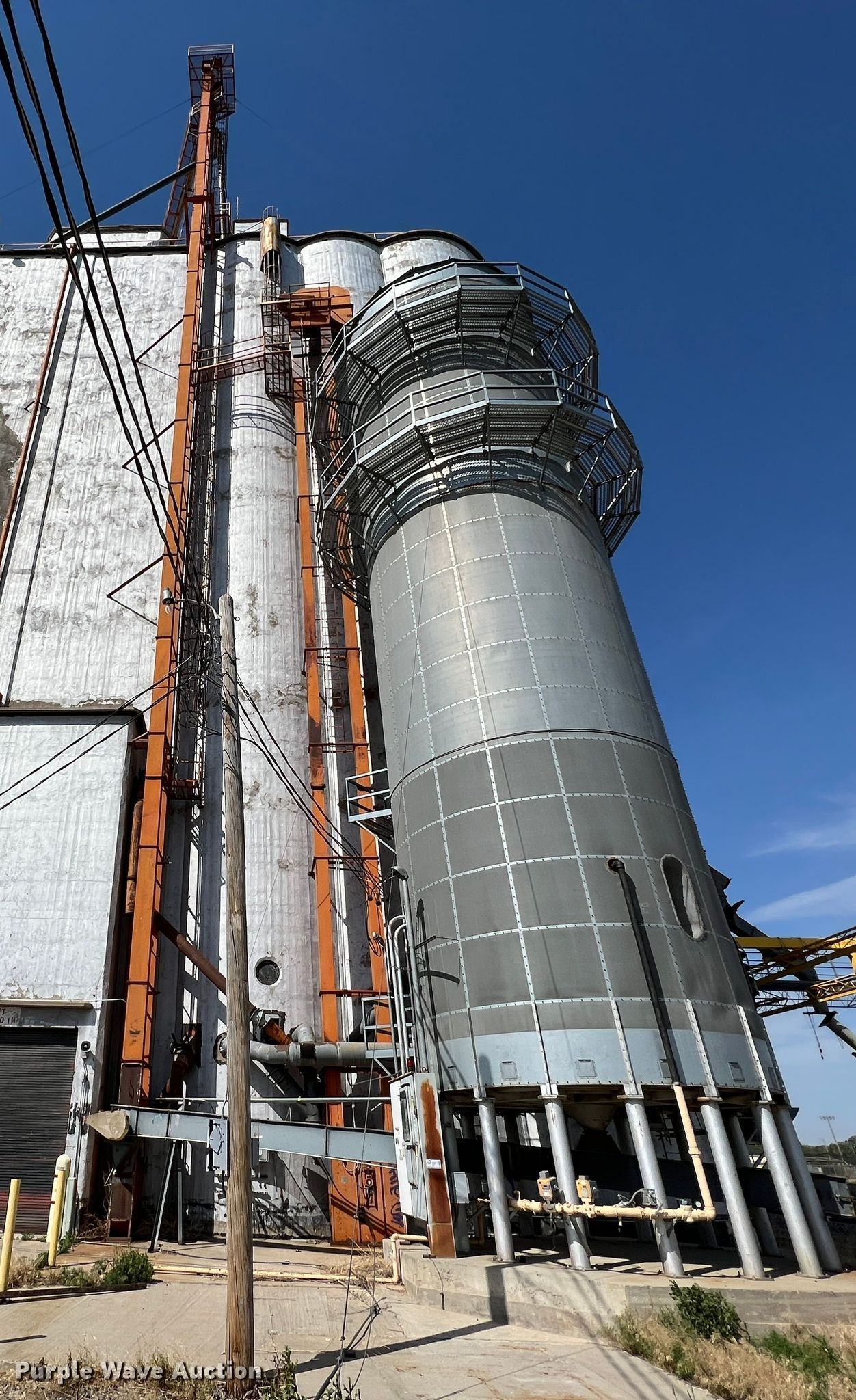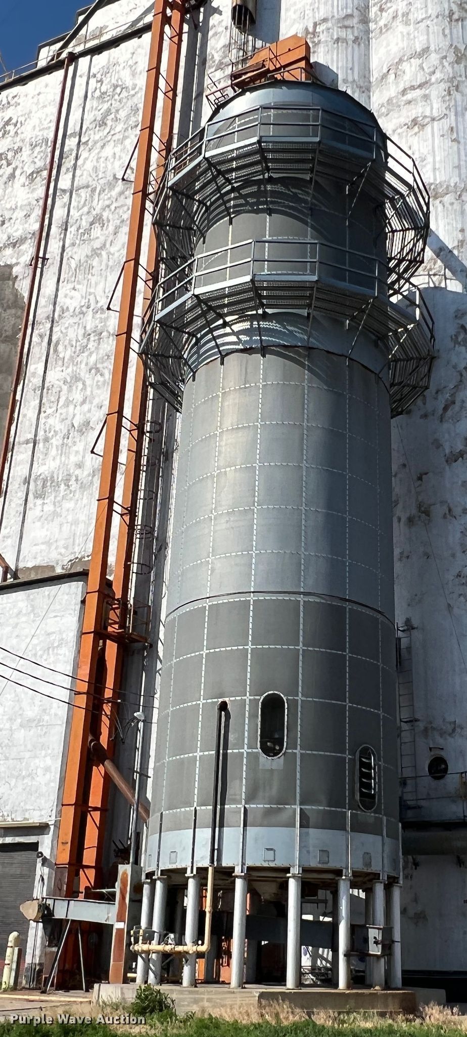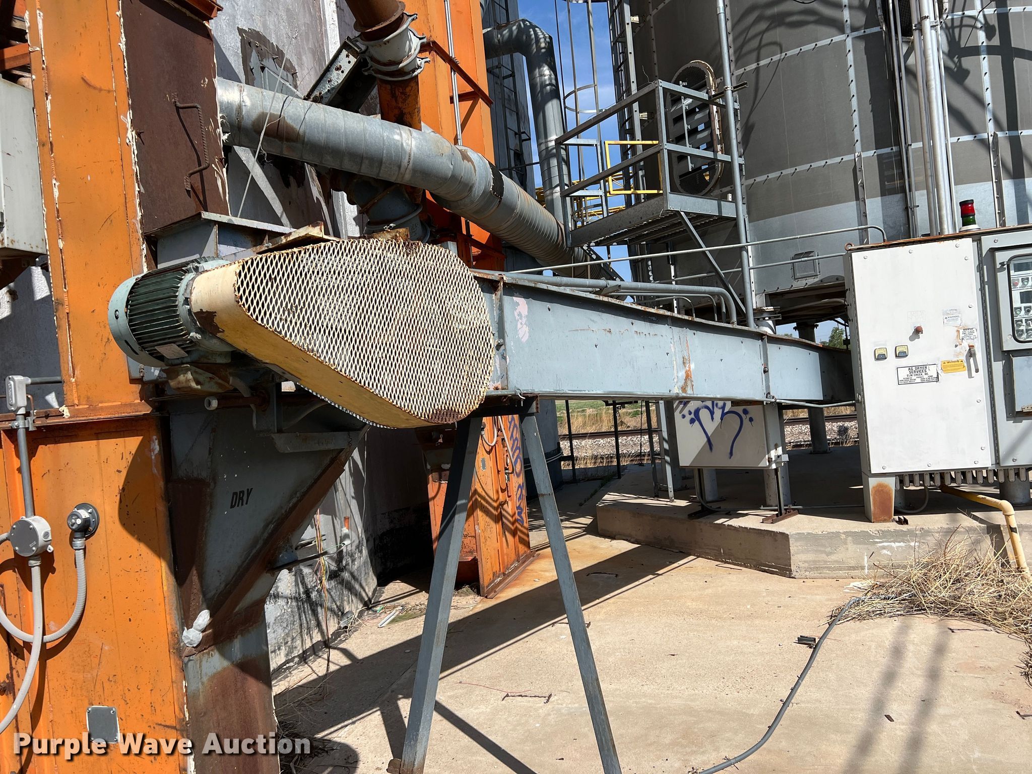 Purple Wave is selling a used Grain Dryer in Oklahoma. This item is a Zimmerman VT-3026 grain dryer with the following: Length: 37', Width: 10", Continuous flow, Bushel capacity: 2,500, Electric: Three phase, Heating: Natural gas, Dry grain leg: Approx 120' H, Wet grain leg: Approx 100' H