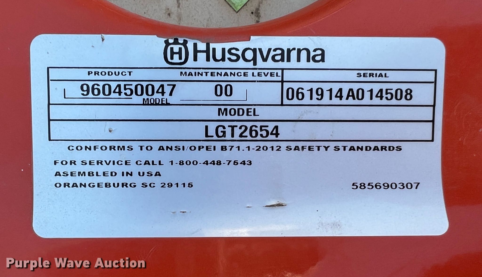 Purple Wave is selling a used Lawn Mower in Kansas. This item is a Husqvarna LGT2654 lawn mower with the following: Hours: 390 on meter, Cutting width: 54", Serial: 061914A014508