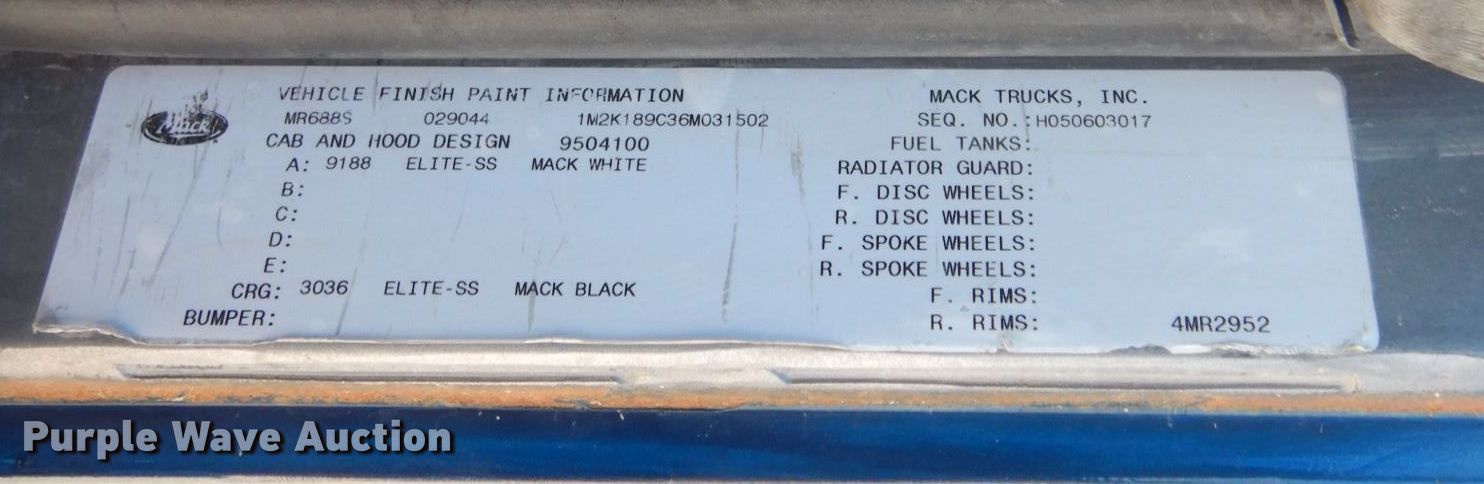 Purple Wave is selling a used Ready Mix or Pump Truck in Minnesota. This item is a 2006 Mack MR688S material conveyor truck with the following: Miles: 109,893 on odometer, Hours: 8,837 on meter, VIN: 1M2K189C36M031502
