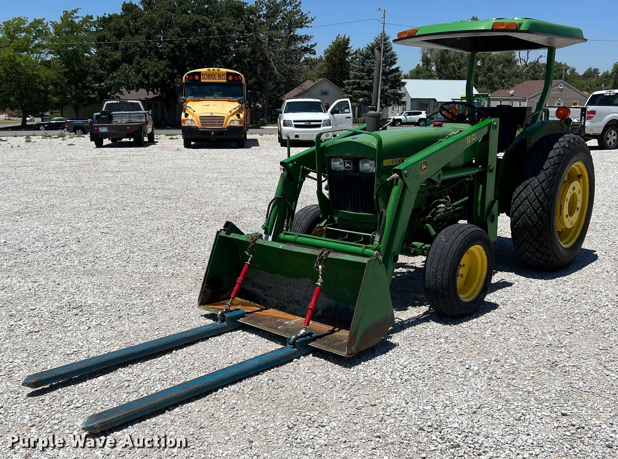 John Deere 950 tractor. Hours: 2,894 on meter, Serial: 0950S008328CH. Engine Yanmar 3T90J, Cylinders: 3, Fuel type: Diesel. Transmission Manual, 8F - 2R. Features PTO: 540, Three point, Hydraulic remote sets Rear: 4, Loader John Deere 80, Quick attach, Bucket Width: 54", Forks Length: 52".. Tires Front: 27x9.50-15, Rear: 13.6/12-28, Wheel weights: 10. Notes Snow chains, Additional parts. USD 102 Cimarron Schools. 314 North 1st Street. Cimarron, KS 67835