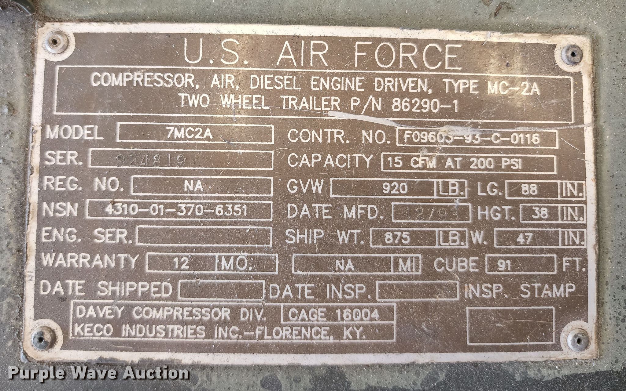 Air compressor. Hours: 2,135 on meter, Serial: 924819. Engine Cylinders: 2, Fuel type: Diesel. Features Air compressor CFM: 15, PSI: 200. Trailer 7' L x 48" W, Suspension: Spring, Axles: Single, Tire size: 6.9-9. Notes Unknown operating condition. Transfer of ownership documentation will be a bill of sale. Tightwad Fire Protection District. 11585 Missouri 7. Clinton, MO 64735