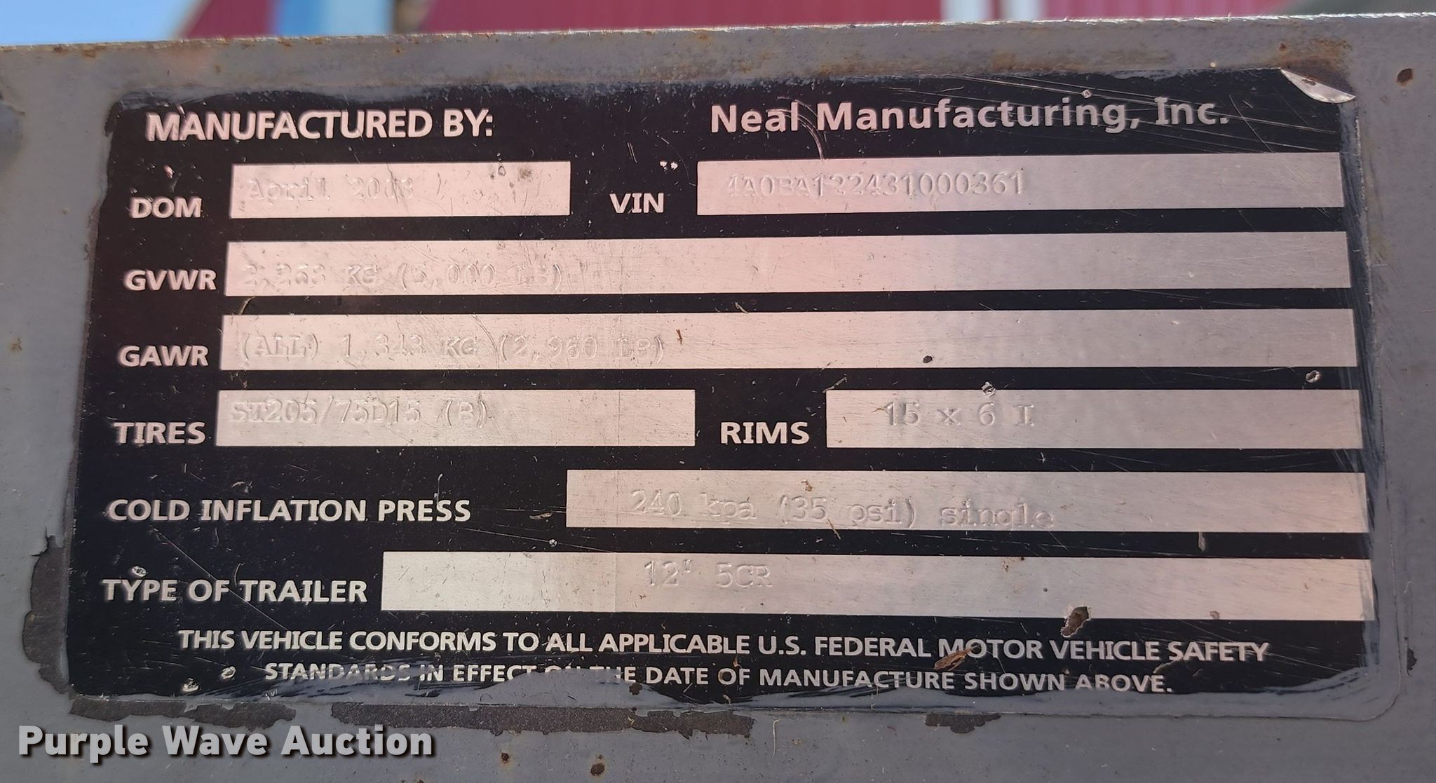 Purple Wave is selling a used Car or Utility Trailer in Missouri. This item is a 2003 Neal Manufacturing utility trailer with the following: VIN: 4A0BA122431000361