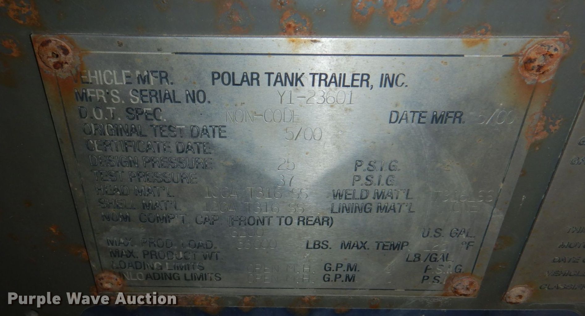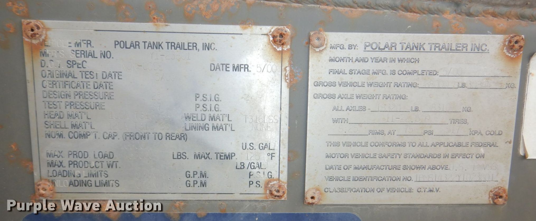 Purple Wave is selling a used Tank Trailer in Nebraska. This item is a 2000 Polar tank trailer with the following: VIN: 1PMS14322Y1023601