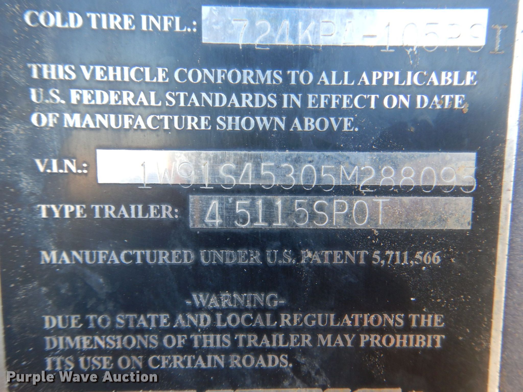 2005 Wilkens 54115SPOT walking floor trailer. VIN: 1W91S45305M288095, Unit #: 77406. Dimensions Overall: 45' L x 98" W, Side height: 108". Features Deck type: Aluminum. Chassis Landing gear: Dual, Two speed, Suspension: Spring, Brakes: Air, Axles: Triple, GVWR: 65,000 lbs, GAWR: 23,000 lbs, End gate: Hydraulic. Tires Steel wheels, Size: 11R22.5. Nebraska title. City of Lincoln Landfill. 5101 N 48th St. Lincoln, NE 68504