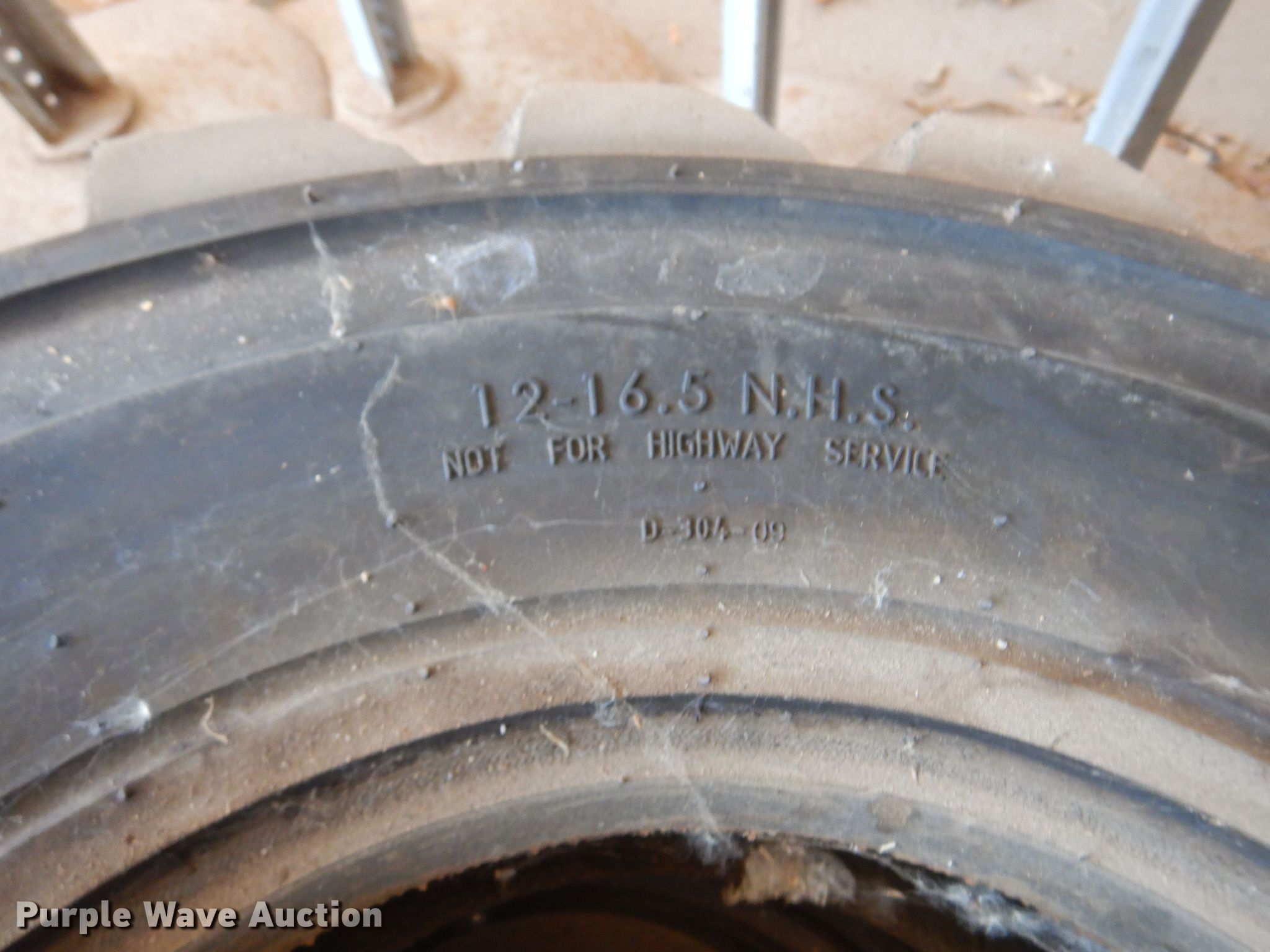 Purple Wave is selling a used Industrial Tires or Tracks in Kansas. This item is a (5) skid steer tires with the following: Bobcat 12-16.5 wheel and tire, (2) Firestone Duraforce 12-16.5, (2) Deestone 12-16.5