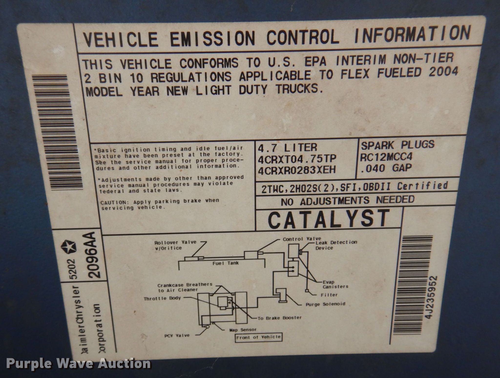 2004 Dodge Ram 1500 pickup truck. Miles: 205,177 on odometer, VIN: 1D7HU16P14J235952. Engine Displacement: 4.7L V8 SOHC, Cylinders: 8, Fuel type: Gas. Transmission Automatic, Four wheel drive. Interior AC, Heat. Tires Size: 265/70R17. Notes Dash warning indicator: Check engine, ABS, Brake, Windshield chipped or cracked, Dead battery, Hood issues, will not stay up. Missouri title. Seller is a government entity who will be assigning and distributing the title. Please contact the seller for distribution questions. Public Water Supply District 1-Macon. 28890 Hwy 63. Macon, MO 63552