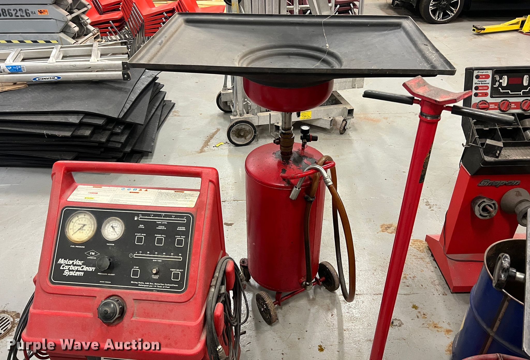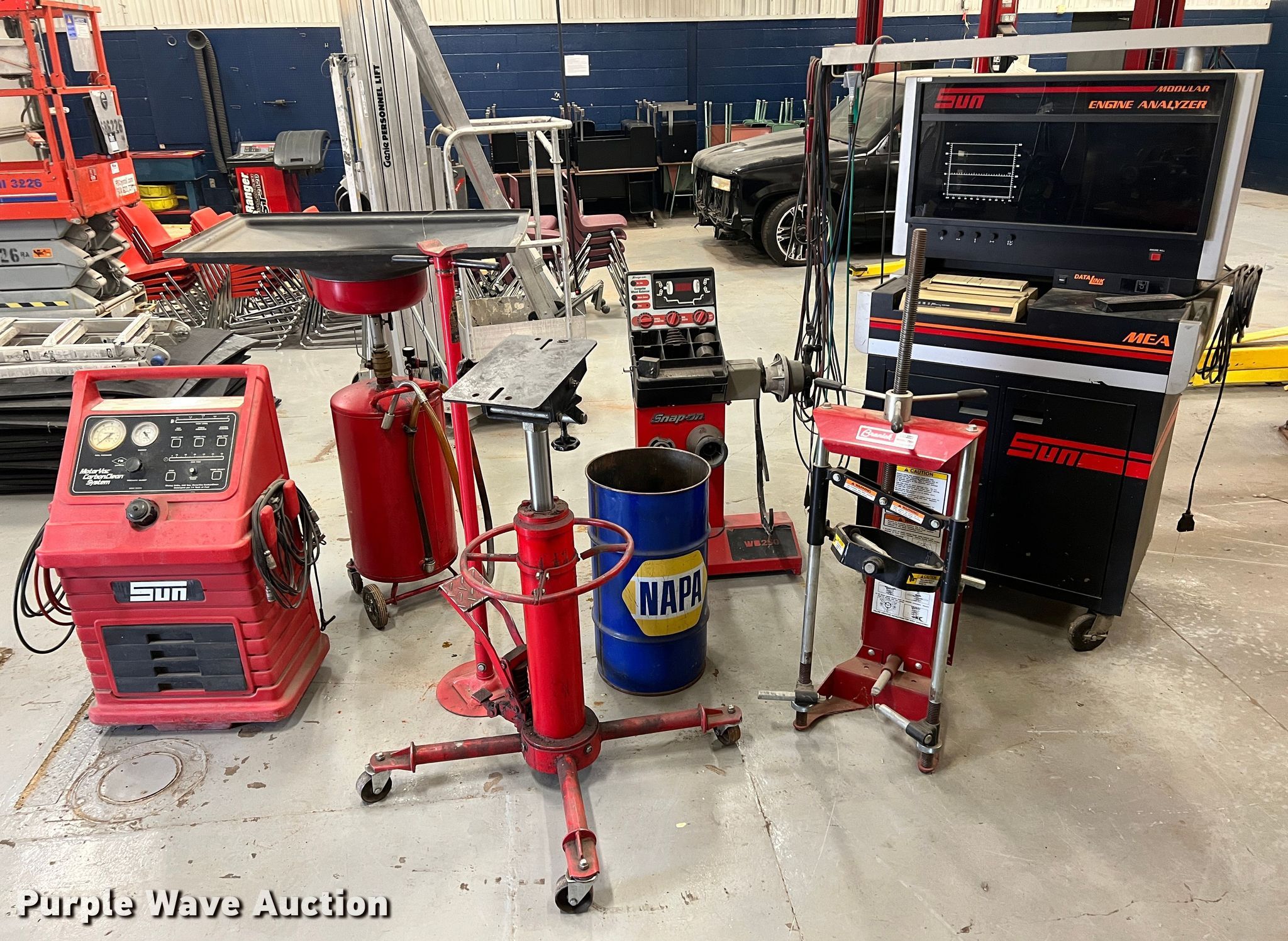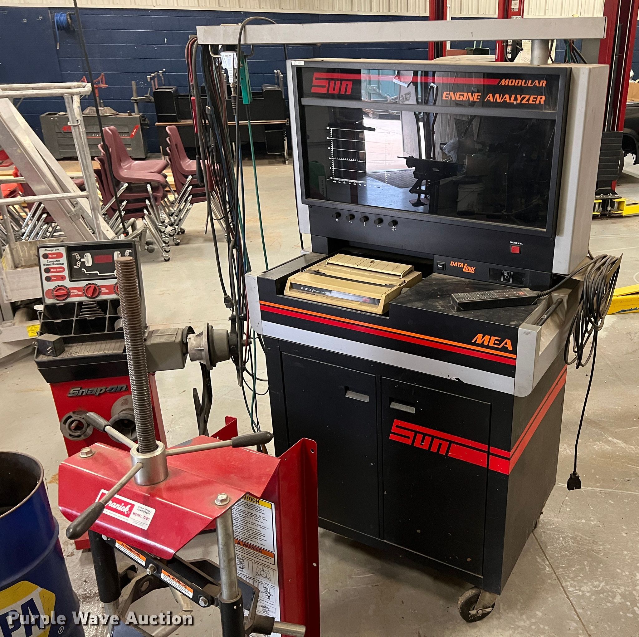 Purple Wave is selling a used Tools in Kansas. This item is a Tools with the following: Sun engine analyzer, Serial: 0987A, Branick 7200 strut spring compressor, Central Hydraulics transmission jack, Capacity: 1100 lbs, Napa barrel, Snap-On WB250 computer wheel balancer, Serial: S-348-016844, Single phase, Oil drain dolly, Sun MotorVac carbon clean system