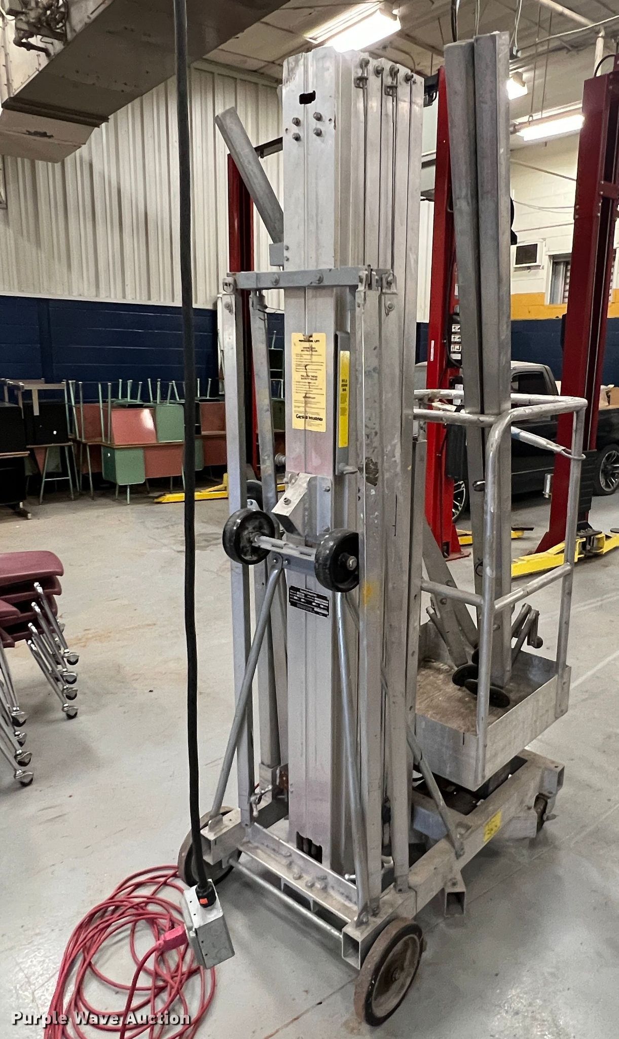 Genie PLC-30P vertical lift. Serial: 1489-19269. Electric Motor Volts: 115. Features Maximum lift capacity: 300 lbs, Maximum lift height: 30', Platform: 24" L x 24" W, AC power outlet, Controls: Platform. Tires Solid. USD 484. Fredonia, KS 66736