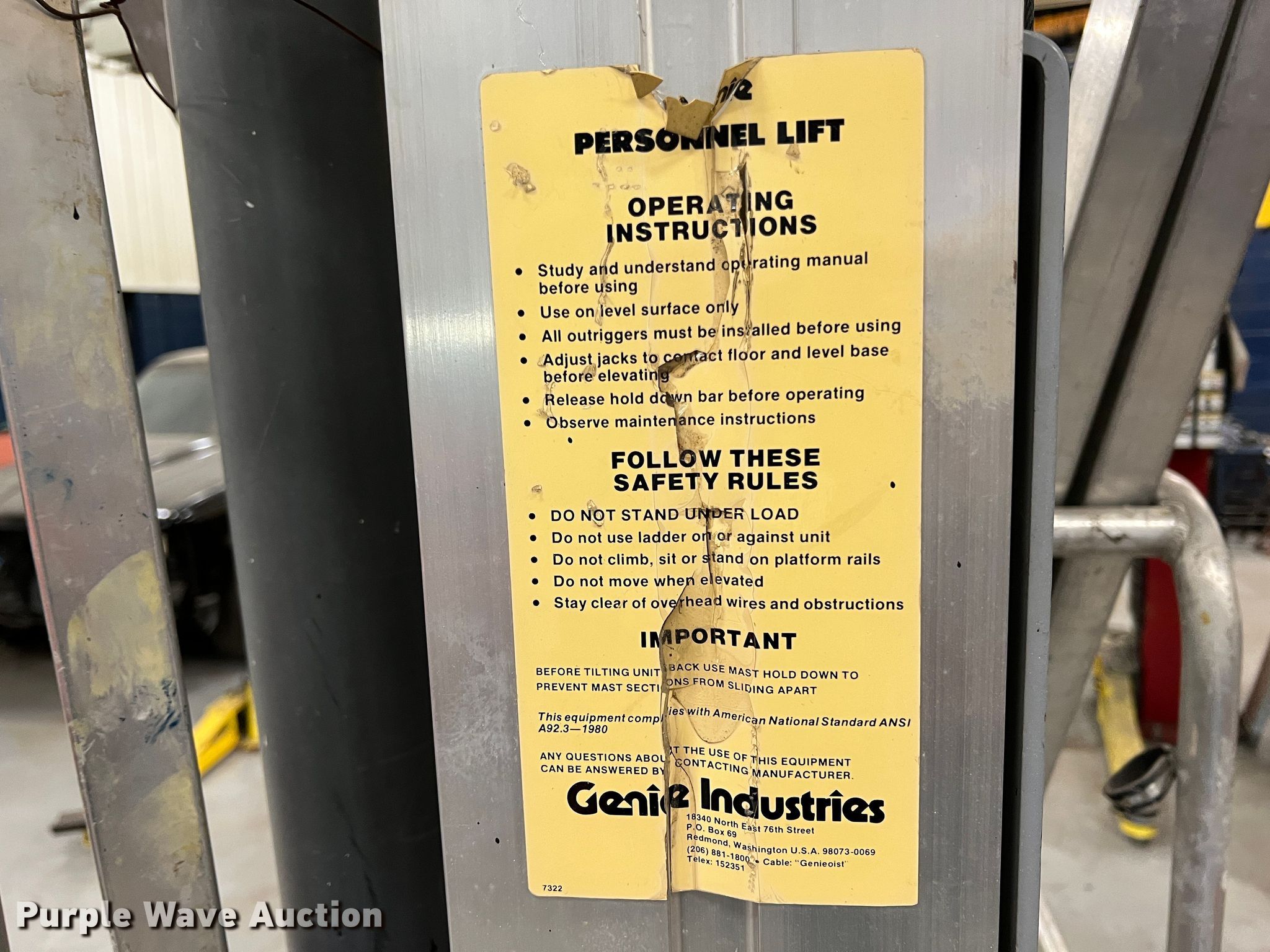 Purple Wave is selling a used Scissor or Vertical Lift in Kansas. This item is a Genie PLC-30P vertical lift with the following: Serial: 1489-19269