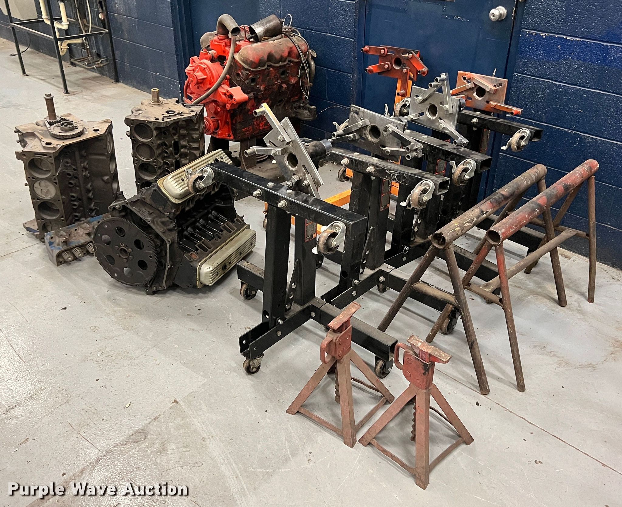 Purple Wave is selling a used Engine in Kansas. This item is a Six cylinder gas engine with the following: (3) engine blocks, parts only, (6) engine stands, (2) jack stands, Non-operational