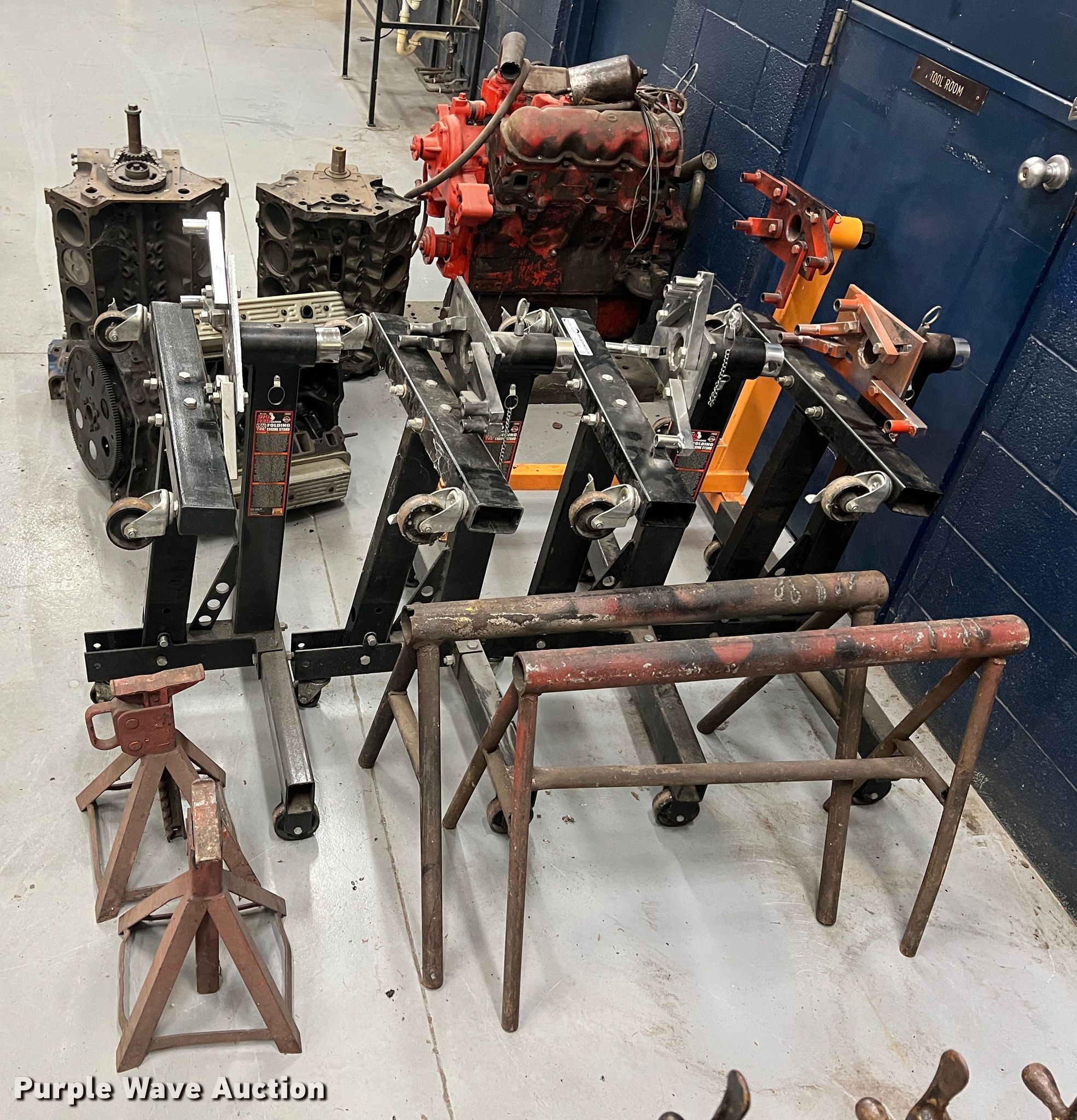 Six cylinder gas engine. (3) engine blocks, parts only, (6) engine stands, (2) jack stands, Non-operational. USD 484. Fredonia, KS 66736