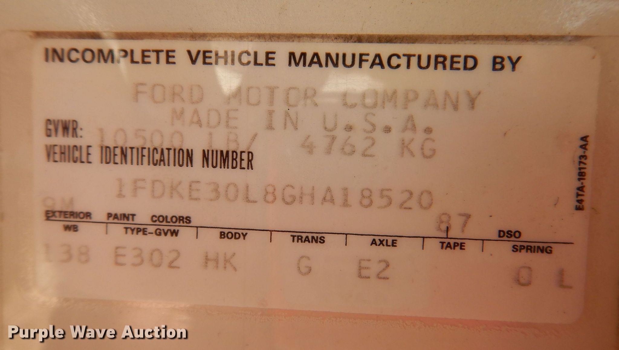 1986 Ford E350 ambulance. Miles: 47,909 on odometer, VIN: 1FDKE30L8GHA18520. Engine Displacement: 7.5L V8 OHV, Cylinders: 8, Fuel type: Gas. Transmission Automatic. Chassis Axles: Single, Suspension: Spring, Brakes: Hydraulic, GVWR: 10,500 lbs, Wheelbase: 138". Interior AC, Heat, Auxiliary controls. Features Ambulance body PA/ siren controls, Oxygen hookups. Tires Front: LT225/75R16, Rear: LT215/85R15. Notes Non-operational rear fuel tank. Iowa title. Seller is a government entity who will be assigning and distributing the title. Please contact the seller for distribution questions. 1200 John St. Corning, IA 50841