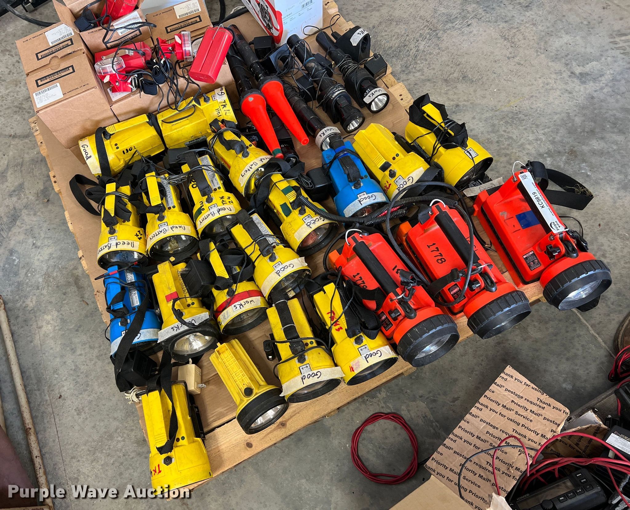 Purple Wave is selling a used Tools in Missouri. This item is a Approximately 44 flashlights with the following: (3) Streamlight Litebox rechargeable, (6) Streamlight rechargeable, Approximately 18 Sho-Me rechargeable, Approximately 17 Lantern Electric