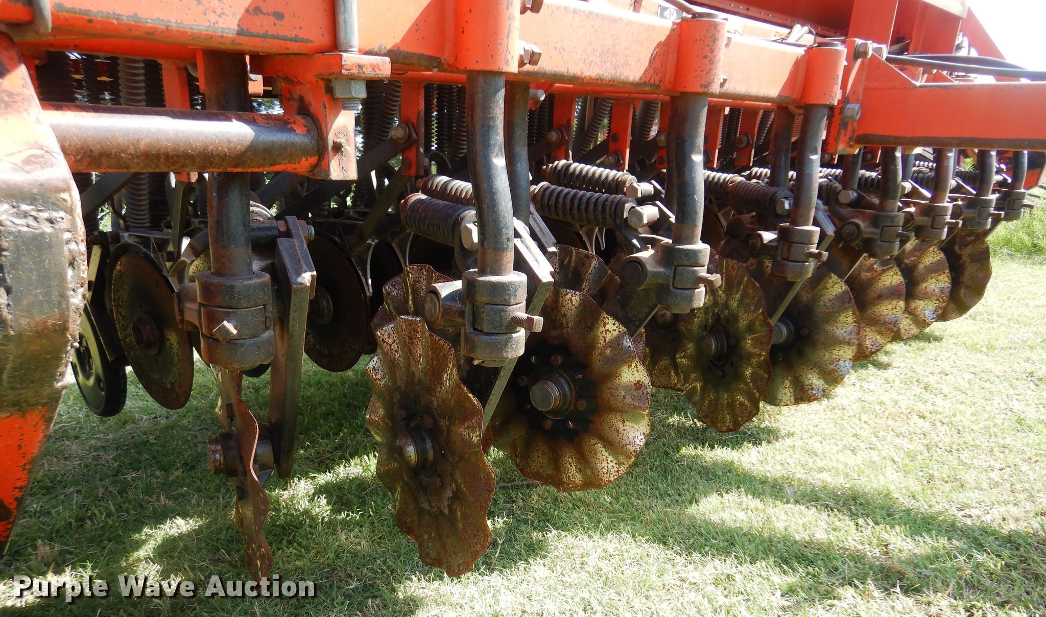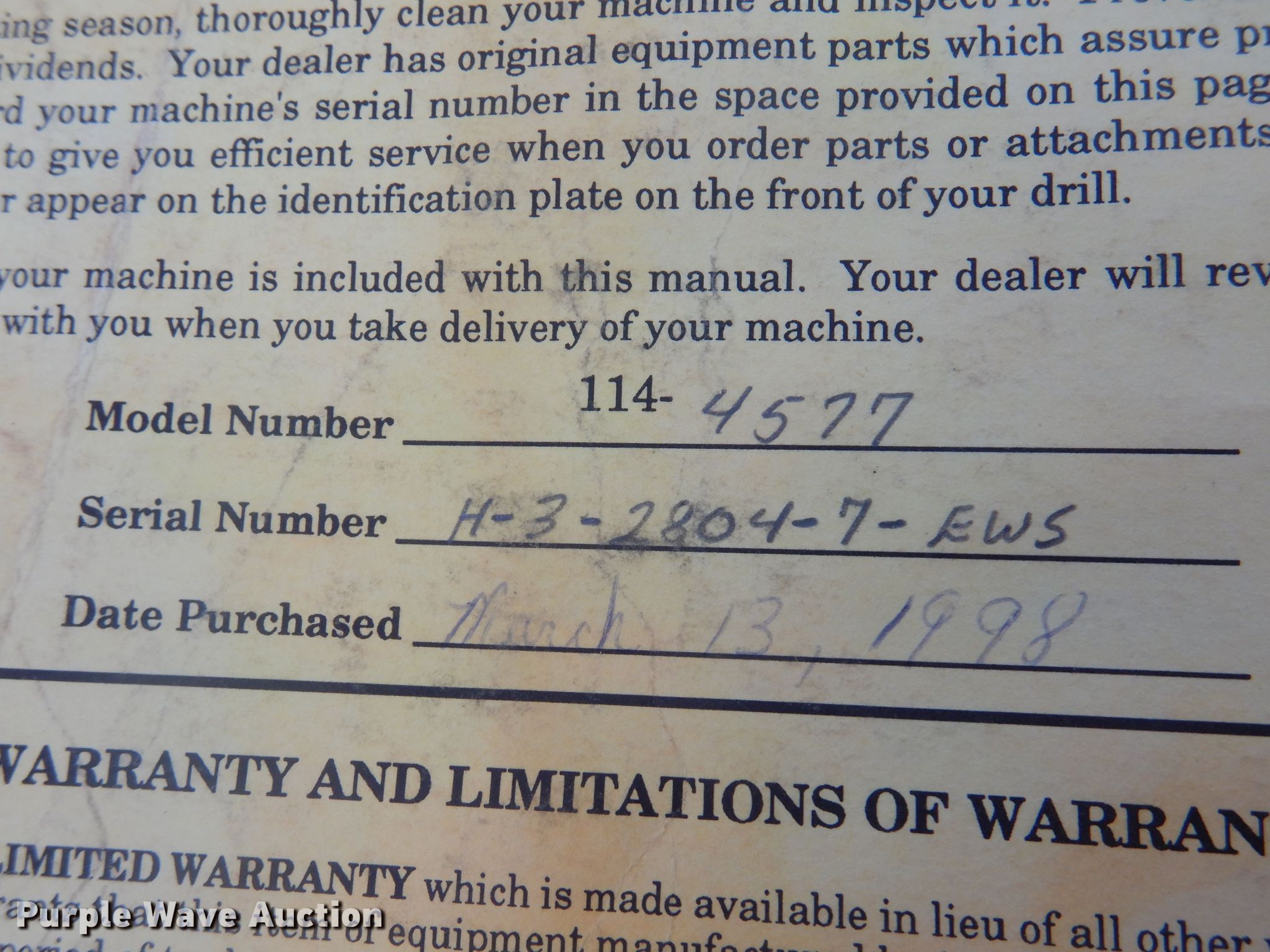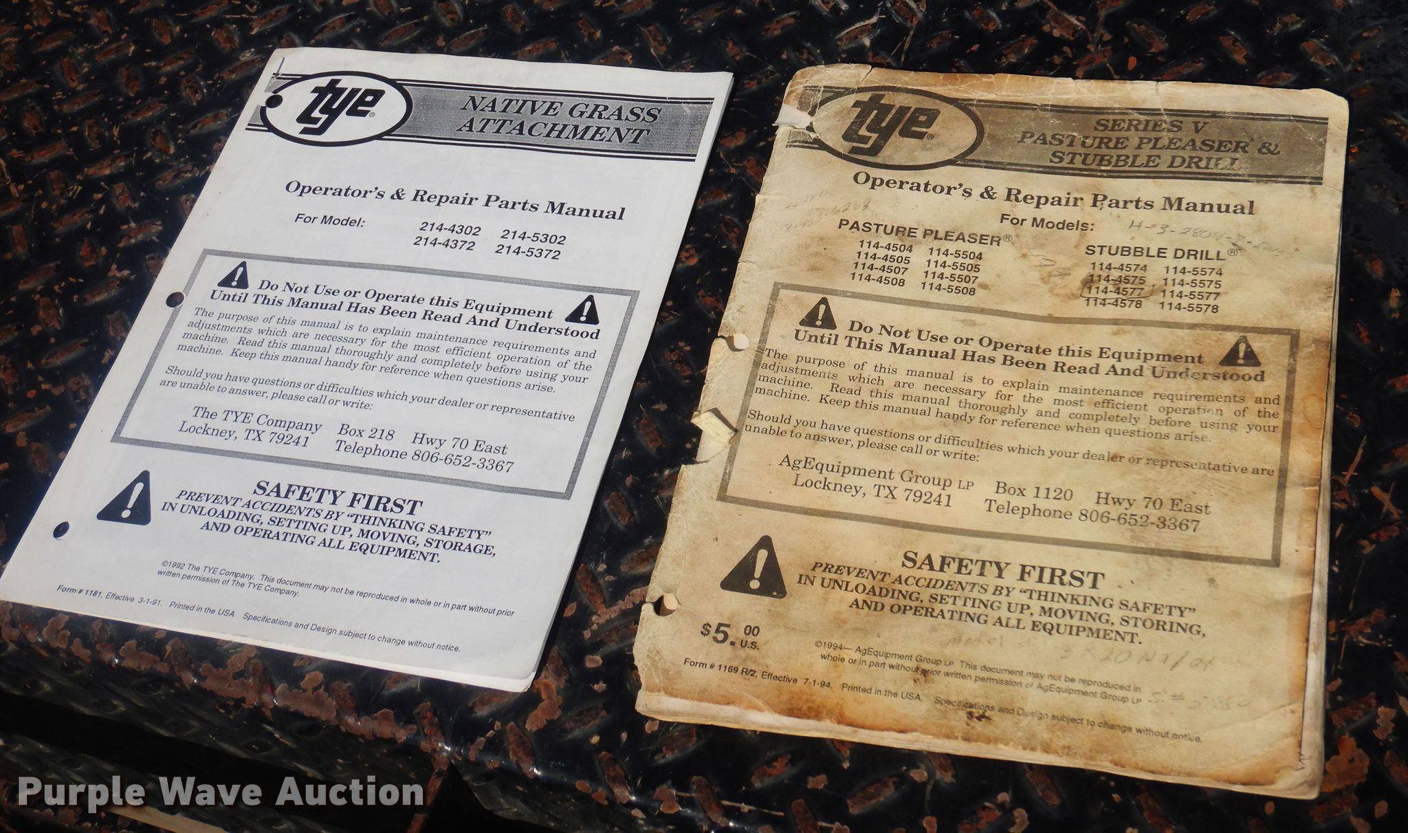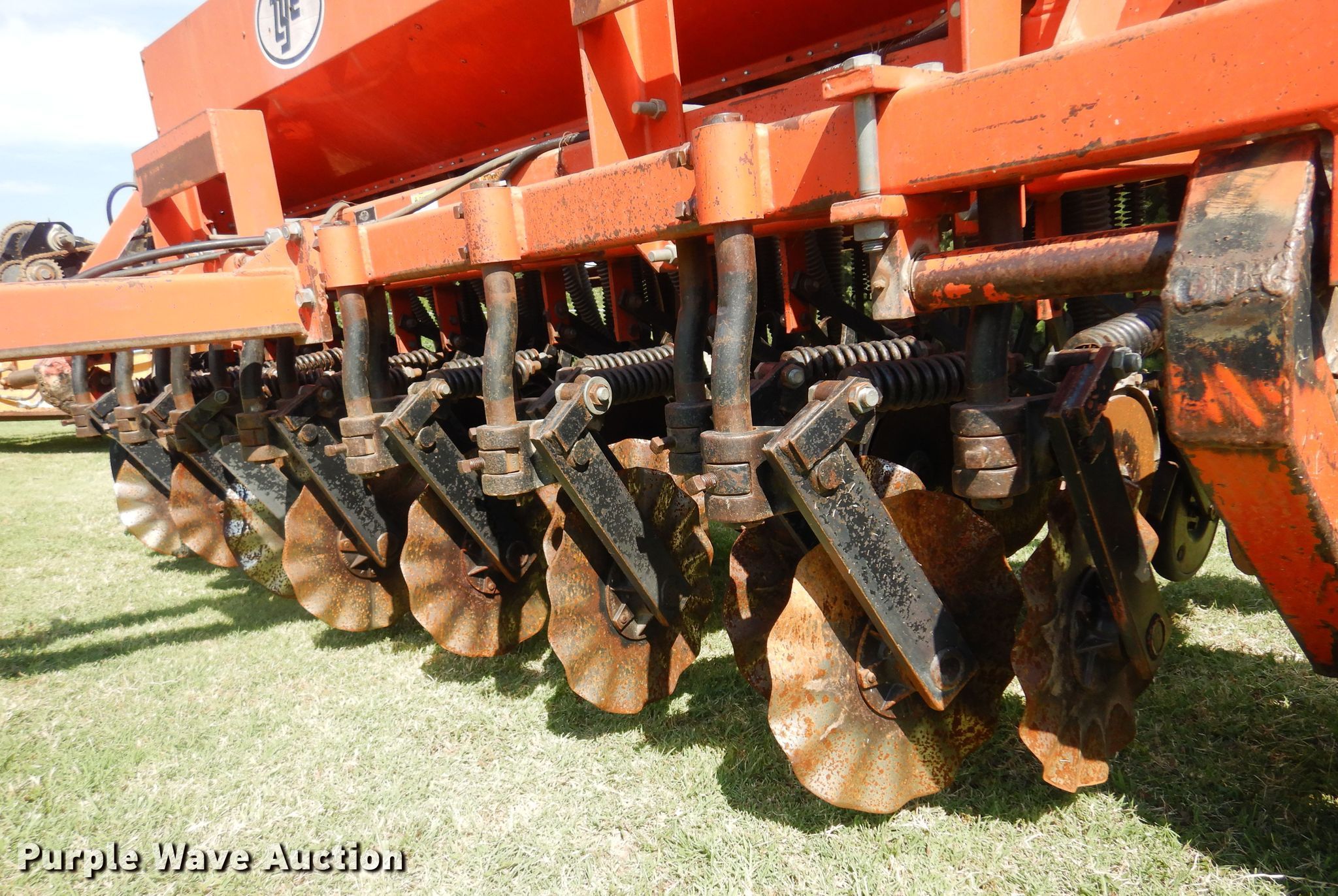 Purple Wave is selling a used Grain Drill or Seeder in Oklahoma. This item is a Tye 114-4577 Stubble Drill no-till grain drill with the following: Width: 10', Row units: 15, Row spacing: 8", Serial: H-3-2804-7-EWS
