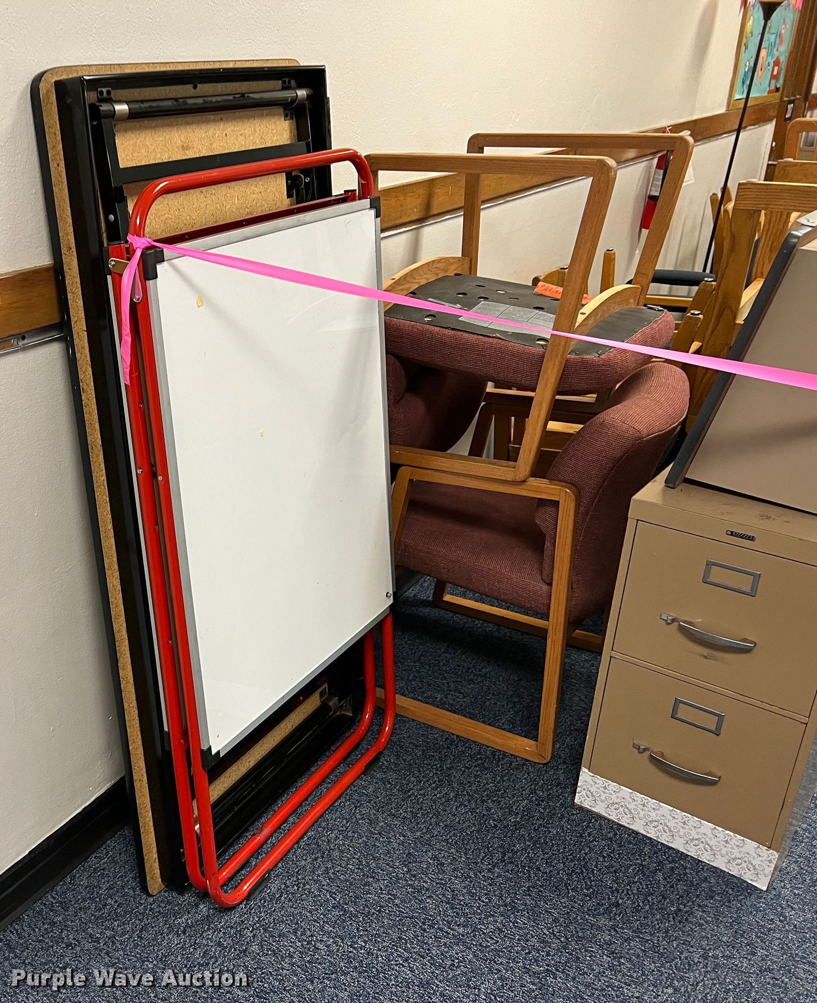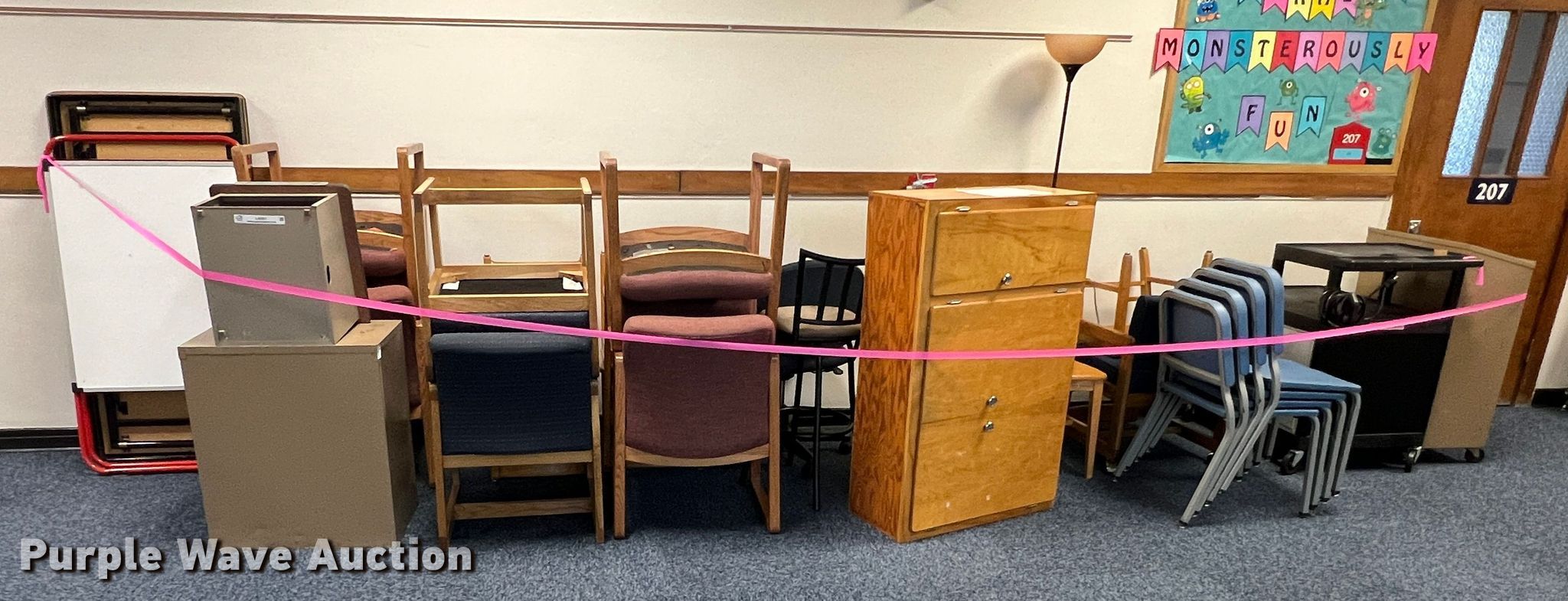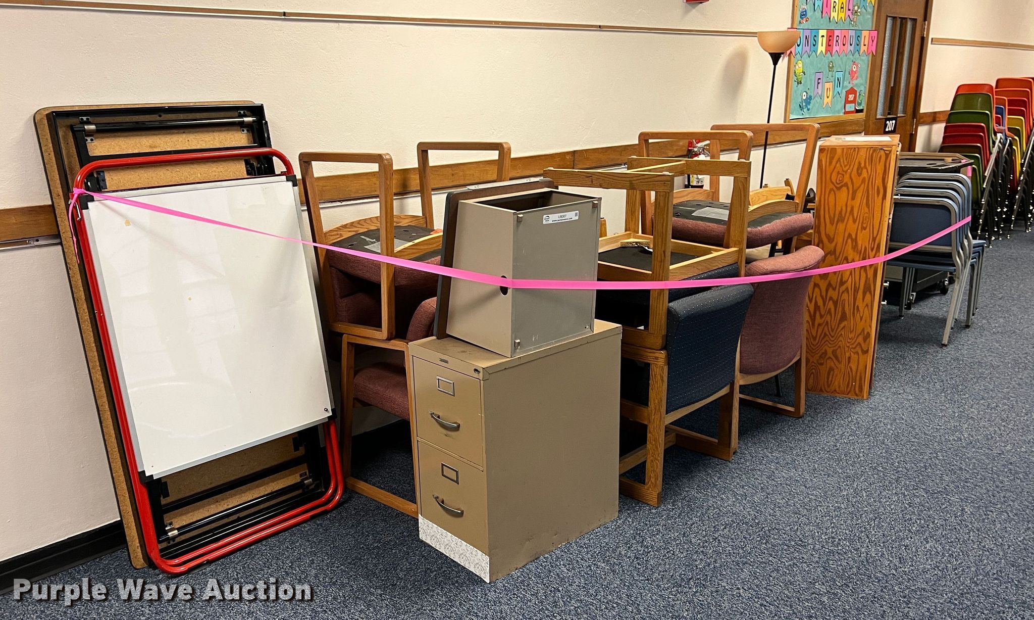 Purple Wave is selling a used Furniture in Kansas. This item is a Furniture with the following: Two drawer filing cabinets, Approx. 20 chairs, Wood cabinet, Audio visual cart, Metal shelf