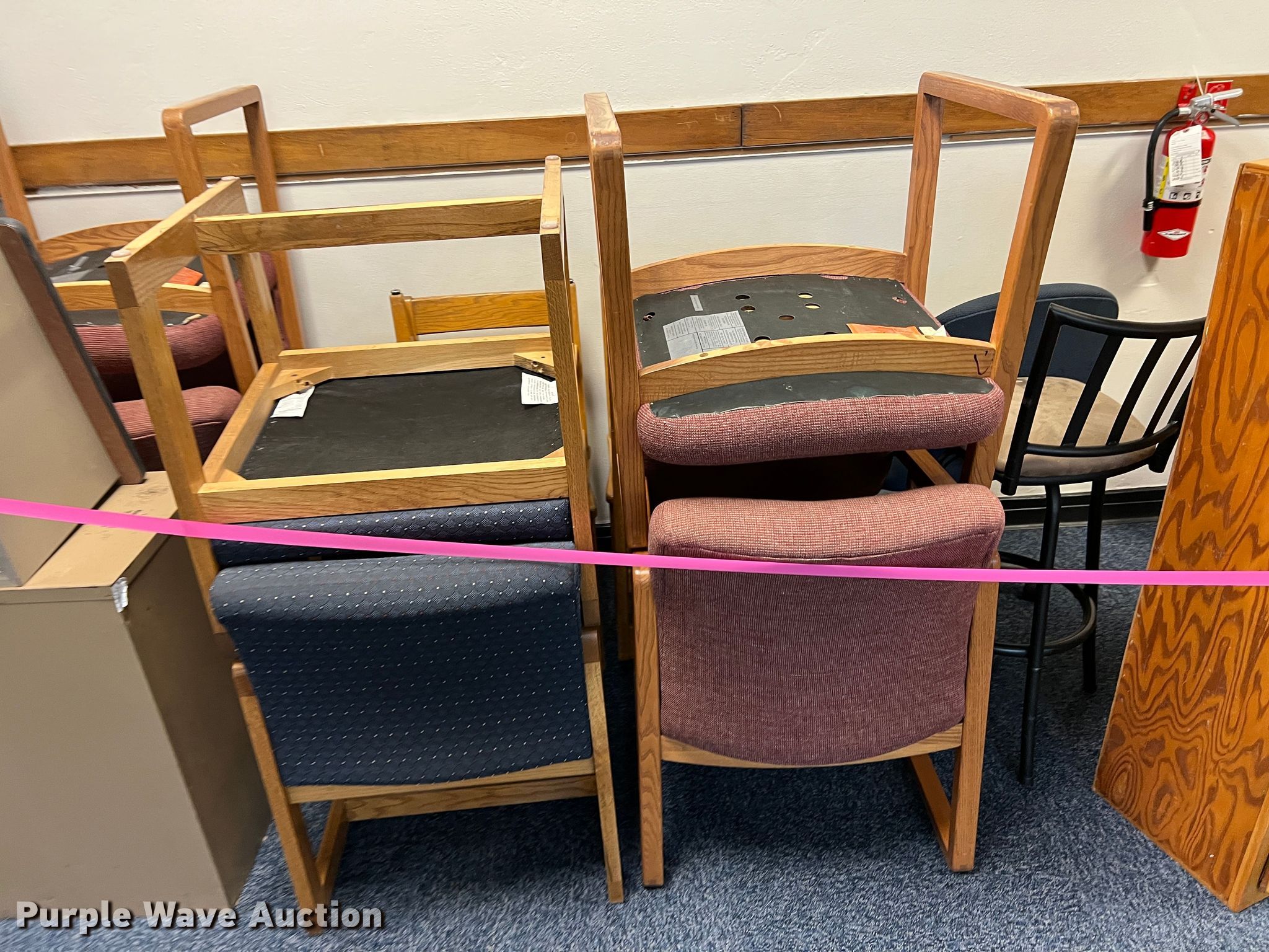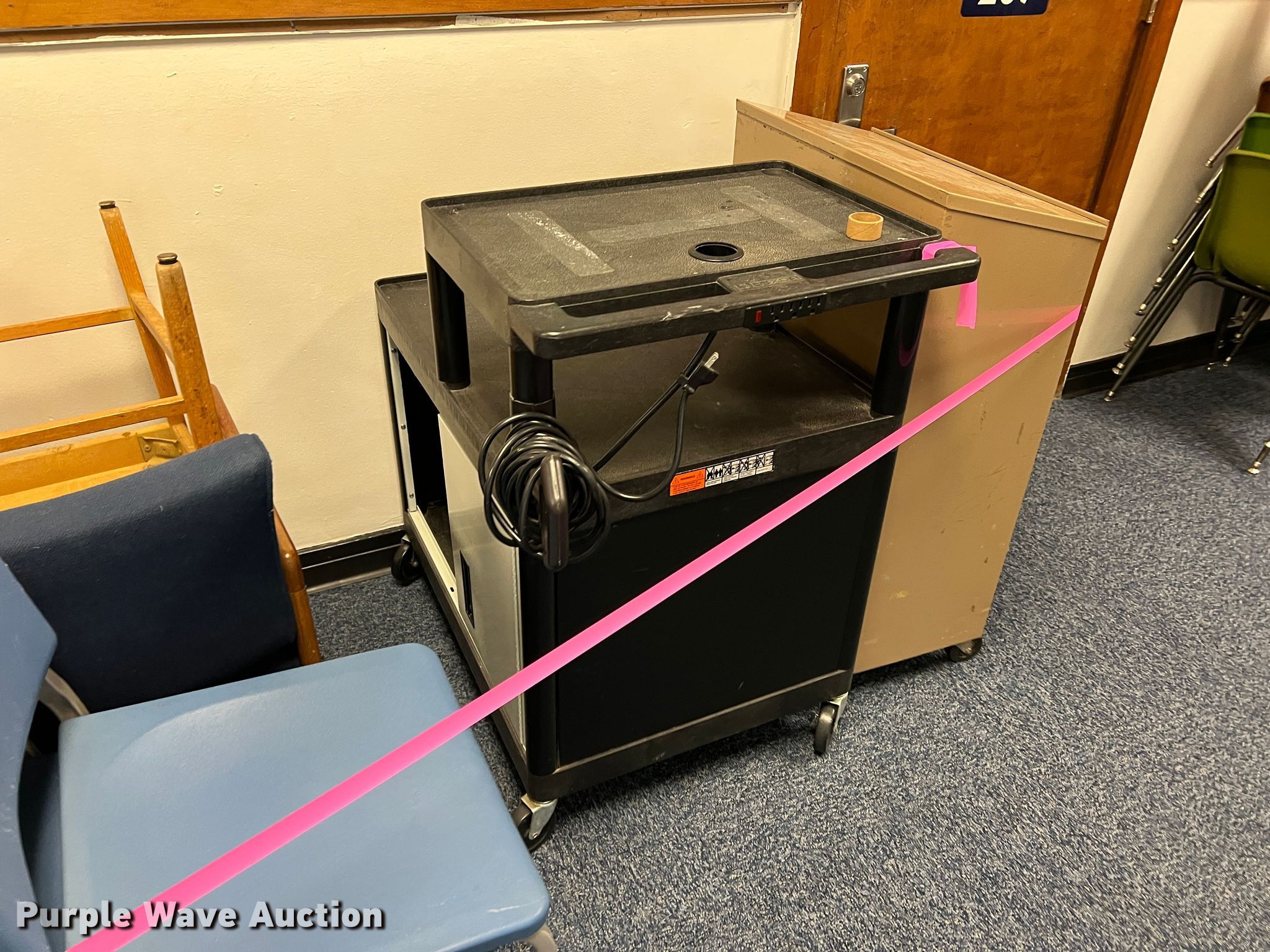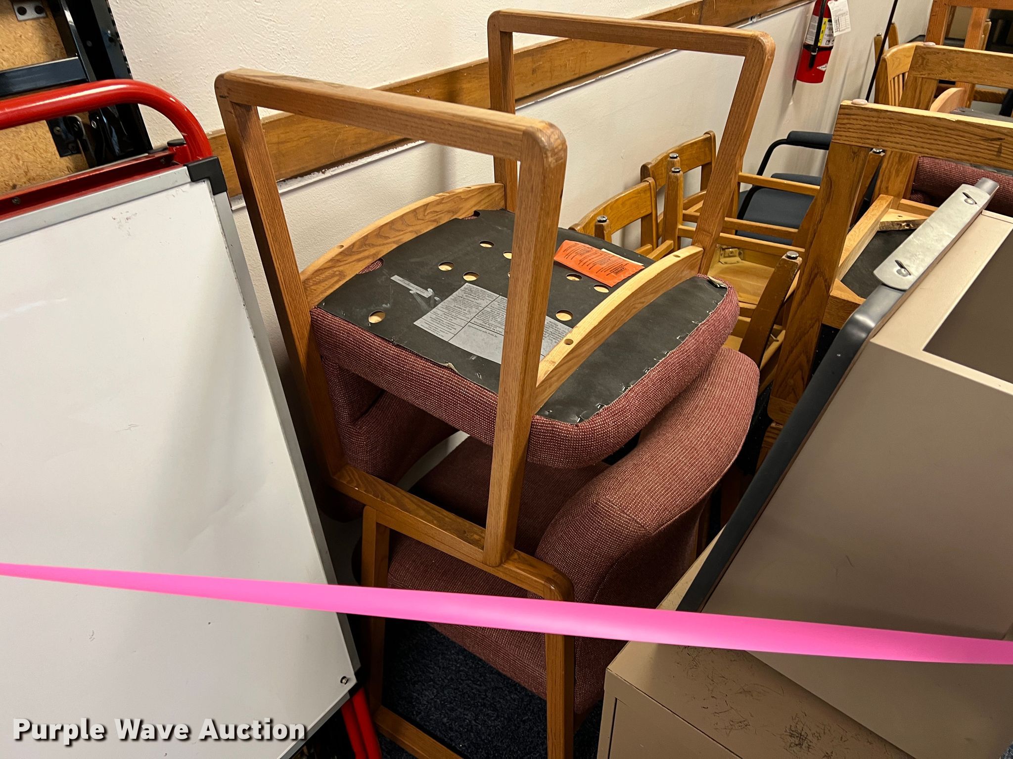 Purple Wave is selling a used Furniture in Kansas. This item is a Furniture with the following: Two drawer filing cabinets, Approx. 20 chairs, Wood cabinet, Audio visual cart, Metal shelf