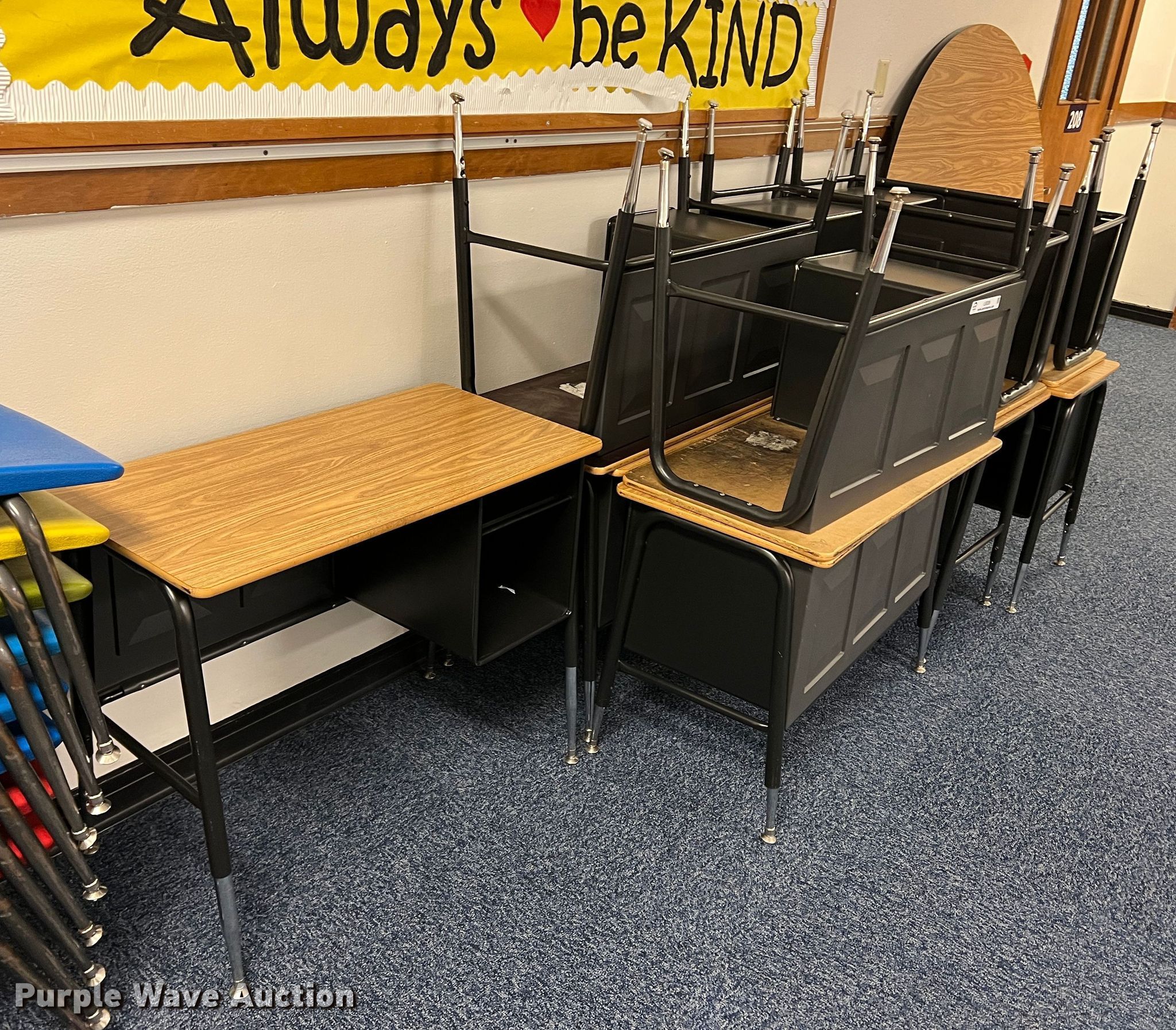 Purple Wave is selling a used Furniture in Kansas. This item is a Furniture with the following: (9) desks, U-shaped table, 66" wide