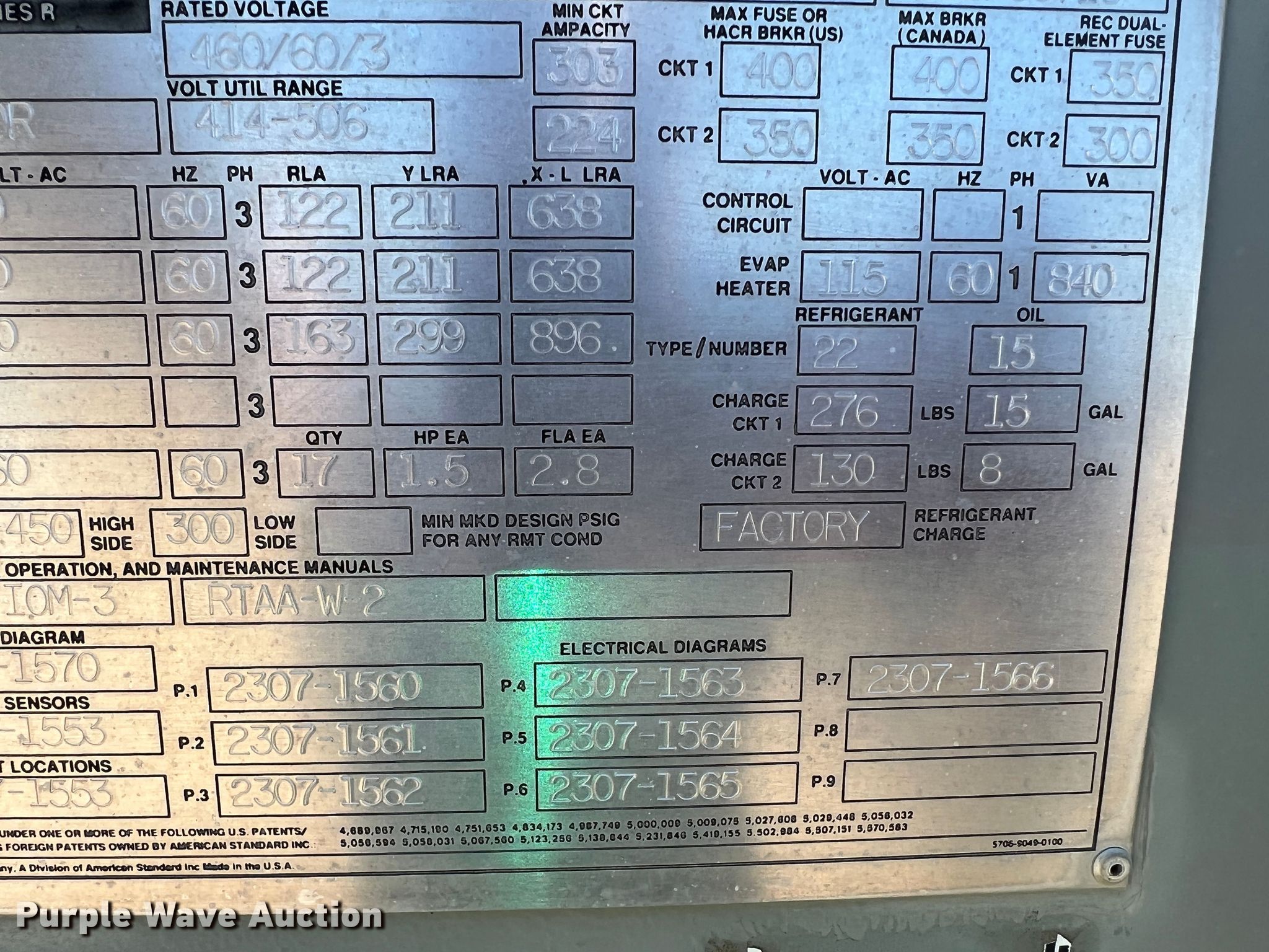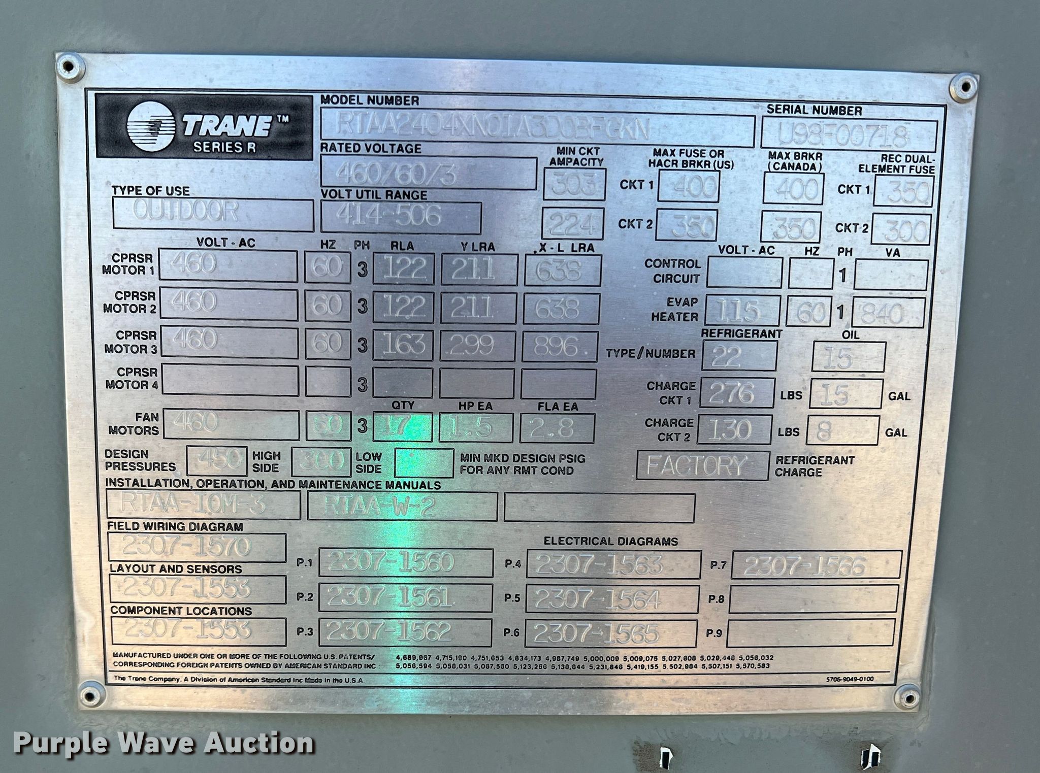 Purple Wave is selling a used Appliances in Kansas. This item is a Trane RTAA2404XN01A3D0BFGRN AC unit with the following: 300 ton, 414-506V, 37'L x 90"W, Serial: U98F00718