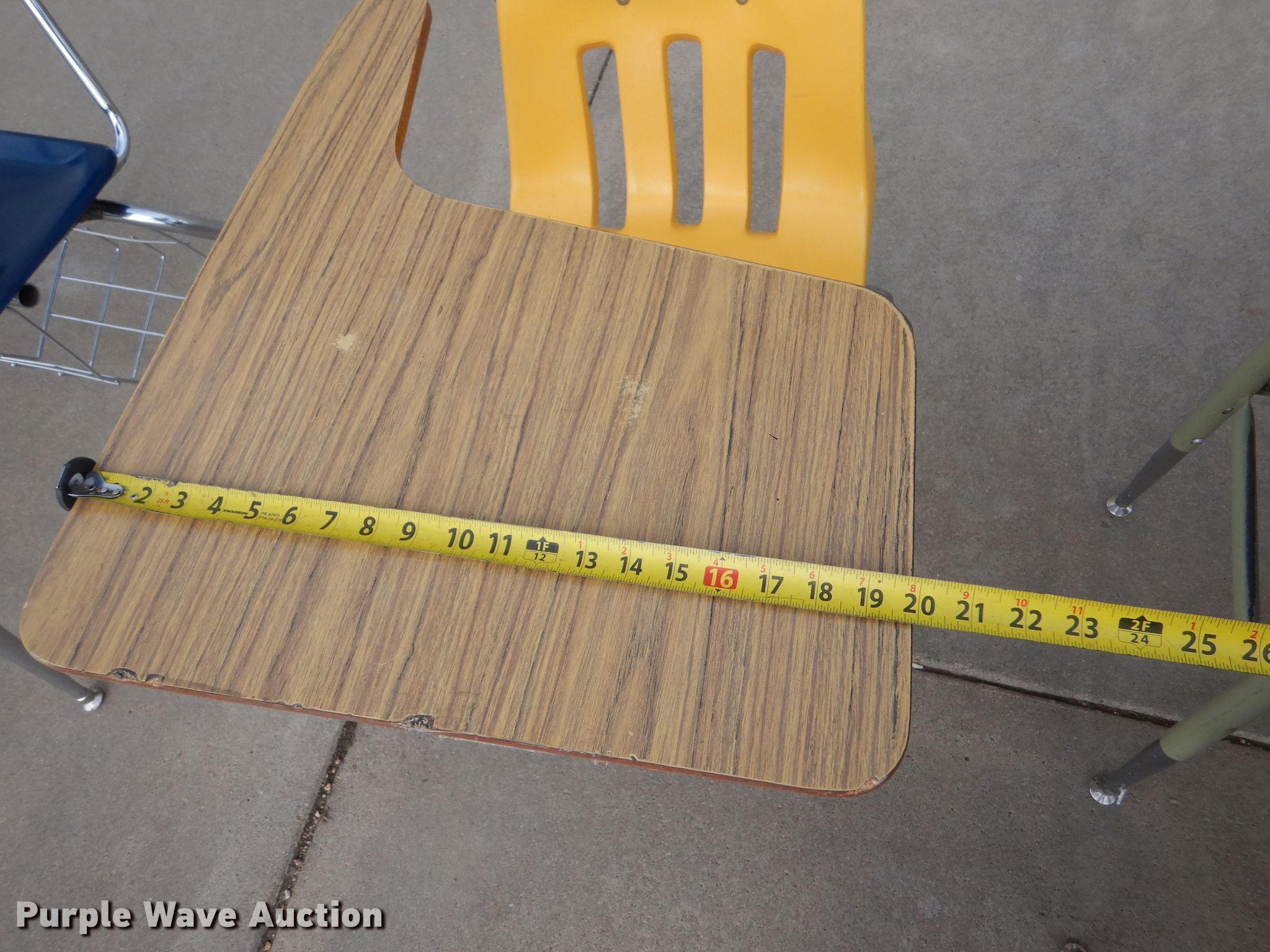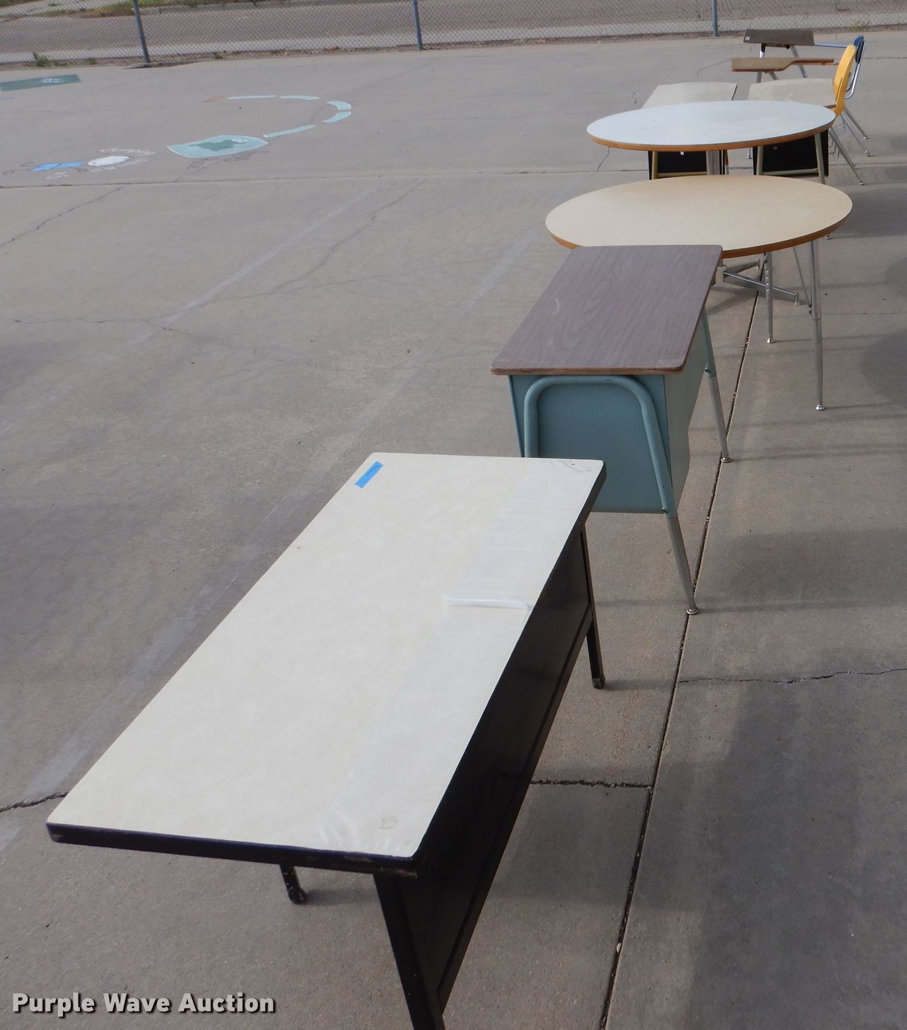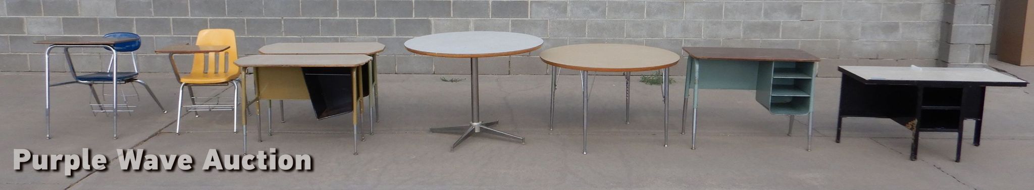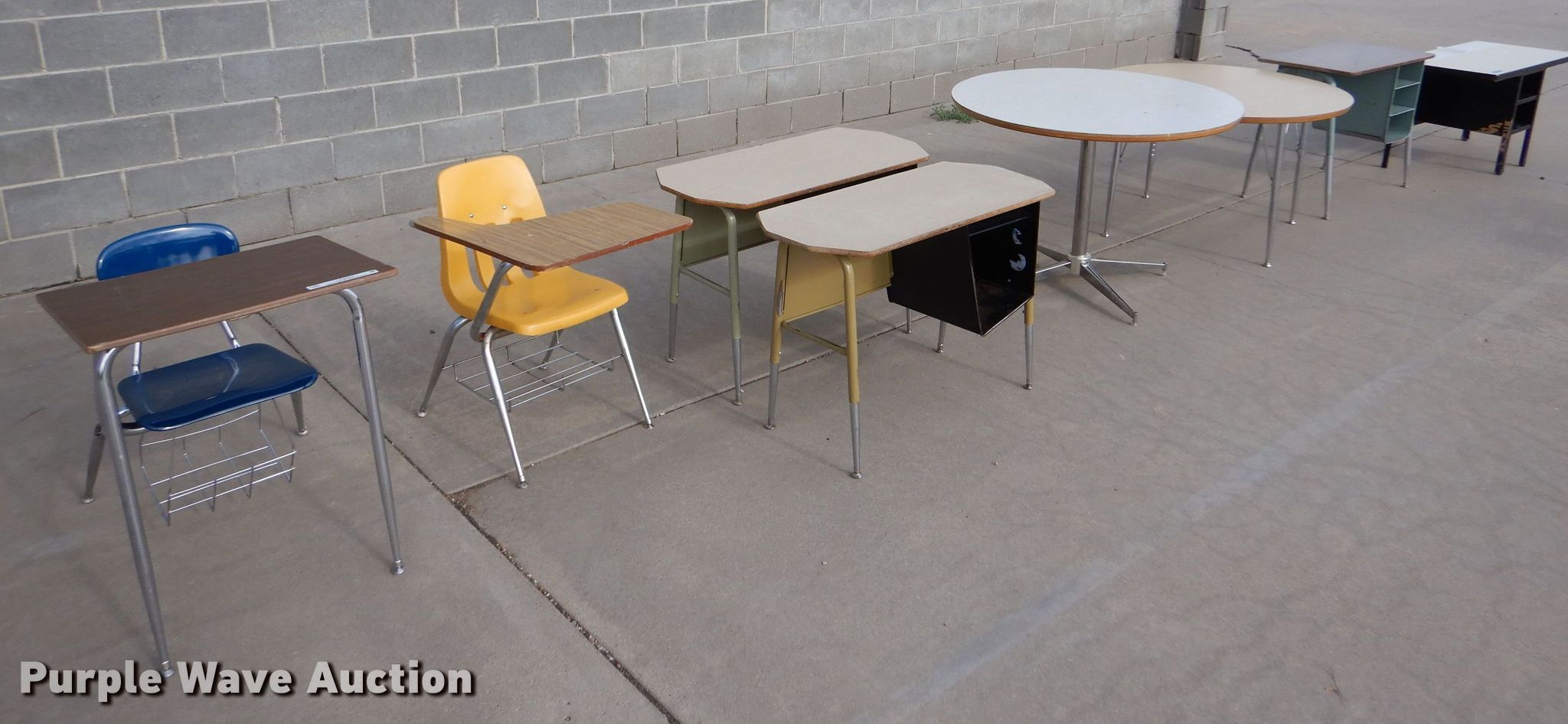 Purple Wave is selling a used Furniture in Kansas. This item is a Furniture with the following: Approx. 24 desks with chairs, (8) desks, 42" x 21" x 23", (6) desks, 38" x 18" x 26",, Approx. 20 desks, 35" x 18" x 28", (2) tables