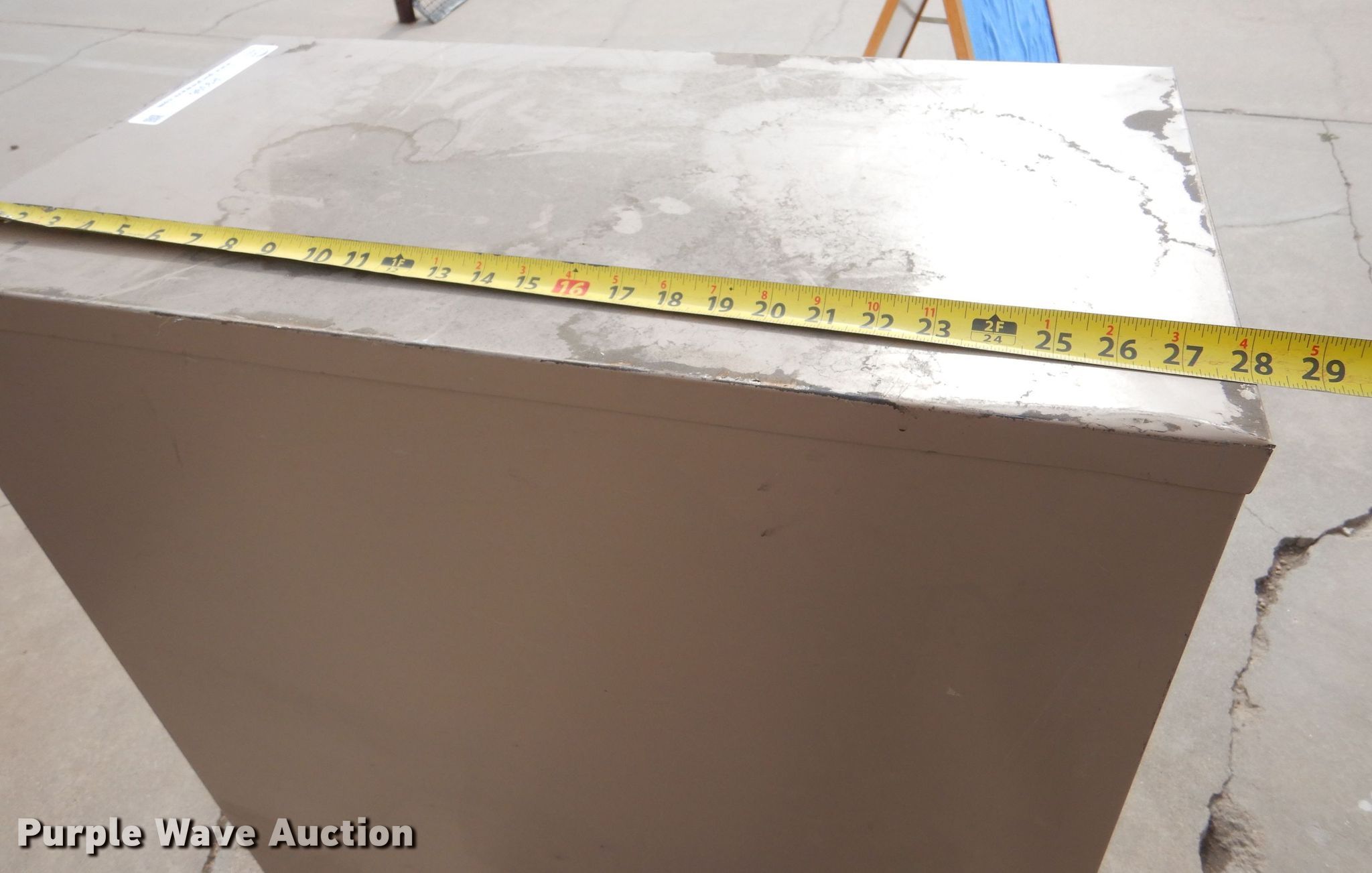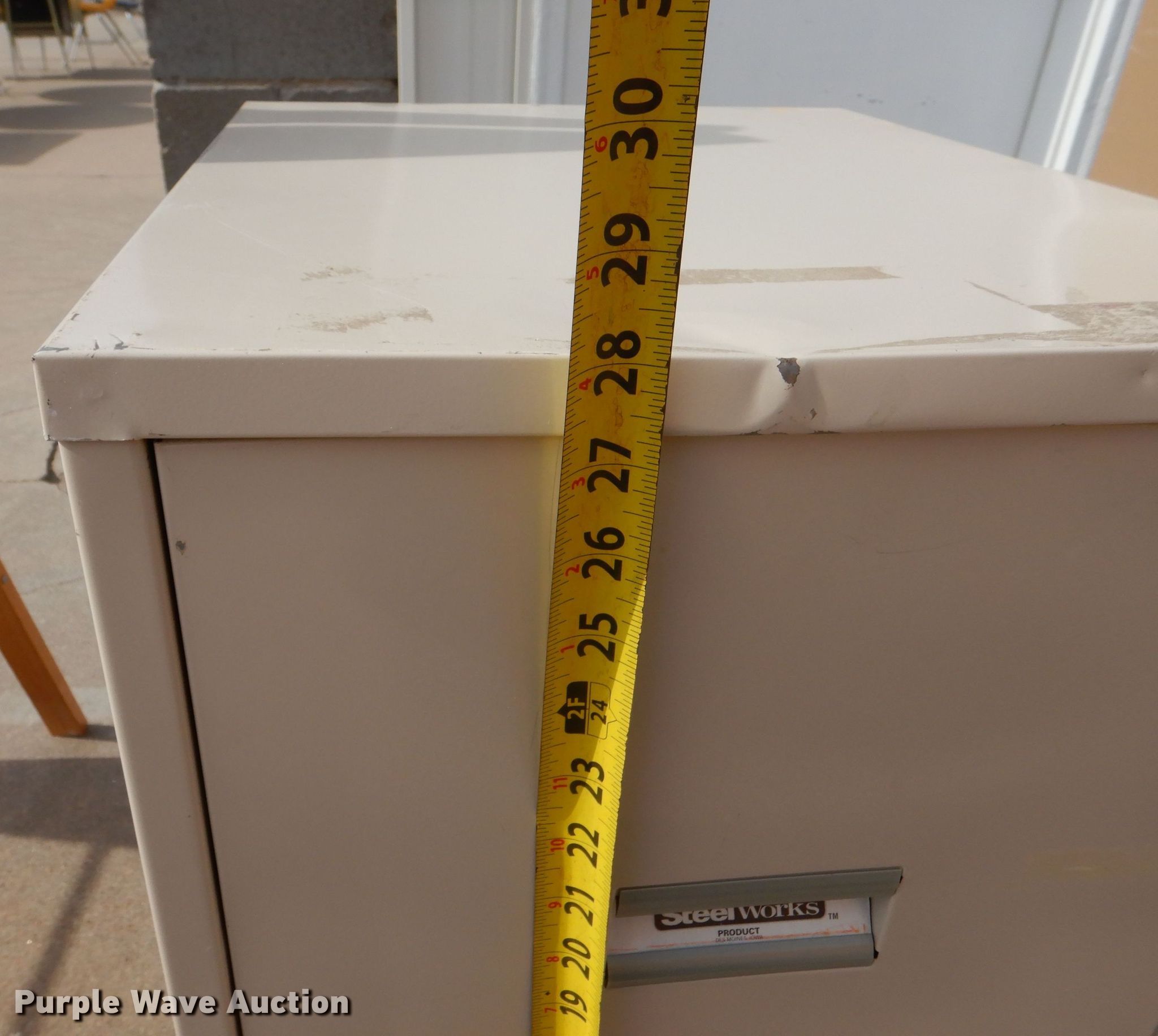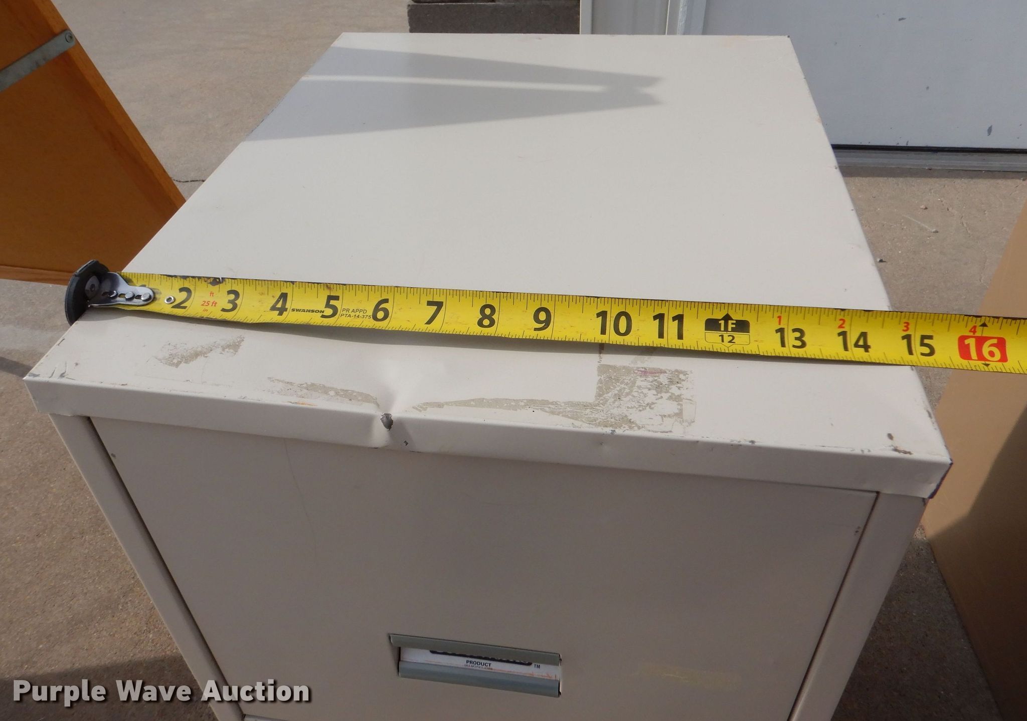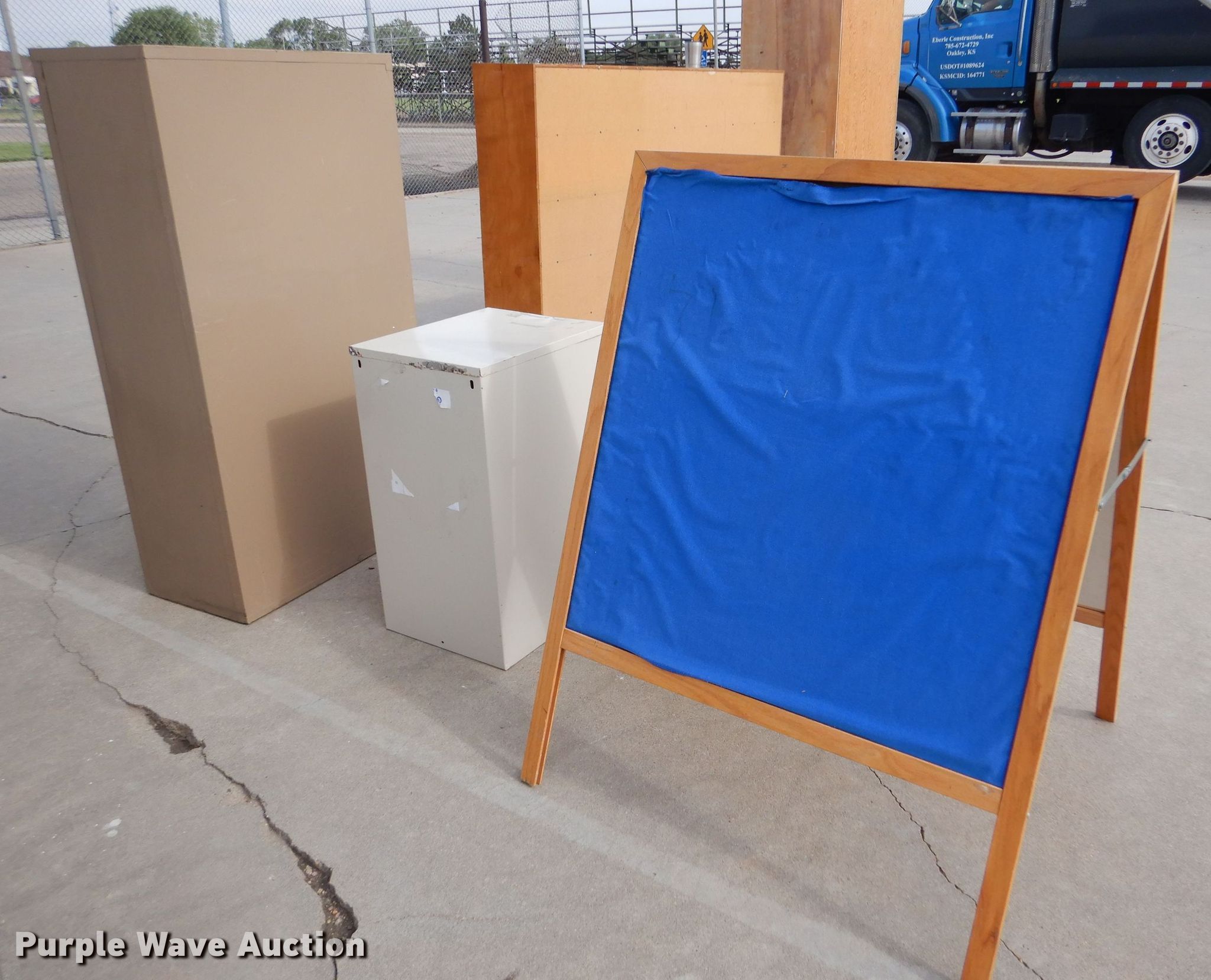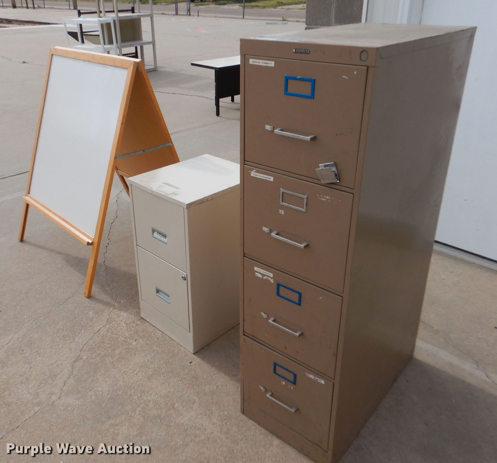 Purple Wave is selling a used Office Supplies and Equip. in Kansas. This item is a Office equipment with the following: (10) two drawer filing cabinet, (9) four drawer filing cabinet, White board easel