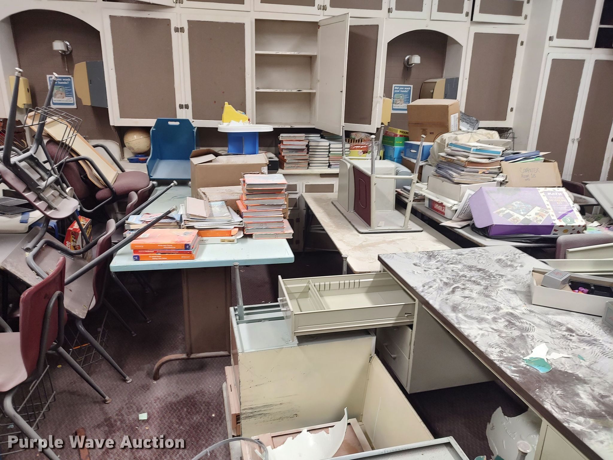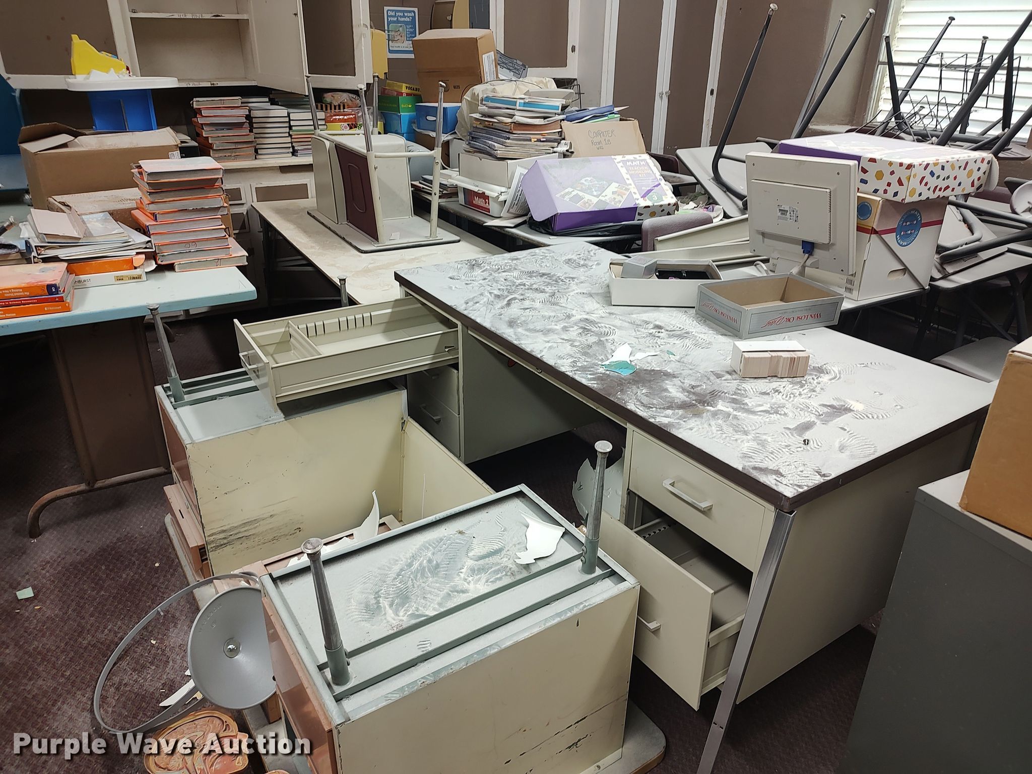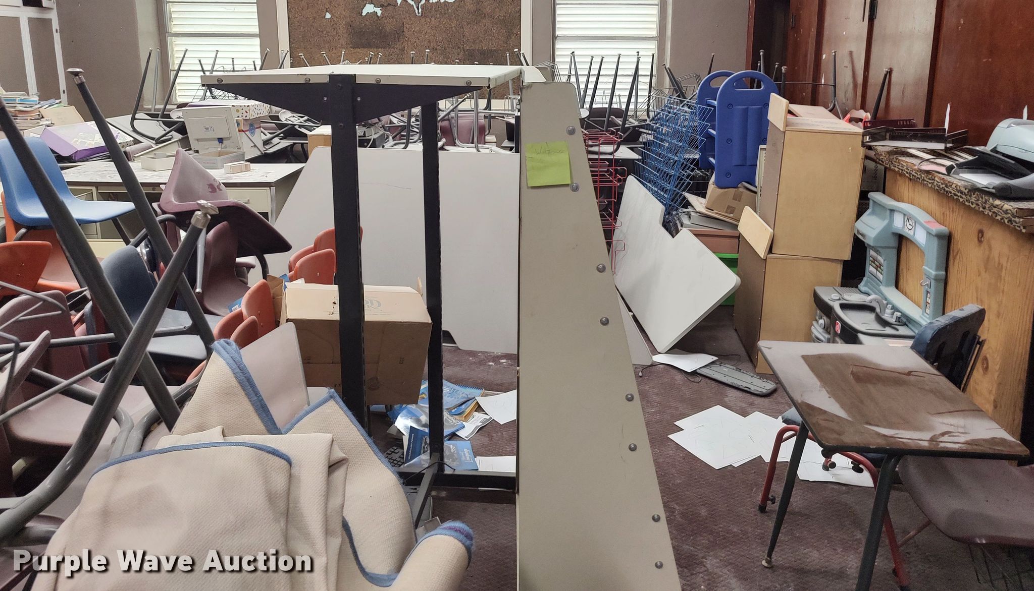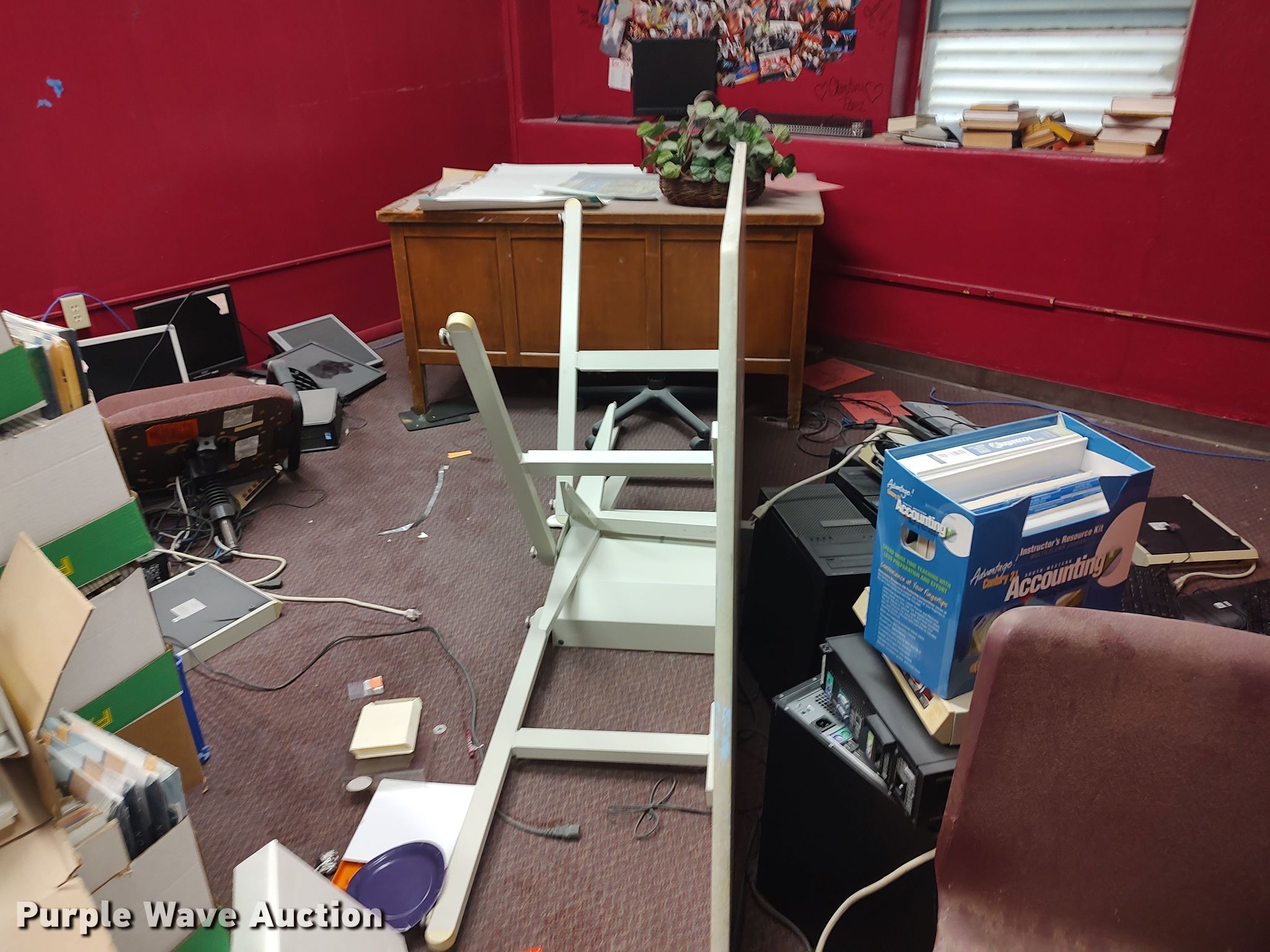 Purple Wave is selling a used Office Supplies and Equip. in Oklahoma. This item is a Office supplies and equipment with the following: Desks, Chairs, Magazine racks, Electronics, Textbooks, File cabinets
