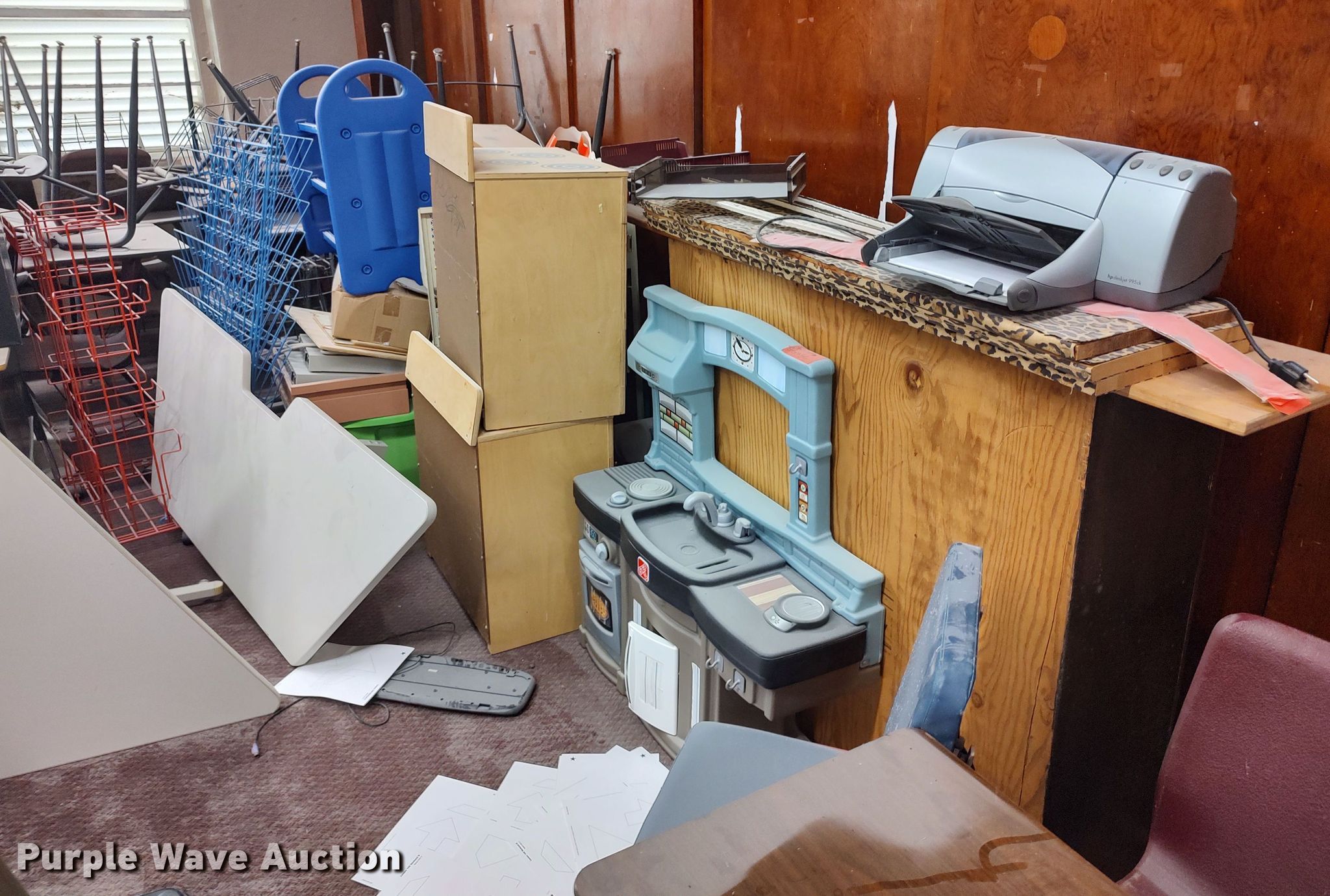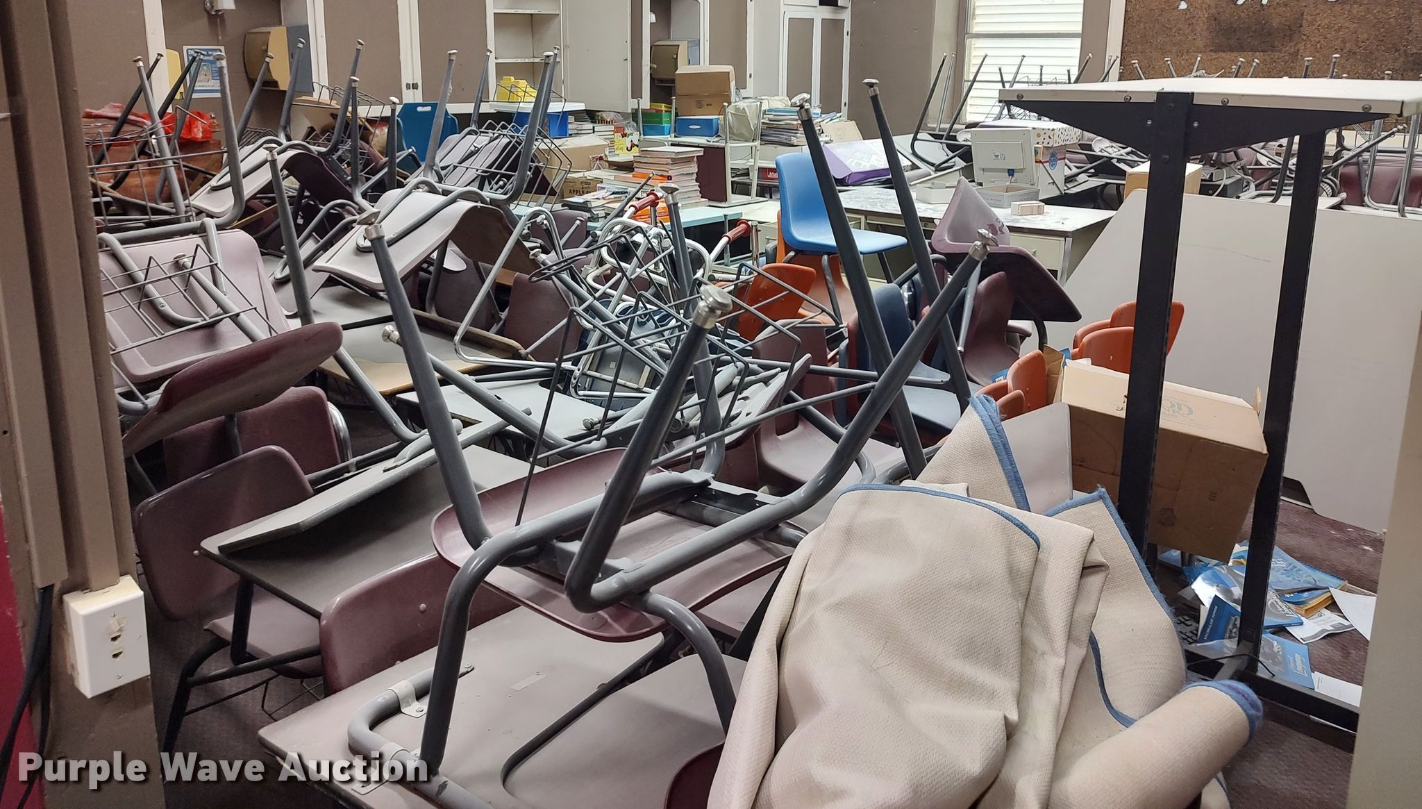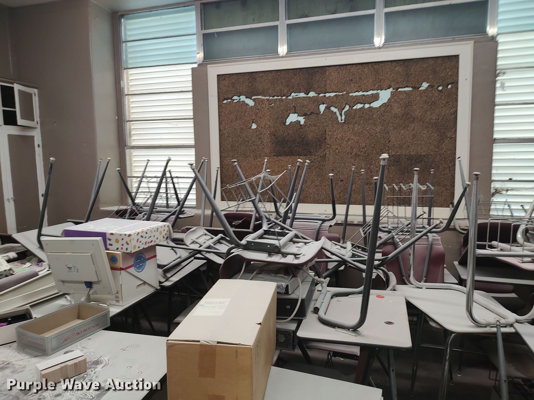 Purple Wave is selling a used Office Supplies and Equip. in Oklahoma. This item is a Office supplies and equipment with the following: Desks, Chairs, Magazine racks, Electronics, Textbooks, File cabinets