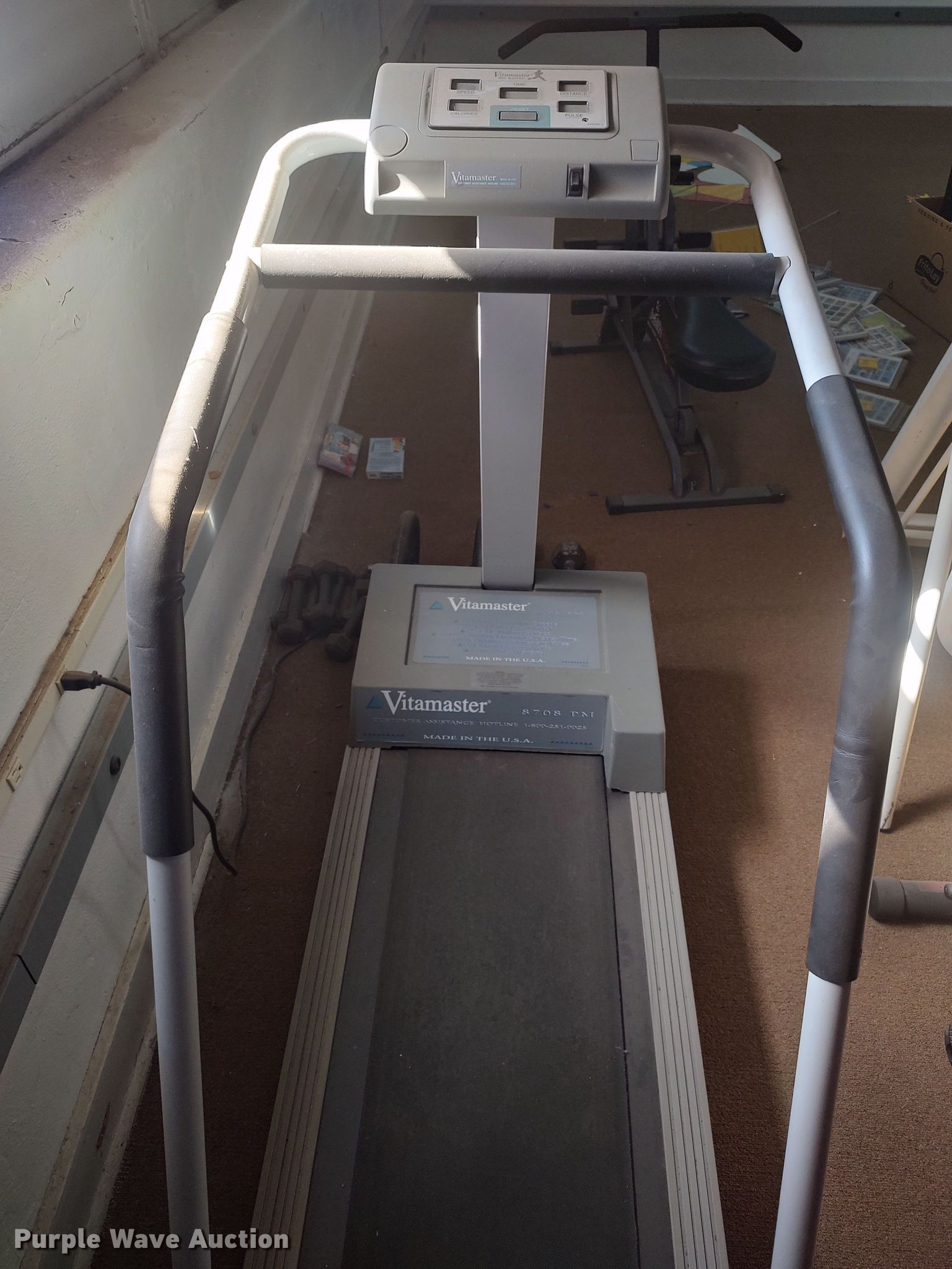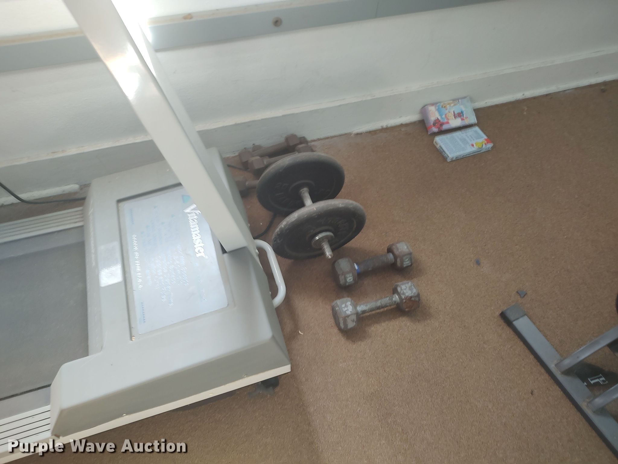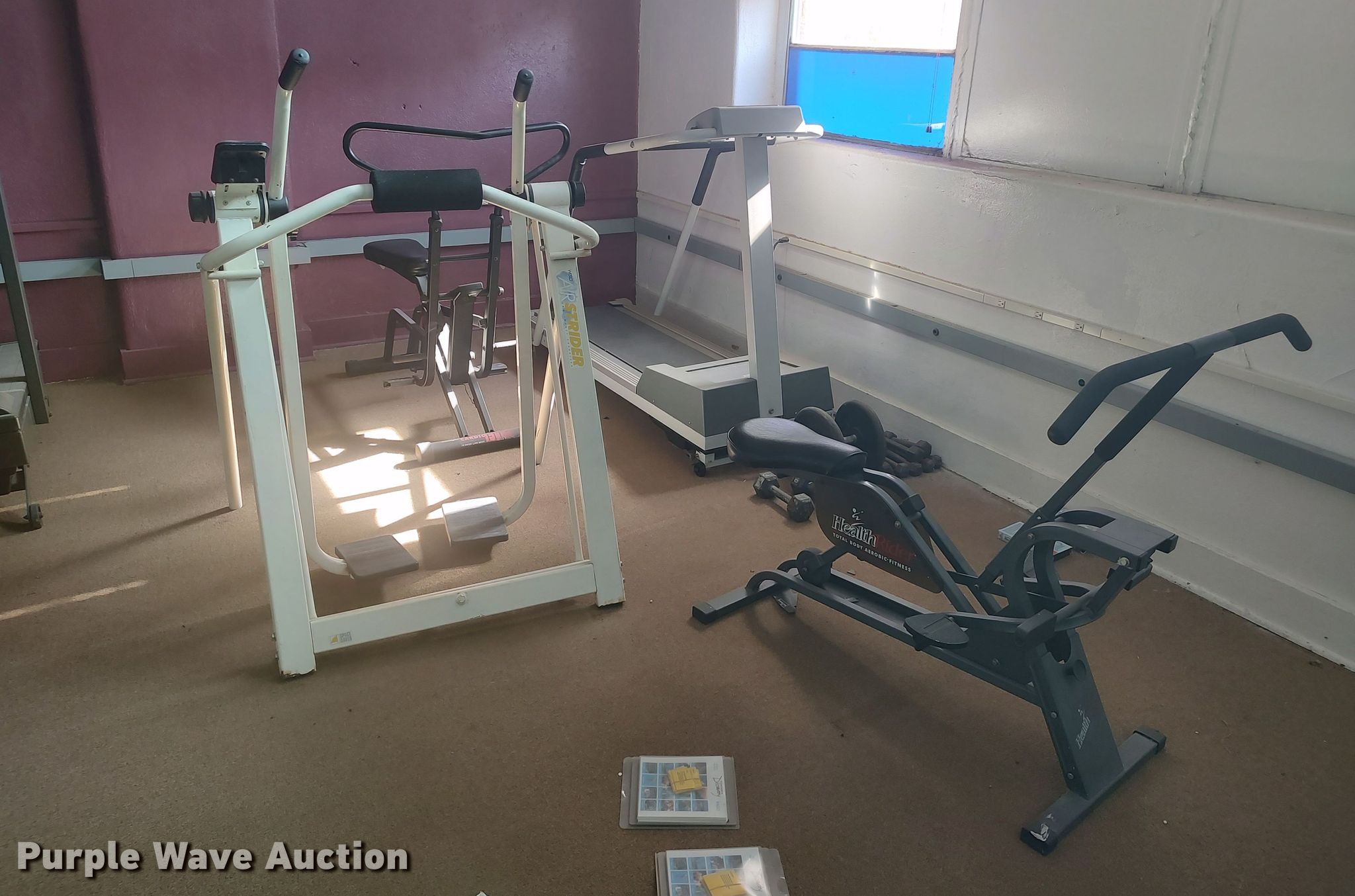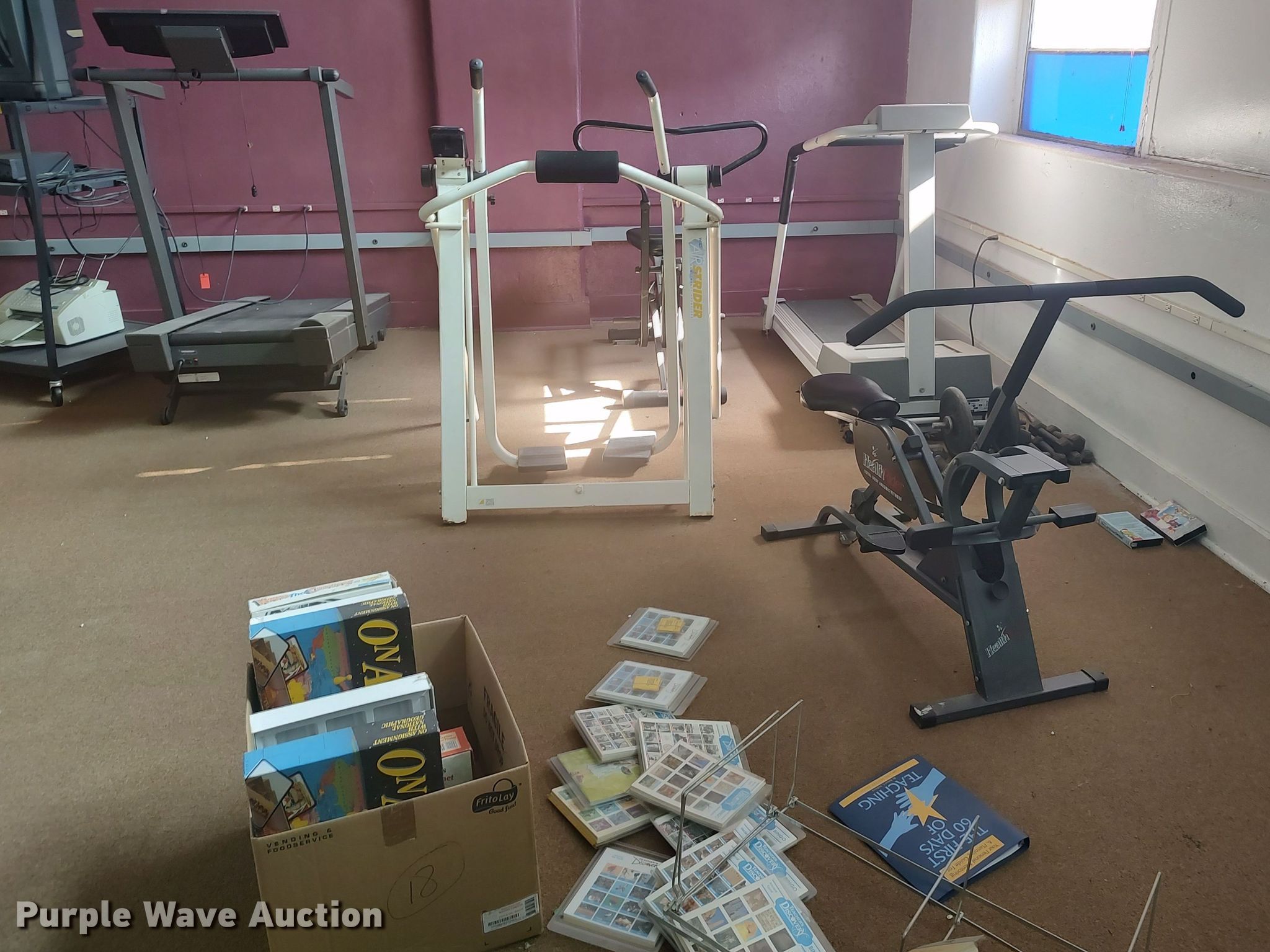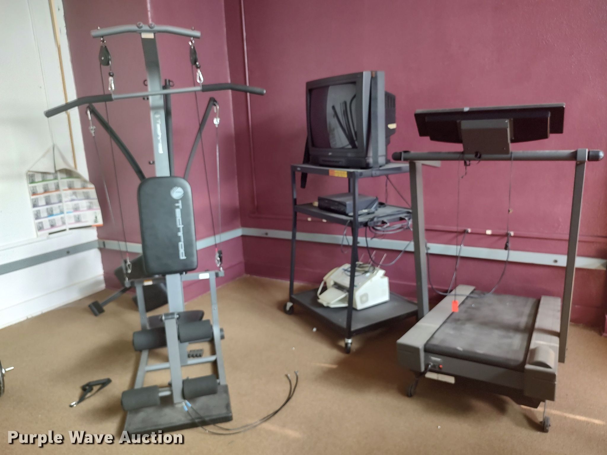 Purple Wave is selling a used Sporting Goods in Oklahoma. This item is a Exercise equipment with the following: (2) treadmills, Elliptical, (2) lat machines, Dumbbells, Water fountain