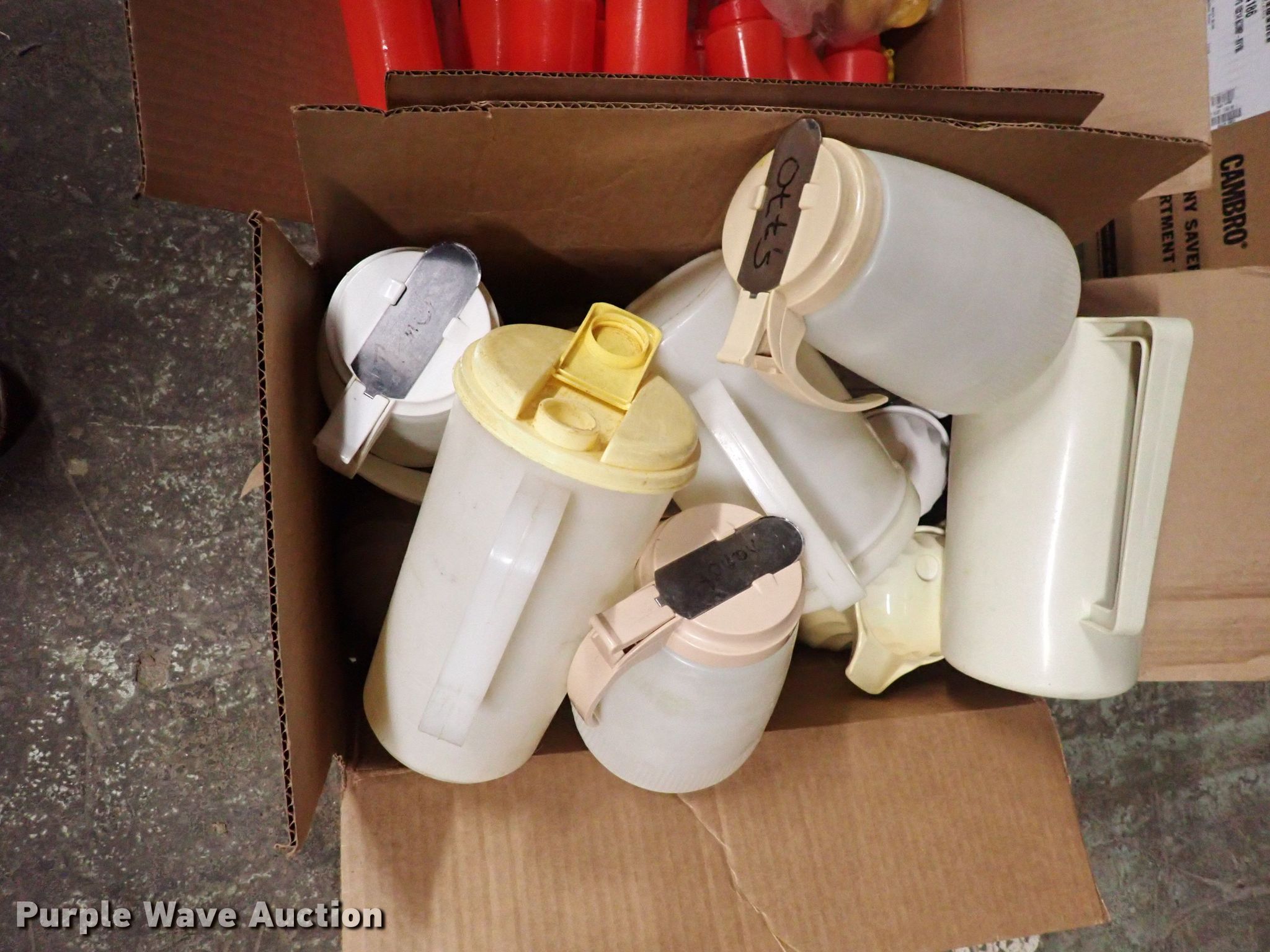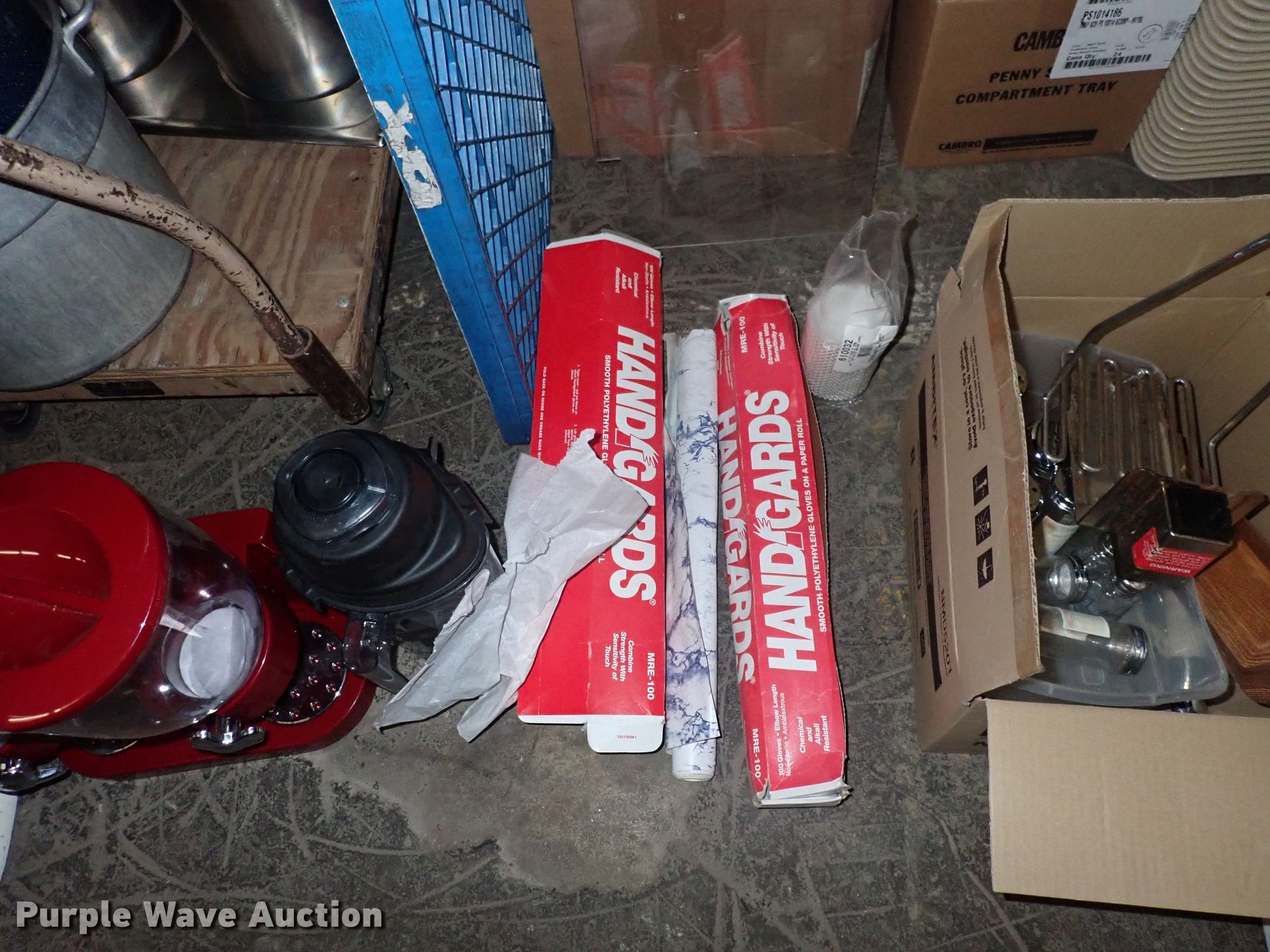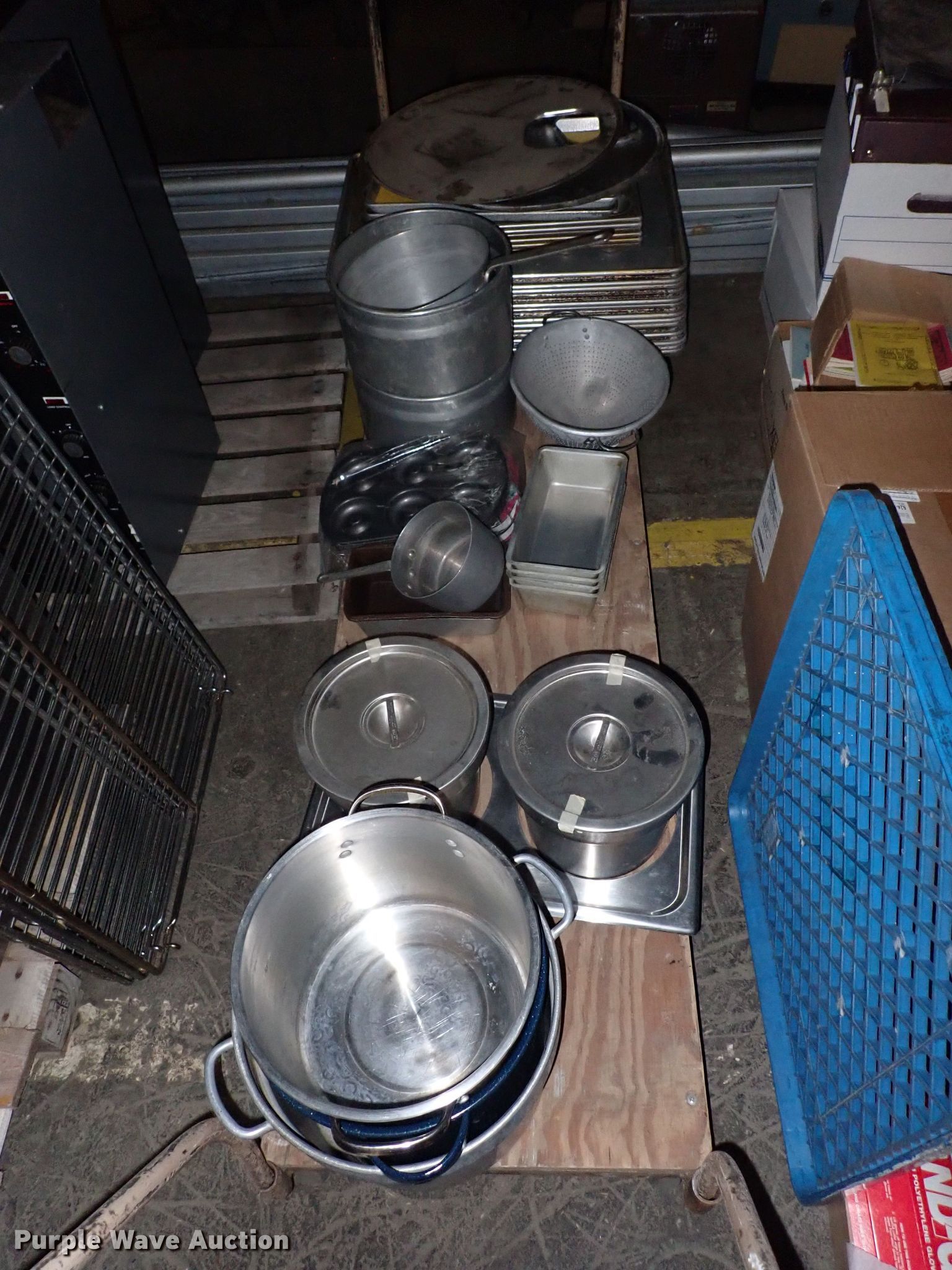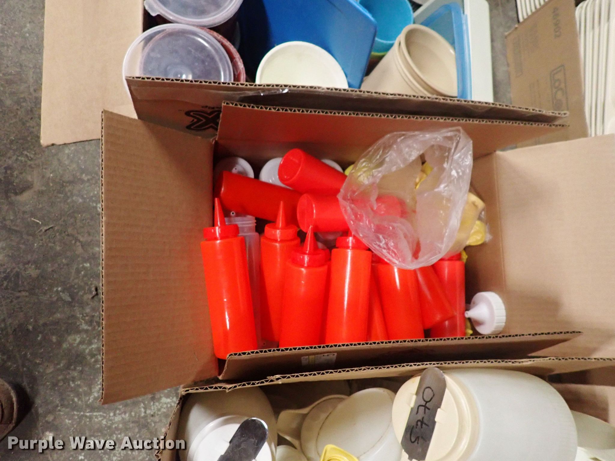 Purple Wave is selling a used Restaurant Equip. in Kansas. This item is a Restaurant equipment with the following: Pitchers, Ketchup bottles, Plastic ware, Serving trays, Mixer, Dispensers, Metal pots and pans, Gloves and more