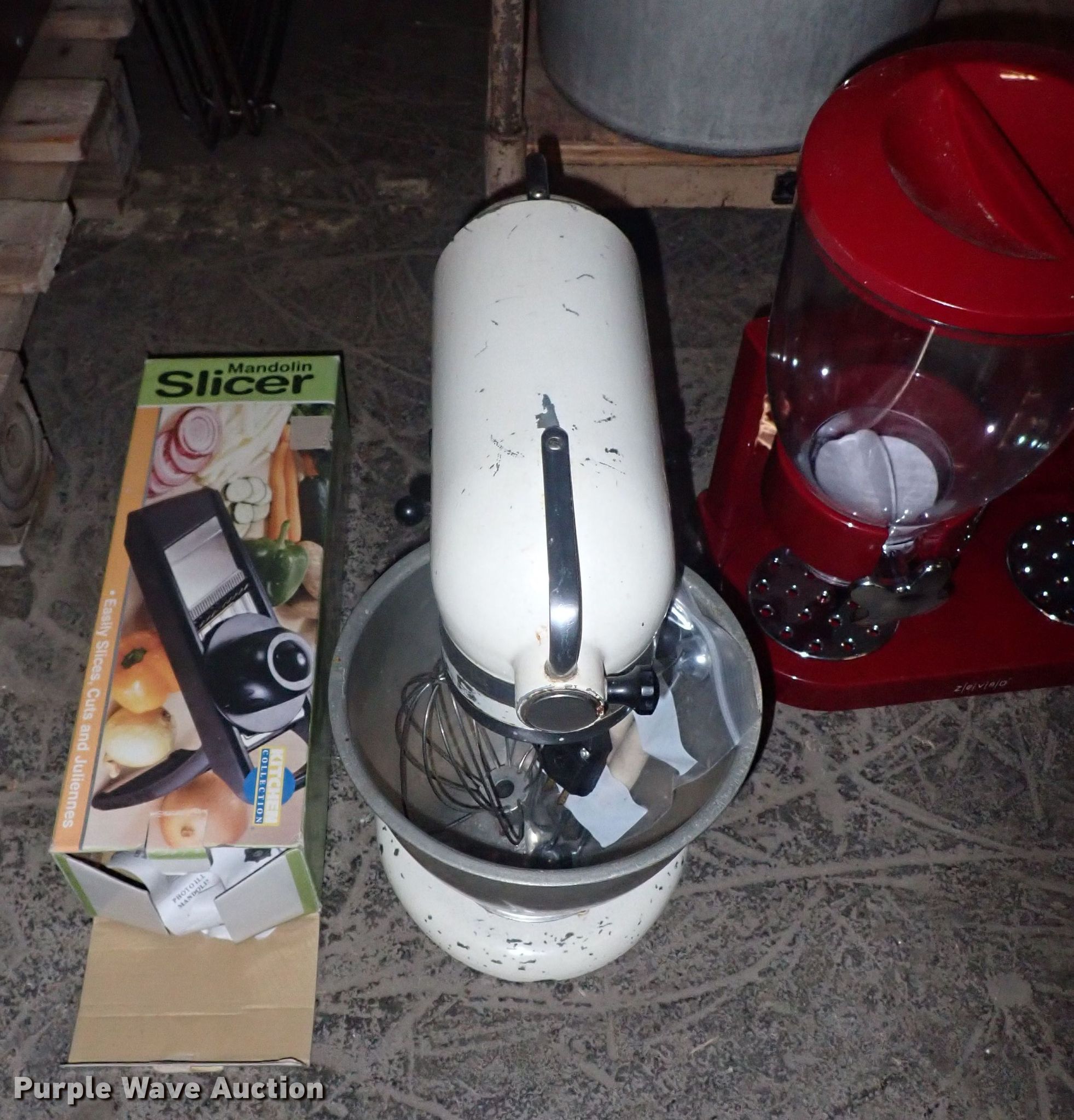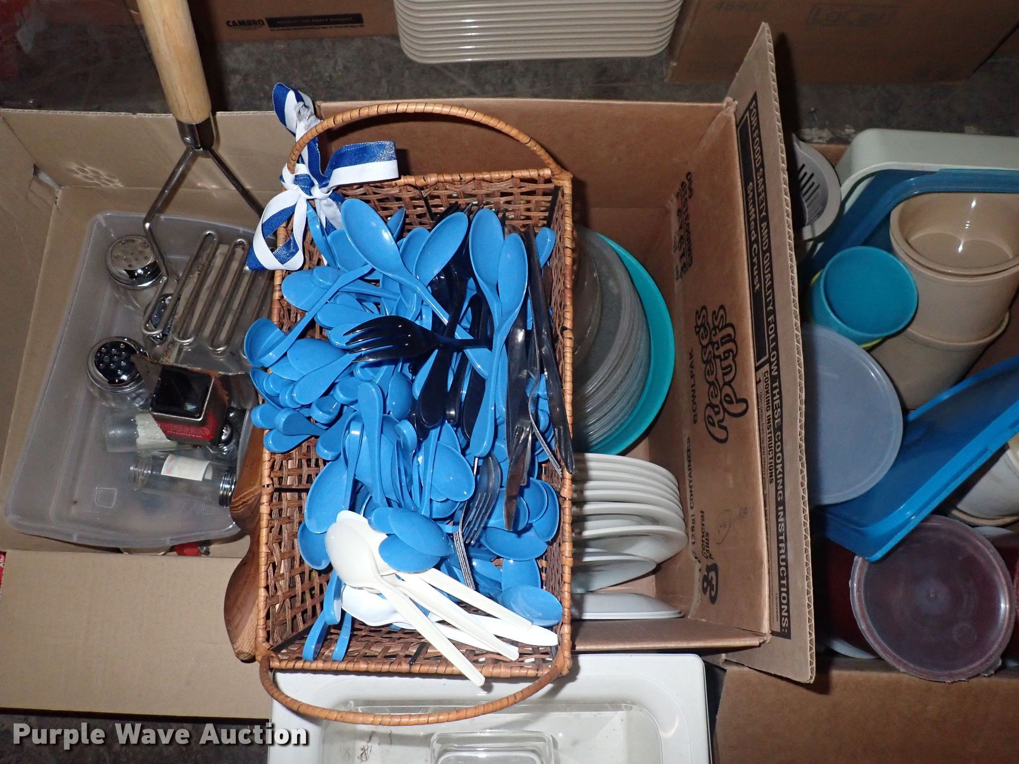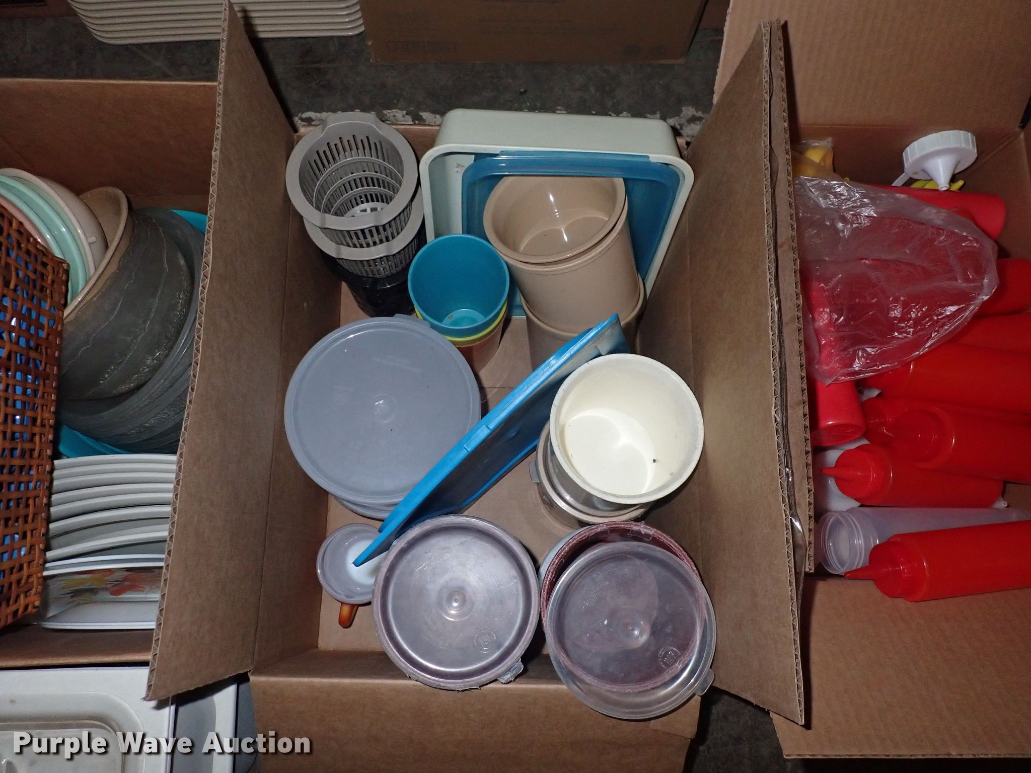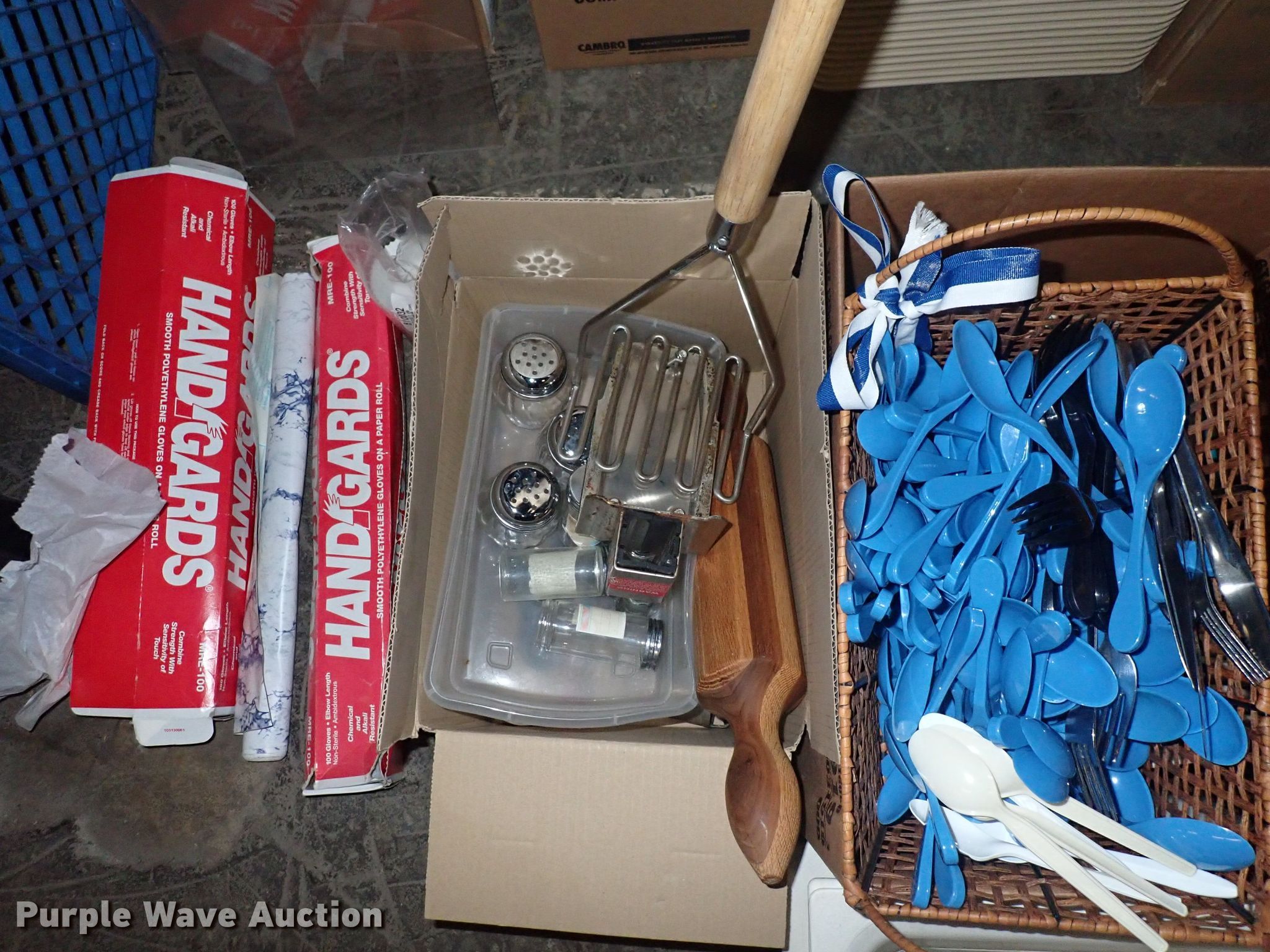 Purple Wave is selling a used Restaurant Equip. in Kansas. This item is a Restaurant equipment with the following: Pitchers, Ketchup bottles, Plastic ware, Serving trays, Mixer, Dispensers, Metal pots and pans, Gloves and more