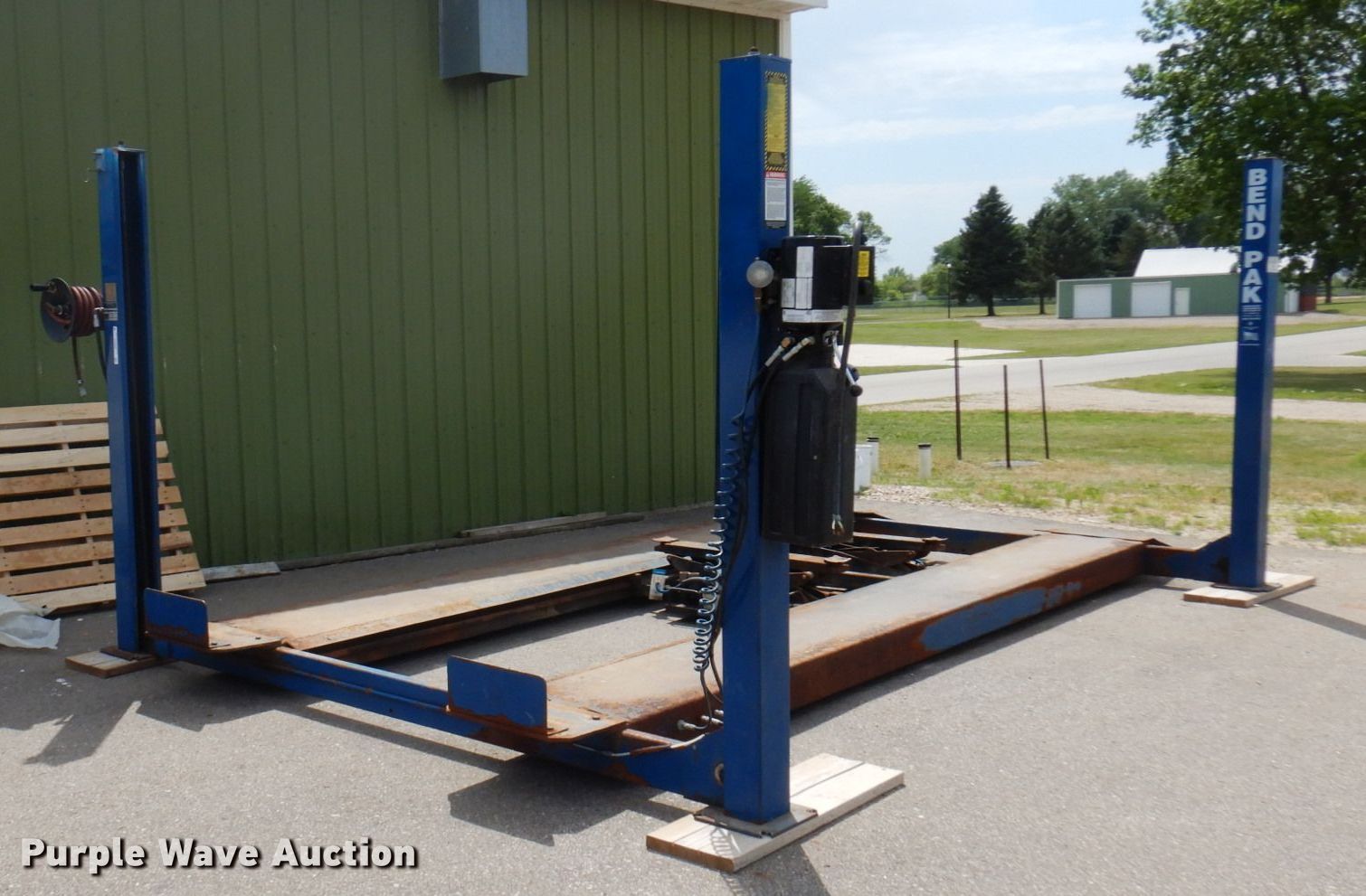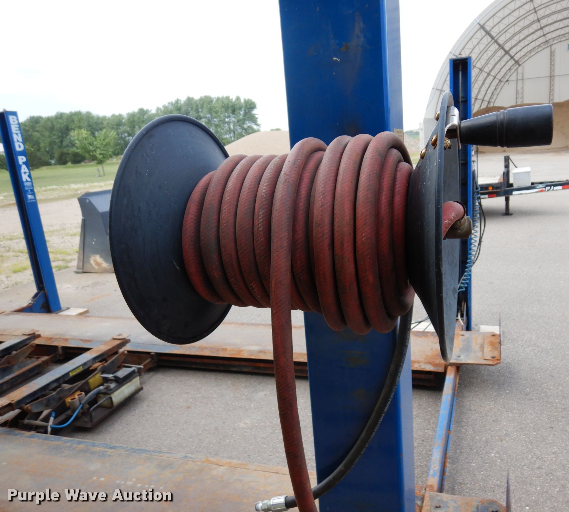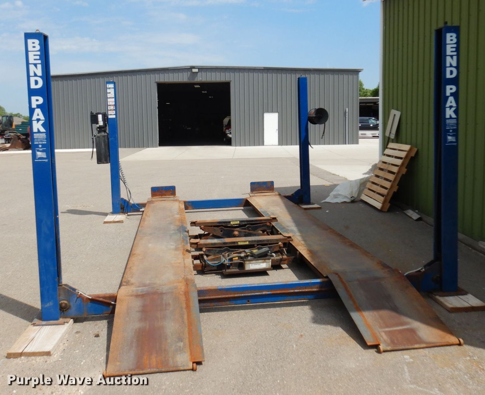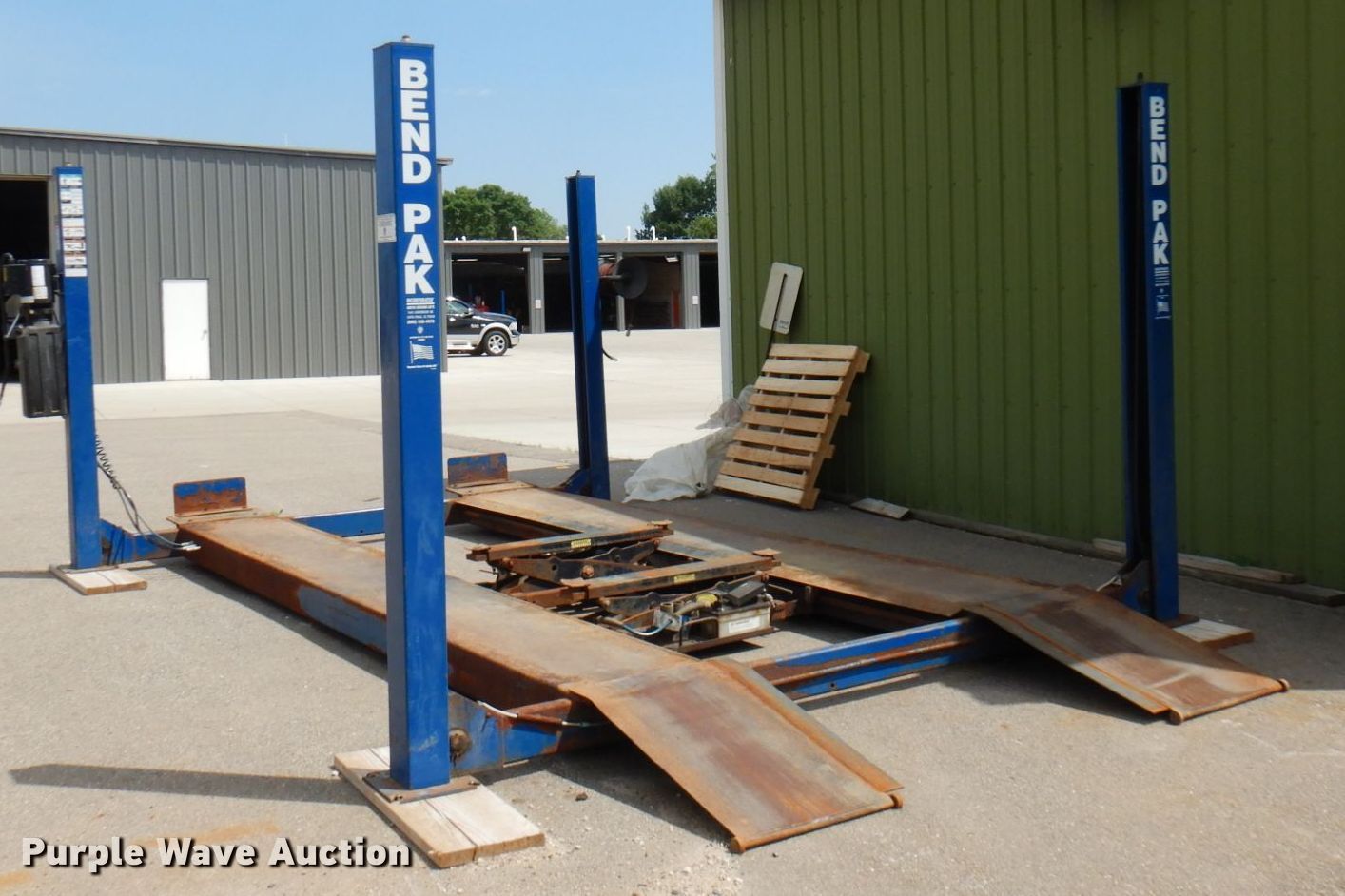Purple Wave is selling a used Tools in Minnesota. This item is a 2004 Bend Pak HD-12SS four post automotive lift with the following: 12,000 lbs capacity, 220V, 18 amps, Hose reel, Pneumatic center sliding jacks, Serial: 50522
