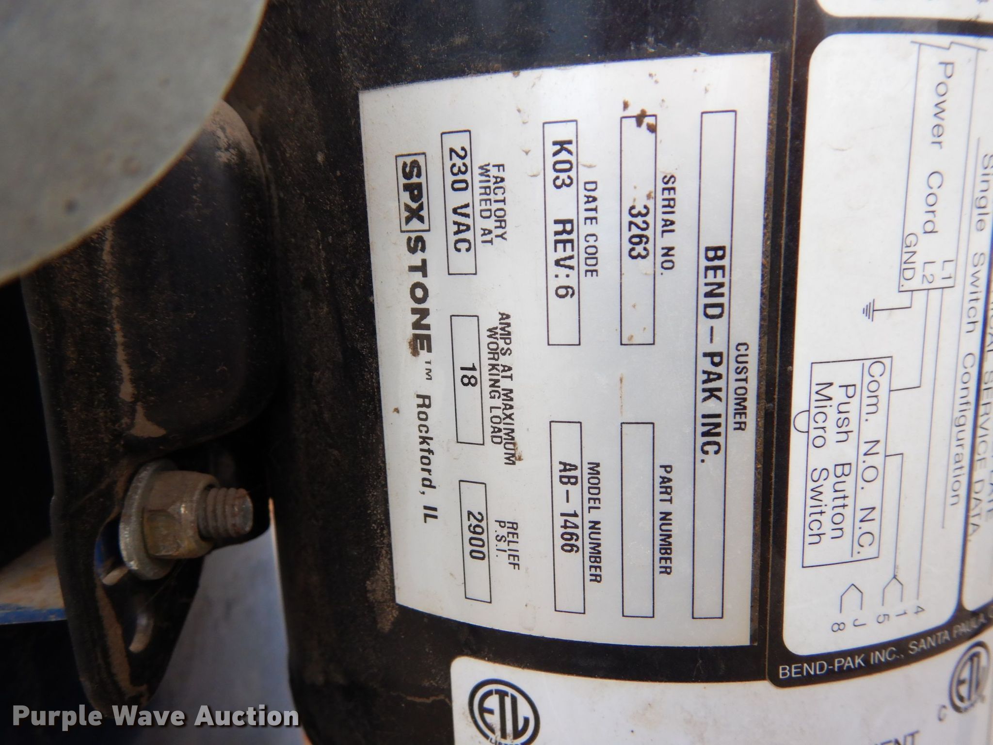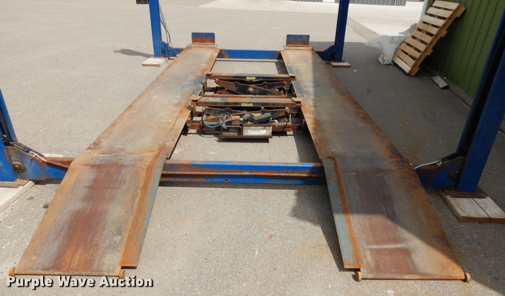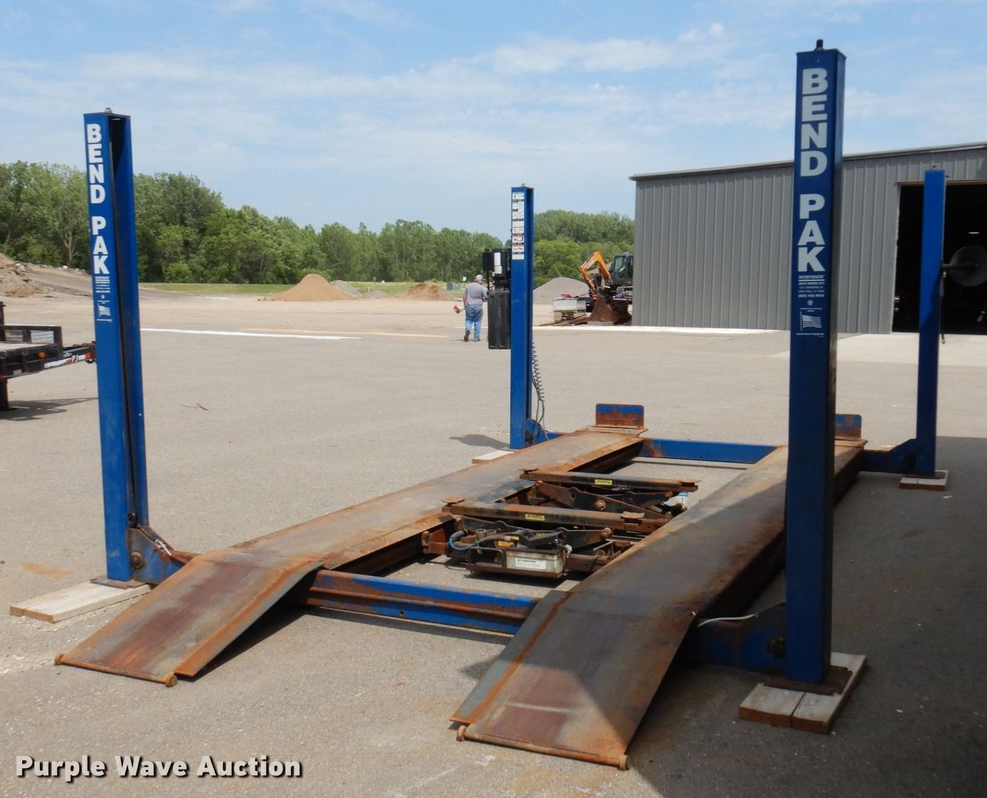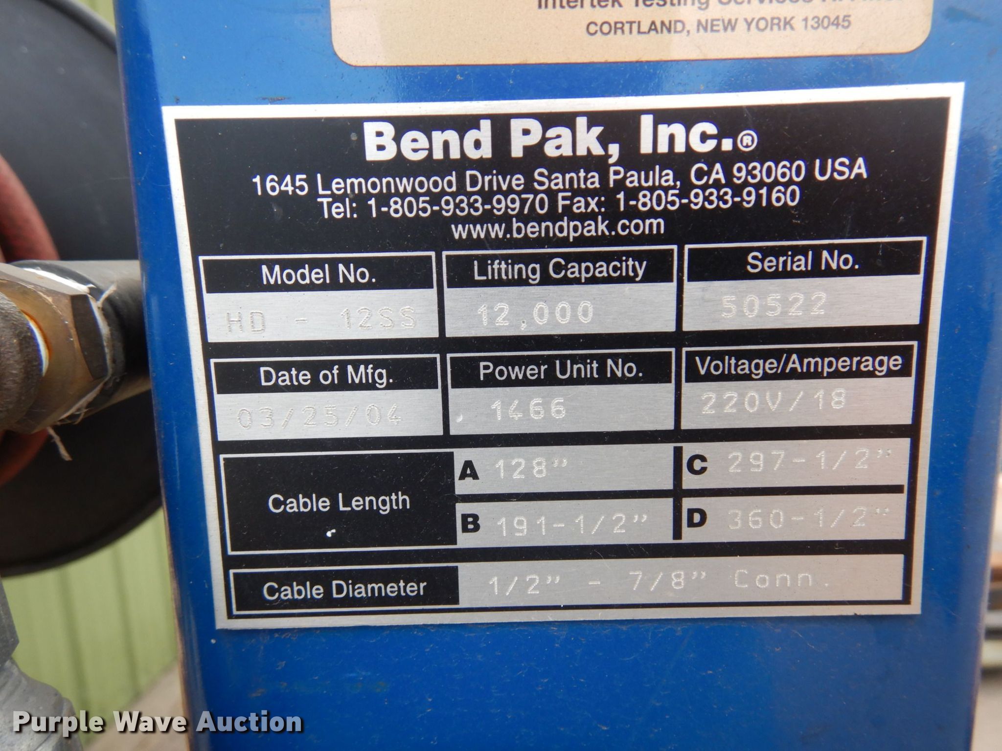 Purple Wave is selling a used Tools in Minnesota. This item is a 2004 Bend Pak HD-12SS four post automotive lift with the following: 12,000 lbs capacity, 220V, 18 amps, Hose reel, Pneumatic center sliding jacks, Serial: 50522