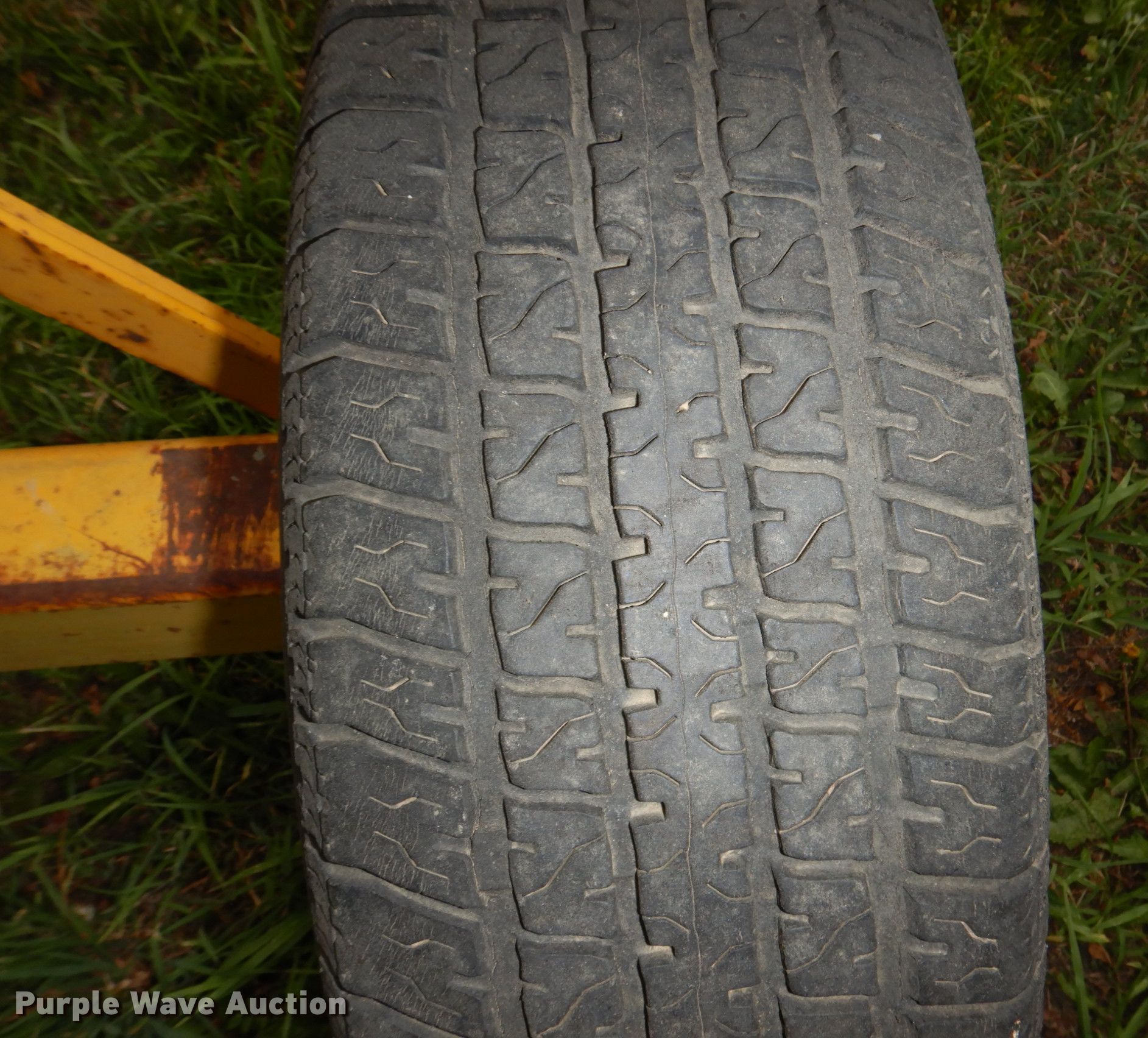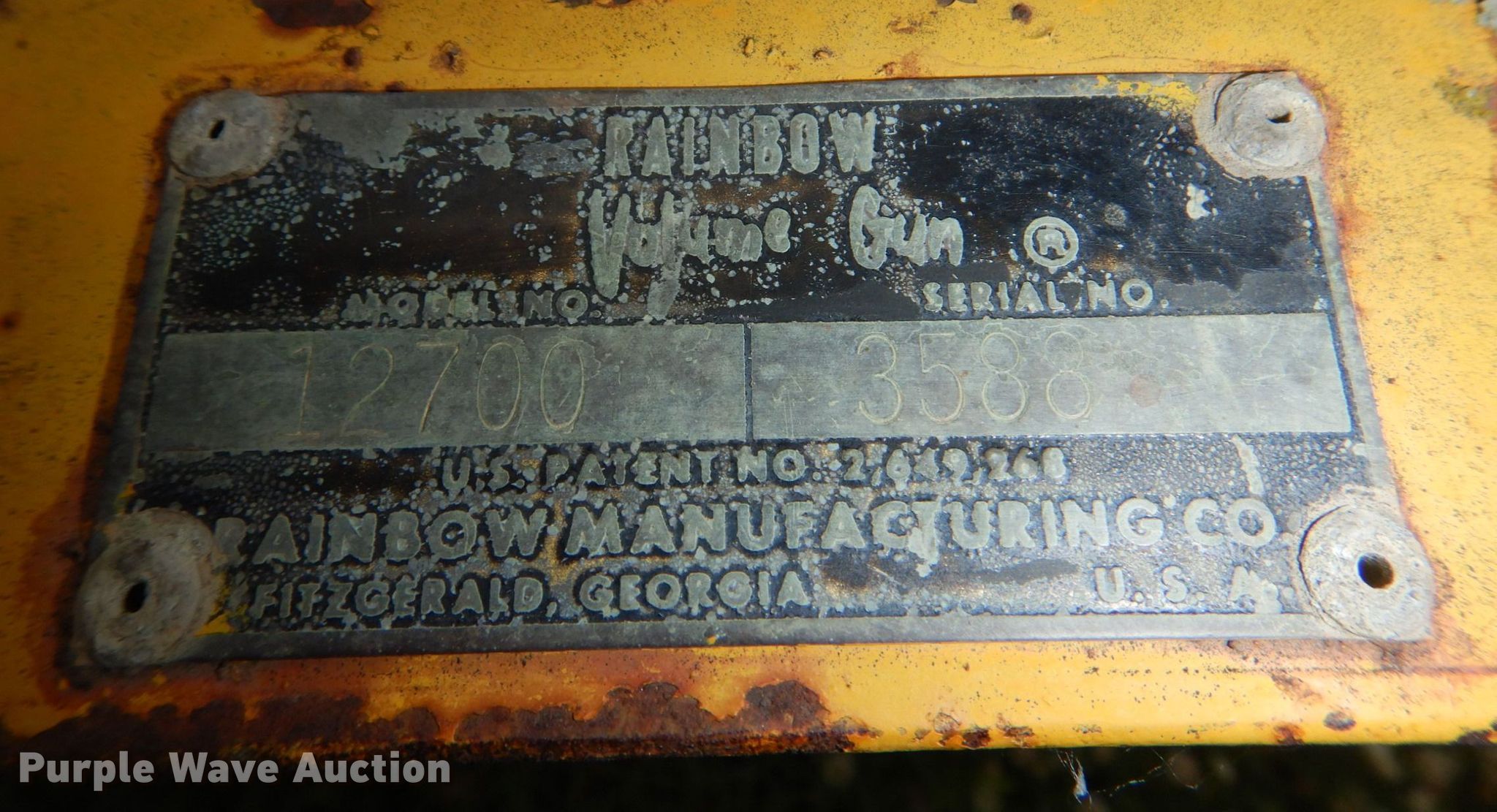Rainbow irrigation gun with hose reel trailer. Rainbow gun Model: 550, Serial: 5160, 6" inlet, Tires: 7.50-14 One tire flat, Rainbow hose reel Model: 2700, Serial: 3588, Hose reel diameter 76", Tires: 215/75R14. Notes Unknown operating condition. GrassPad Inc.. 25110 West Center Road. Waterloo, NE 68069