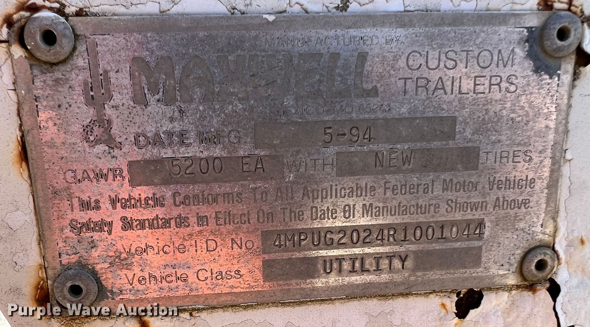 Purple Wave is selling a used Equip. Trailer in Missouri. This item is a 1994 Maxwell equipment trailer with the following: VIN: 4MPUG2024R1001044