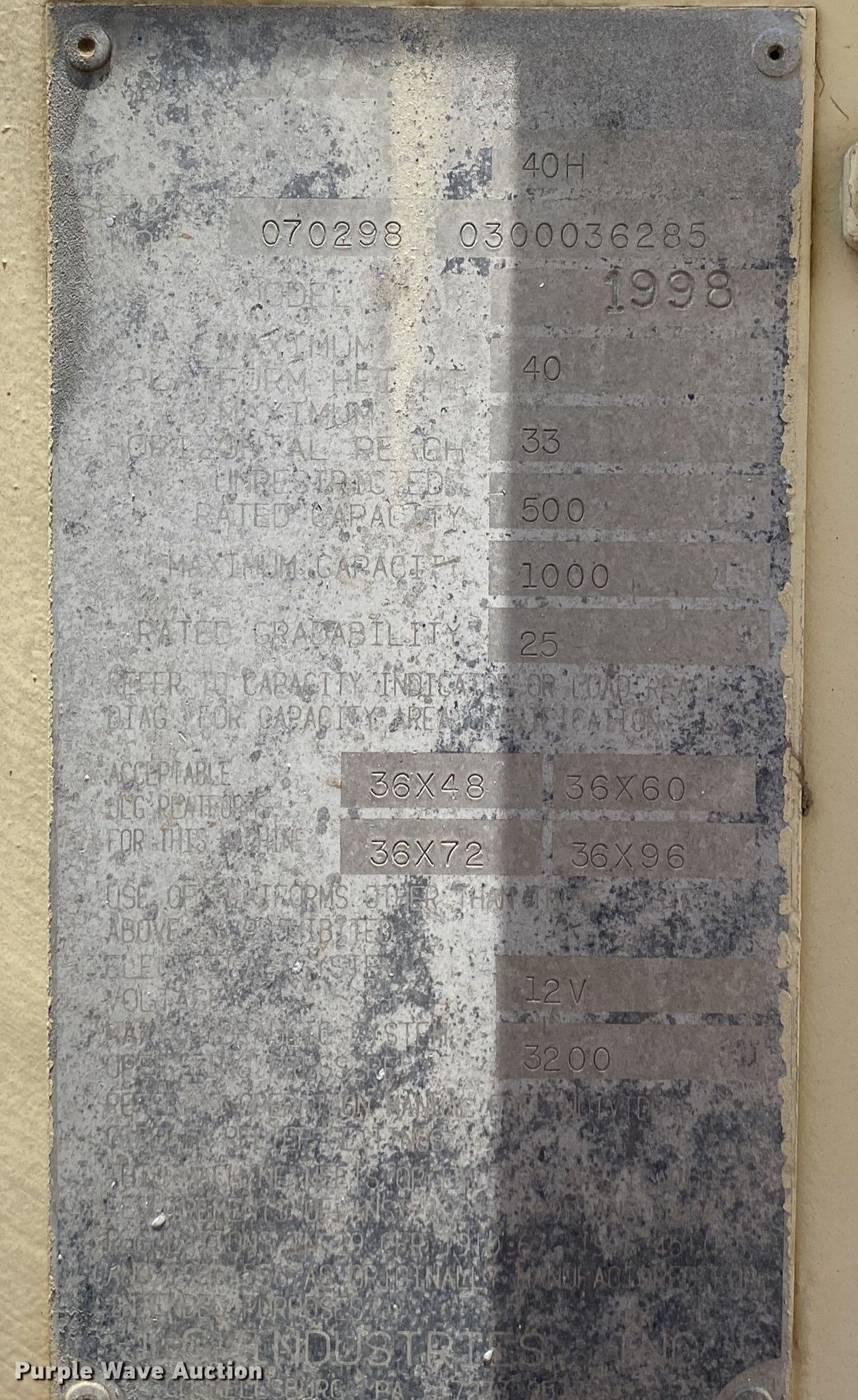 1998 JLG 40H boom lift. Hours: 6,120 on meter, Serial: 0300036285. Engine Cylinders: 4, Fuel type: Gas. Features Rough terrain, Maximum lift capacity: 500 lbs, Maximum reach length: 58', Maximum lift height: 33', Platform: 36" L x 48" W, AC power outlet, Controls: Platform, Ground. Tires Tire size: 12.5L-15. Notes Possible tire inflation issue. Coweta, OK 74429