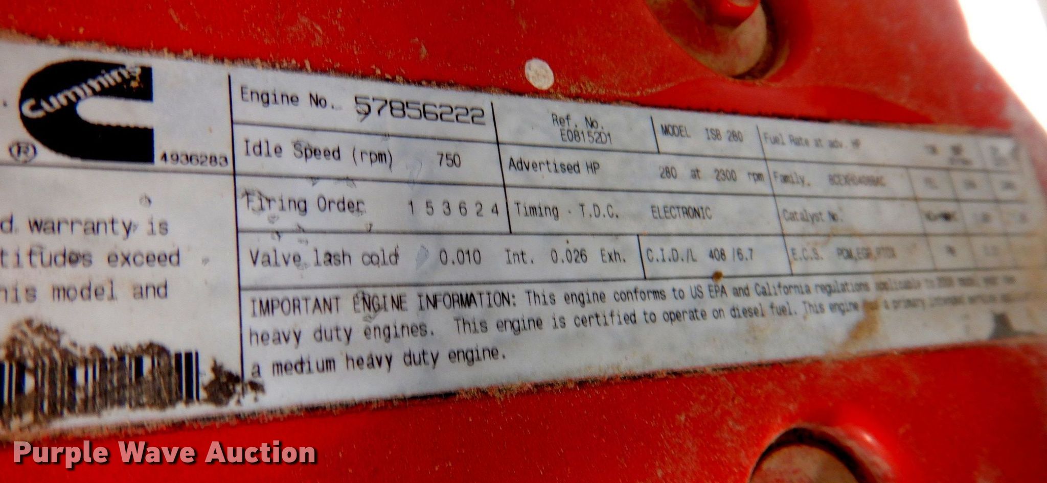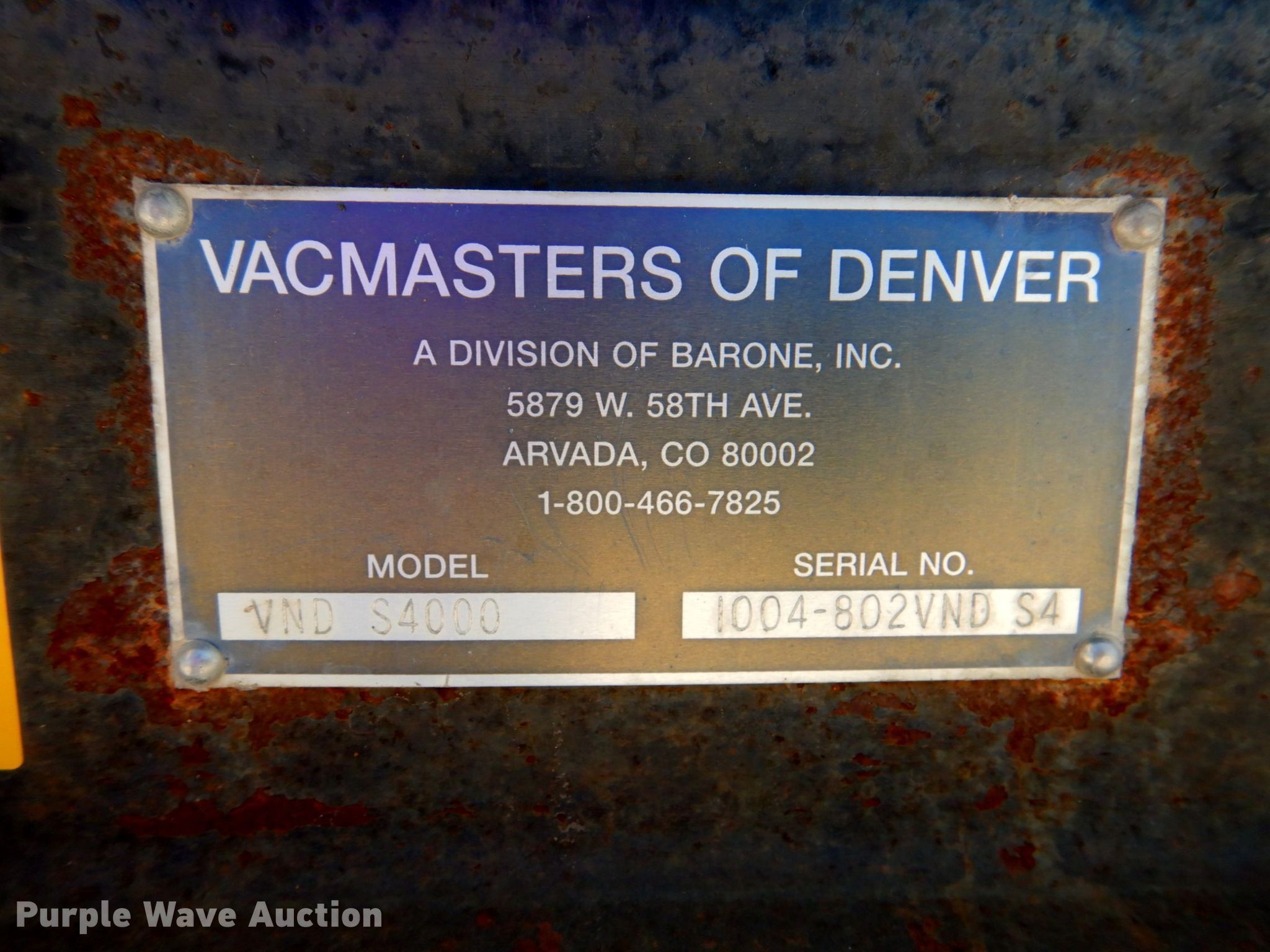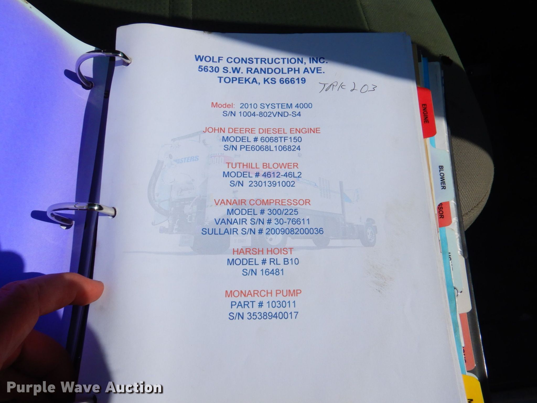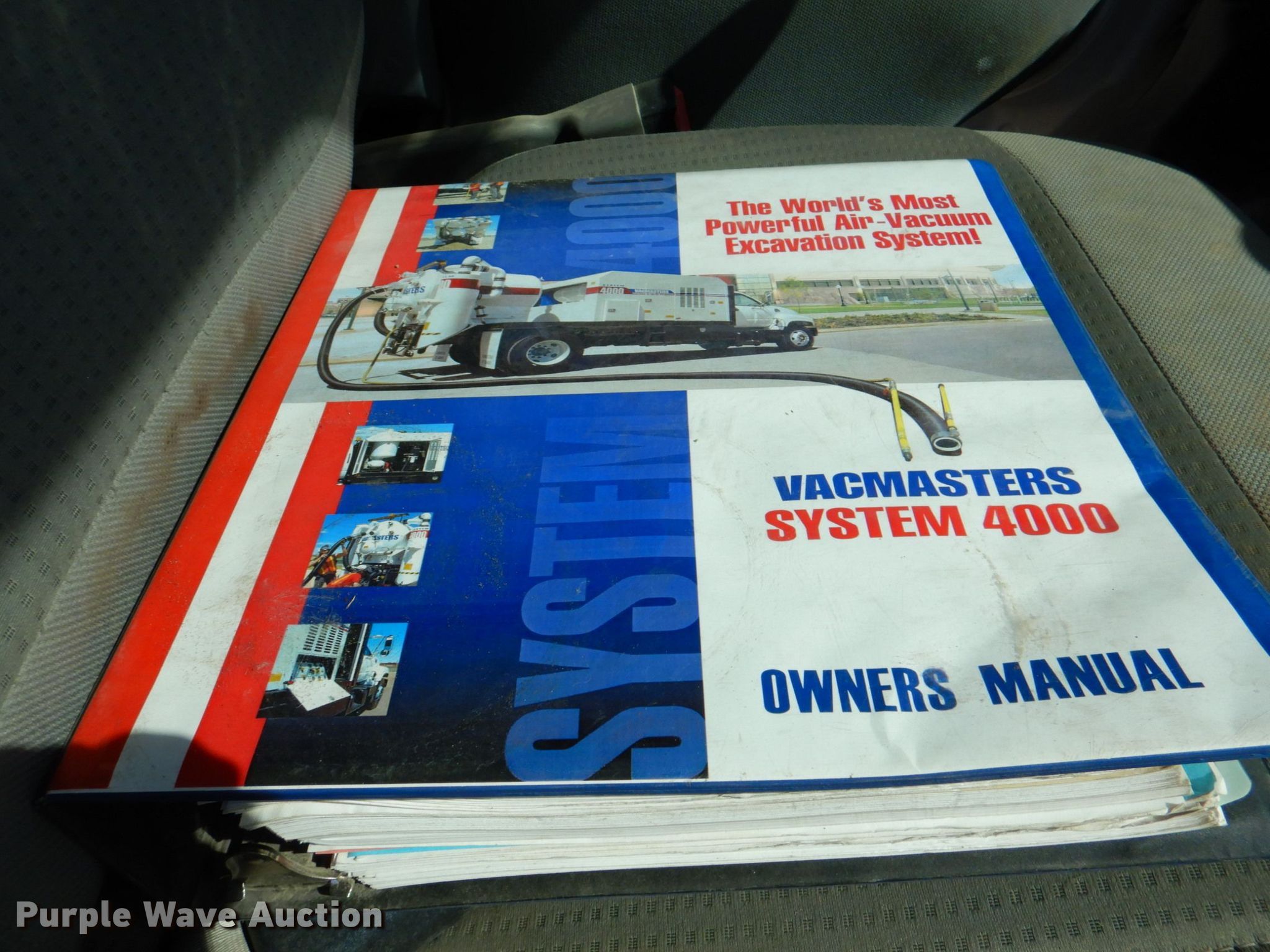 2009 Ford F750 Super Duty vacuum truck. Miles: 102,993 on odometer, VIN: 3FRXF75E79V135719. Engine Cummins ISB, Displacement: 6.7L, Cylinders: 6, Fuel type: Diesel, HP: 280, Engine brake. Transmission Manual, Speed: 7. Chassis Axles: Single, Suspension: Spring, Brakes: Air, GVWR: 33,000 lbs. Interior AC, Heat, Cruise control. Features Tank bed 2010 Vacmasters VND S4000, Serial: 1004-802VND S4, Rear manway, Rear outlet: 3", Engine John Deere 6068, Displacement: 6.8L, Cylinders: 6, Fuel type: Diesel, HP: 150, Hours: 4,516, Water pump GP TX1510, Vacuum pump Tuthill 4612-46L2, Vanair 300/225 compressor, Poly tank Capacity: 100 gallons. Tires Size: 11R22.5. Notes Non-operational tachometer. Kansas title. Drisco. 33130 Lone Star Road. Paola, KS 66071