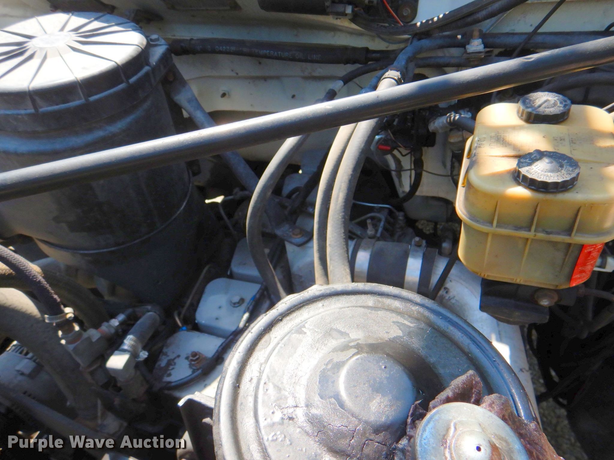 1992 Ford F700 flatbed truck. Miles: 180,113 on odometer, VIN: 1FDPK74C5NVA34821. Engine Cummins, Displacement: 5.9L, Cylinders: 6, Fuel type: Diesel, HP: 190. Transmission Manual, Speed: 6, plus 2. Chassis Axles: Single, Suspension: Spring, Brakes: Hydraulic, PTO, GVWR: 30,000 lbs. Interior Heat. Features Flatbed 25' L x 96" W, Clearfield 34' L shingle conveyor. Tires Size: 11R22.5. Kansas title. Mesler Roofing and Exteriors. 1628 U.S. 40. Lawrence, KS 66044