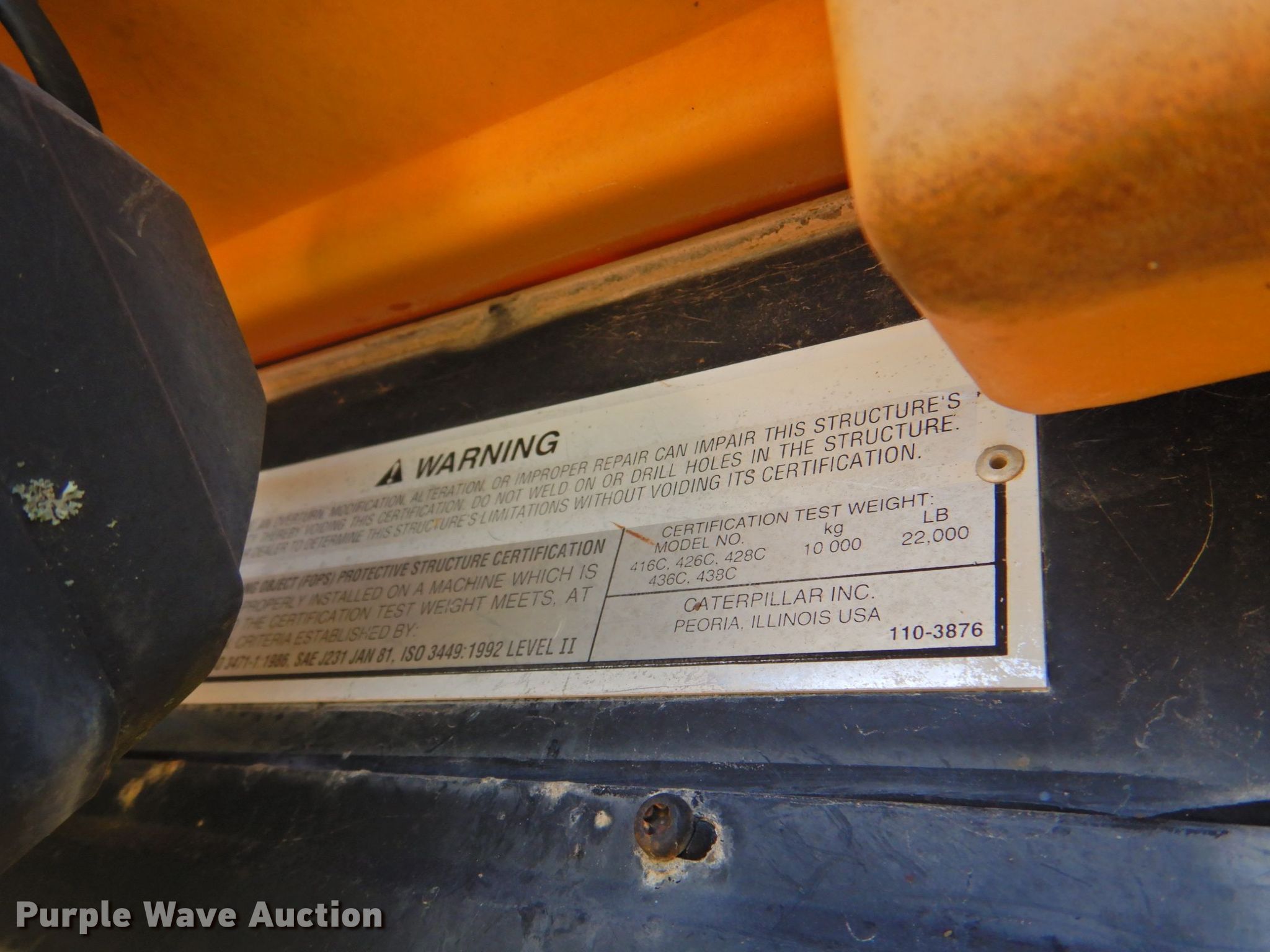 2000 Caterpillar 416C backhoe. Hours: 11,549 on meter, Serial: 4ZN21836. Engine Caterpillar, Cylinders: 4, Fuel type: Diesel. Transmission Shuttle shift, 4F - 4R. Chassis Four wheel drive, Differential lock. Operators station EROPS, AC, Heat, Backhoe controls: Wobble stick / two stick. Features Loader Bucket Caterpillar, Width: 88", Cutting edge: Bolt-on, Backhoe Extendable stick, Bucket Width: 18", Teeth: 4, Bucket Width: 12", Teeth: 3, Bucket Width: 24", Teeth: 5, Bucket Width: 36", Teeth: 7.. Tires Front: 12.5/80-18, Rear: 19.5-24. Notes Glass cracked. Sundowner Backhoe. Baldwin City, KS 66006